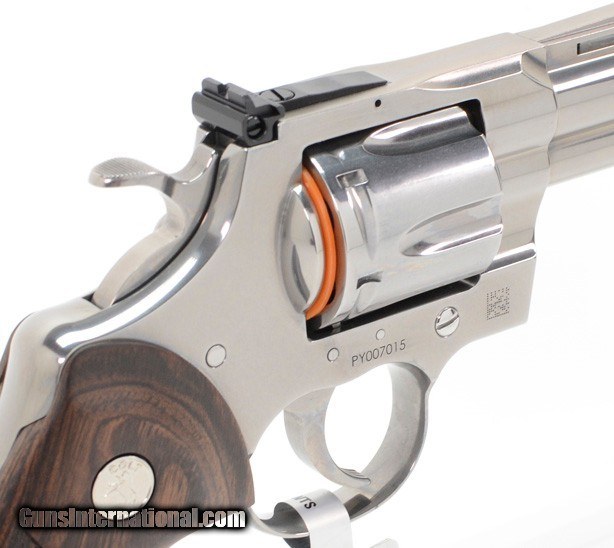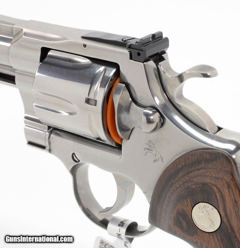 Description: BRAND NEW 2020 Colt Python .357 Mag SP4WTS 4.25 Inch. In Blue Hard Case AVAILABLE FOR PURCHASE AT OUR ON-LINE STORE We are proud to offer a selection of the NEW 2020 Colt Python. In Stock! The Python is back. Building on Colt’s Snake Gun legacy, the legendary double-action revolver returns in stainless steel in 4.25” and 6” barrel lengths. The 2020 Python features modern stainless steel alloys and a re-designed rear sight. Thirty percent more steel beneath the rear adjustable target sight gives you a stronger revolver and more robust shooting experience. A recessed target crown, user-interchangeable front sight, and Walnut grip with the iconic Colt medallion make this a gun you’ll want to shoot AND show off. The Python is chambered in .357 Magnum and also accommodates 38 Special cartridges. The Serial Number of the revolver is PY019970. The photos in this ad are stock and thus the serial number on it does not reflect the one on the revolver you will be receiving. SPECIFICATIONS