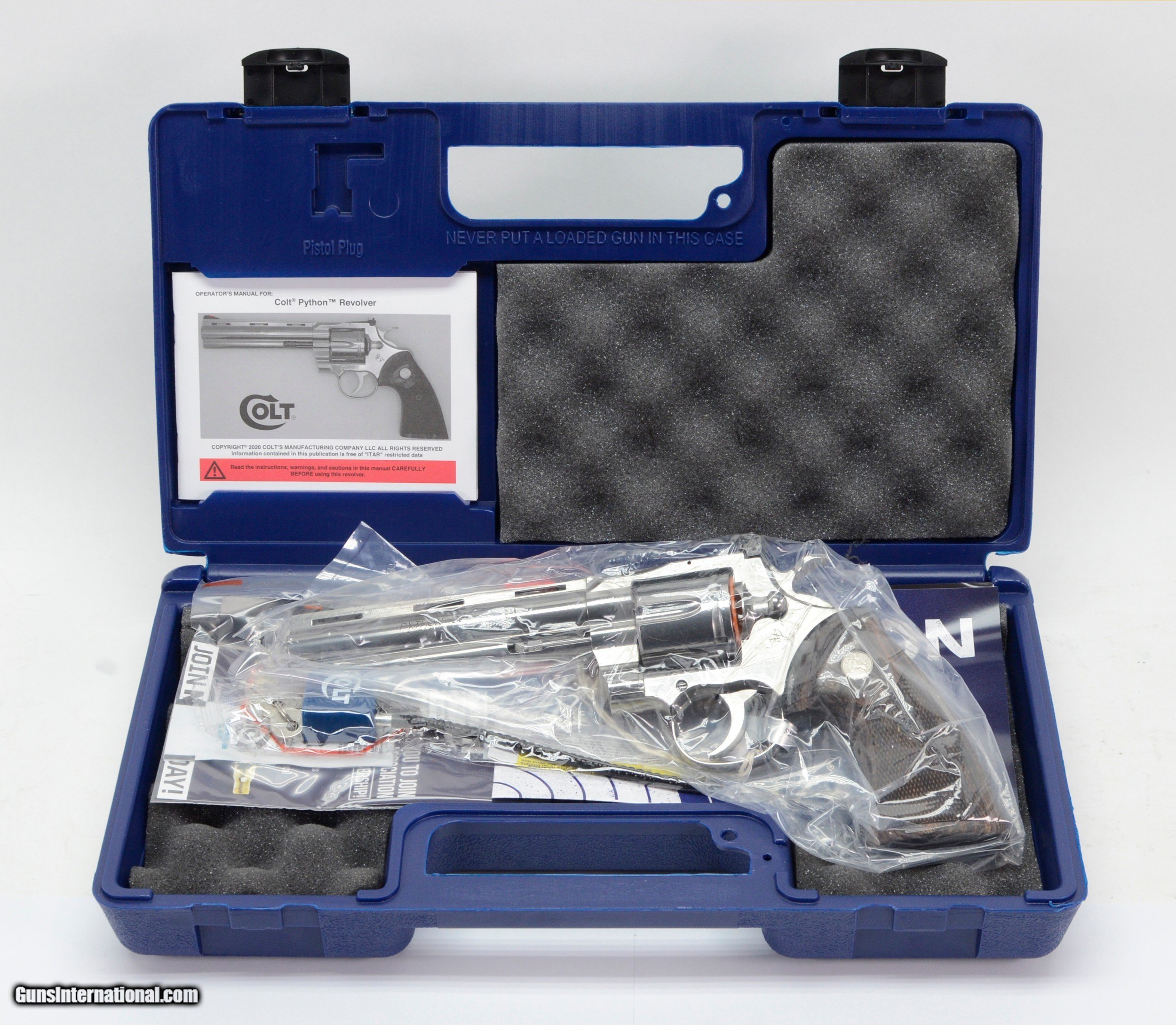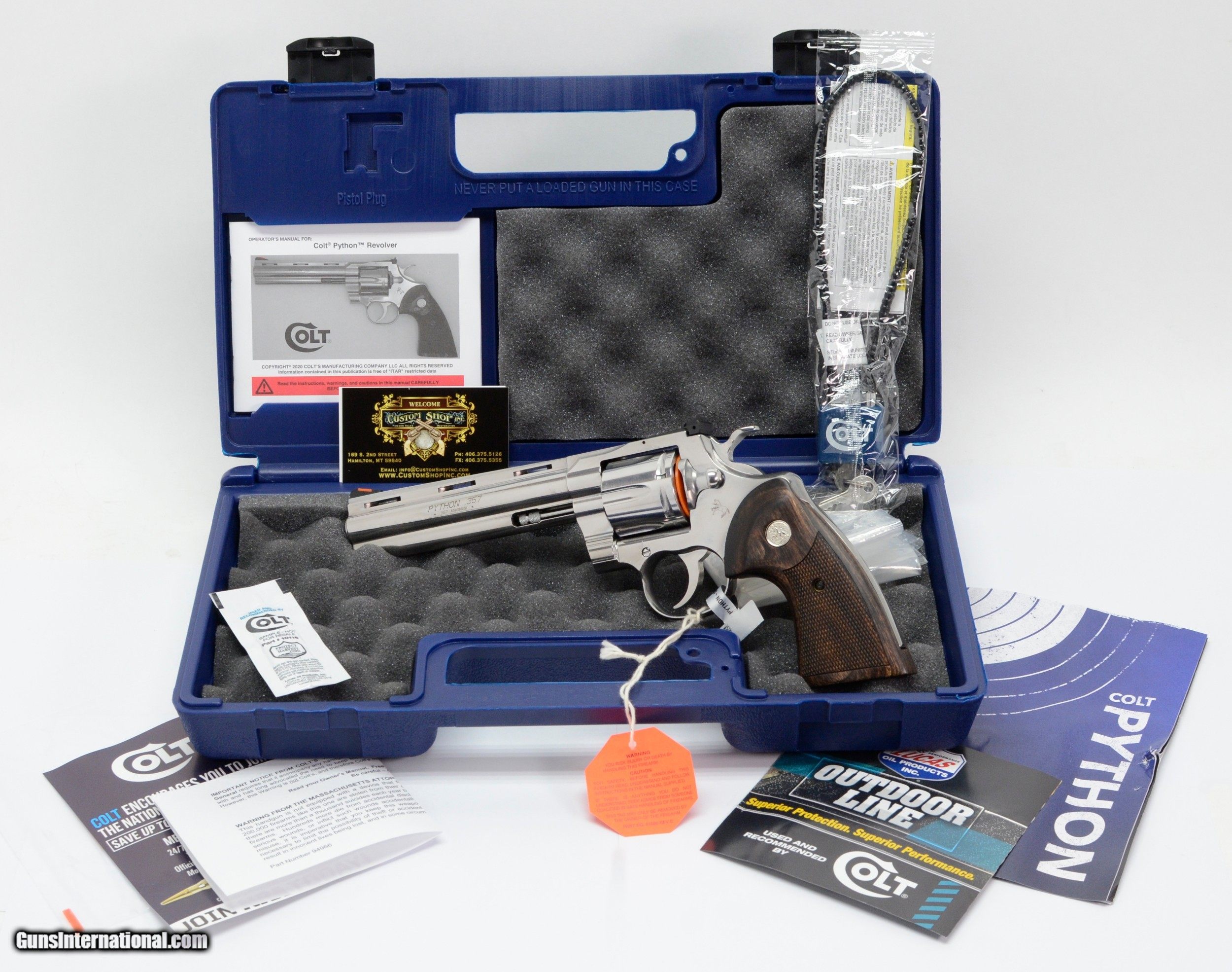 Description: BRAND NEW 2020 Colt Python .357 Mag SP6WTS 6 Inch. In Blue Hard Case AVAILABLE FOR PURCHASE AT OUR ON-LINE STORE We are proud to offer a selection of the NEW 2020 Colt Python. In Stock! The Python is back! Building on Colt’s Snake Gun legacy, the legendary double-action revolver returns in stainless steel in 4.25” and 6” barrel lengths. The 2020 Python features modern stainless steel alloys and a re-designed rear sight. Thirty percent more steel beneath the rear adjustable target sight gives you a stronger revolver and more robust shooting experience. A recessed target crown, user-interchangeable front sight, and Walnut grip with the iconic Colt medallion make this a gun you’ll want to shoot AND show off! The photos in this ad may be stock and thus the serial number on the firearm may not reflect the one on the revolver you will be receiving. The Serial Number for this revolver is, PY219406