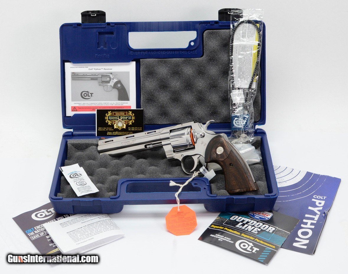 Description: BRAND NEW 2020 Colt Python .357 Mag SP6WTS 6 Inch. In Blue Hard Case AVAILABLE FOR PURCHASE AT OUR ON-LINE STORE We are proud to offer a selection of the NEW 2020 Colt Python. In Stock! The Python is back! Building on Colt’s Snake Gun legacy, the legendary double-action revolver returns in stainless steel in 4.25” and 6” barrel lengths. The 2020 Python features modern stainless steel alloys and a re-designed rear sight. Thirty percent more steel beneath the rear adjustable target sight gives you a stronger revolver and more robust shooting experience. A recessed target crown, user-interchangeable front sight, and Walnut grip with the iconic Colt medallion make this a gun you’ll want to shoot AND show off! The photos in this ad may be stock and thus the serial number on the firearm may not reflect the one on the revolver you will be receiving. The Serial Number for this revolver is, PY219517