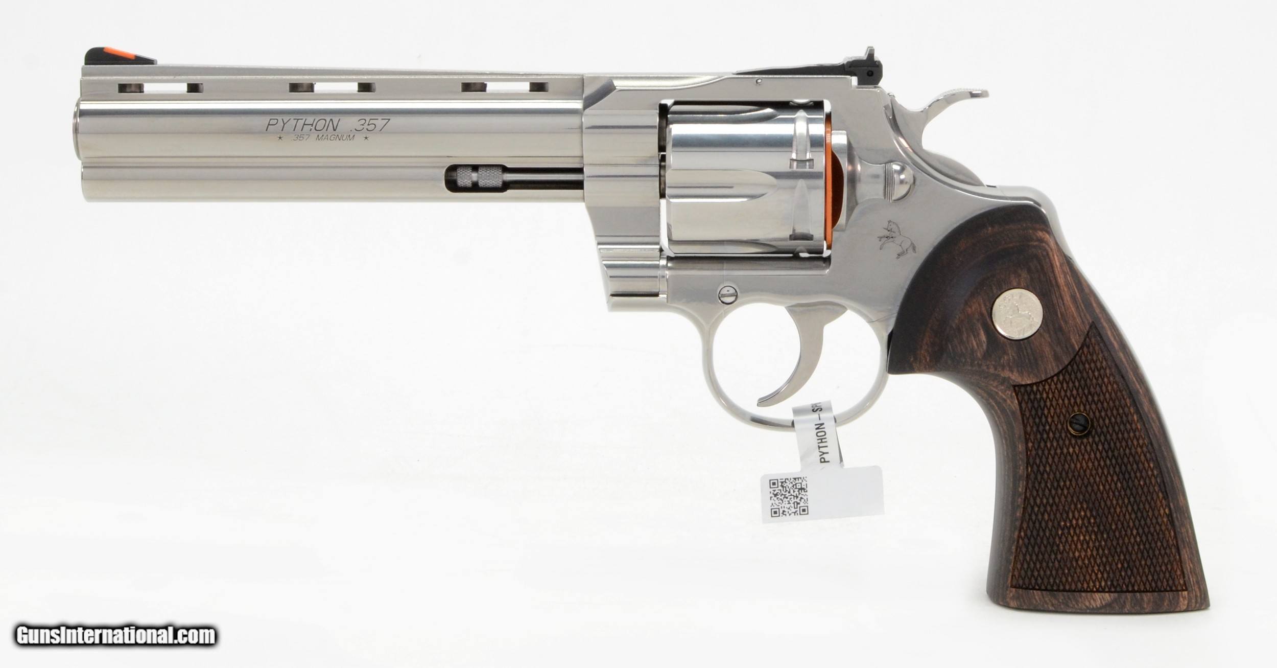 Description: BRAND NEW 2020 Colt Python .357 Mag SP6WTS 6 Inch. In Blue Hard Case AVAILABLE FOR PURCHASE AT OUR ON-LINE STORE We are proud to offer a selection of the NEW 2020 Colt Python. In Stock! The Python is back! Building on Colt’s Snake Gun legacy, the legendary double-action revolver returns in stainless steel in 4.25” and 6” barrel lengths. The 2020 Python features modern stainless steel alloys and a re-designed rear sight. Thirty percent more steel beneath the rear adjustable target sight gives you a stronger revolver and more robust shooting experience. A recessed target crown, user-interchangeable front sight, and Walnut grip with the iconic Colt medallion make this a gun you’ll want to shoot AND show off! The photos in this ad may be stock and thus the serial number on the firearm may not reflect the one on the revolver you will be receiving. The Serial Number for this revolver is, PY239290