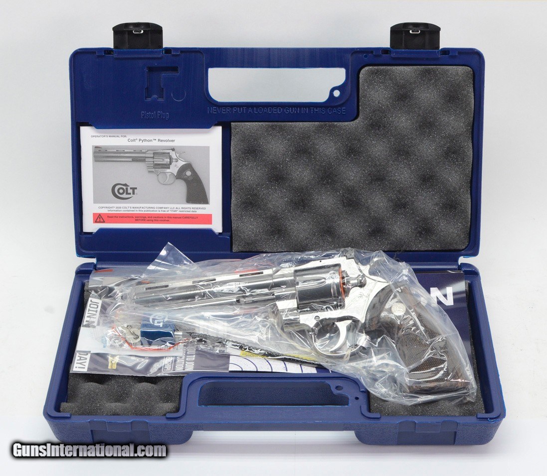 Description: BRAND NEW 2020 Colt Python .357 Mag SP6WTS 6 Inch. In Blue Hard Case We are proud to offer a selection of the NEW 2020 Colt Python. In Stock! The Python is back! Building on Colt’s Snake Gun legacy, the legendary double-action revolver returns in stainless steel in 4.25” and 6” barrel lengths. The 2020 Python features modern stainless steel alloys and a re-designed rear sight. Thirty percent more steel beneath the rear adjustable target sight gives you a stronger revolver and more robust shooting experience. A recessed target crown, user-interchangeable front sight, and Walnut grip with the iconic Colt medallion make this a gun you’ll want to shoot AND show off! The Serial Number of the revolver is PY016753. The photos in this ad are stock and thus the serial number on it does not reflect the one on the revolver you will be receiving. SPECIFICATIONS