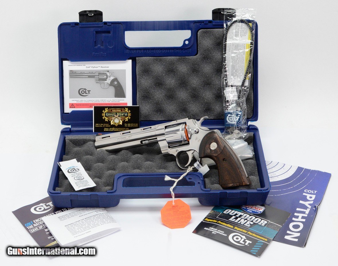 Description: BRAND NEW 2020 Colt Python .357 Mag SP6WTS 6 Inch. In Blue Hard Case AVAILABLE FOR PURCHASE AT OUR ON-LINE STORE We are proud to offer a selection of the NEW 2020 Colt Python. In Stock! The Python is back! Building on Colt’s Snake Gun legacy, the legendary double-action revolver returns in stainless steel in 4.25” and 6” barrel lengths. The 2020 Python features modern stainless steel alloys and a re-designed rear sight. Thirty percent more steel beneath the rear adjustable target sight gives you a stronger revolver and more robust shooting experience. A recessed target crown, user-interchangeable front sight, and Walnut grip with the iconic Colt medallion make this a gun you’ll want to shoot AND show off! The Serial Number of the revolver is PY008671. The photo in this ad is stock and thus the serial number on it does not reflect the one on the revolver you will be receiving. SPECIFICATIONS