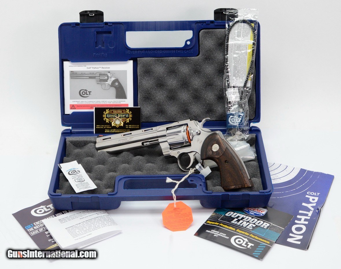 Description: BRAND NEW Colt Python .357 Mag SP6WTS 6 Inch. In Blue Hard Case AVAILABLE FOR PURCHASE AT OUR ON-LINE STORE We are proud to offer a selection of the New Production Colt Python. In Stock! The Python is back! Building on Colt’s Snake Gun legacy, the legendary double-action revolver returns in stainless steel in 4.25” and 6” barrel lengths. The New Production Python features modern stainless steel alloys and a re-designed rear sight. Thirty percent more steel beneath the rear adjustable target sight gives you a stronger revolver and more robust shooting experience. A recessed target crown, user-interchangeable front sight, and Walnut grip with the iconic Colt medallion make this a gun you’ll want to shoot AND show off! The photos in this ad may be stock and thus the serial number on the firearm may not reflect the one on the revolver you will be receiving. The Serial Number for this revolver is, PY257258