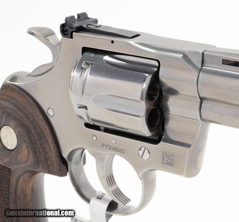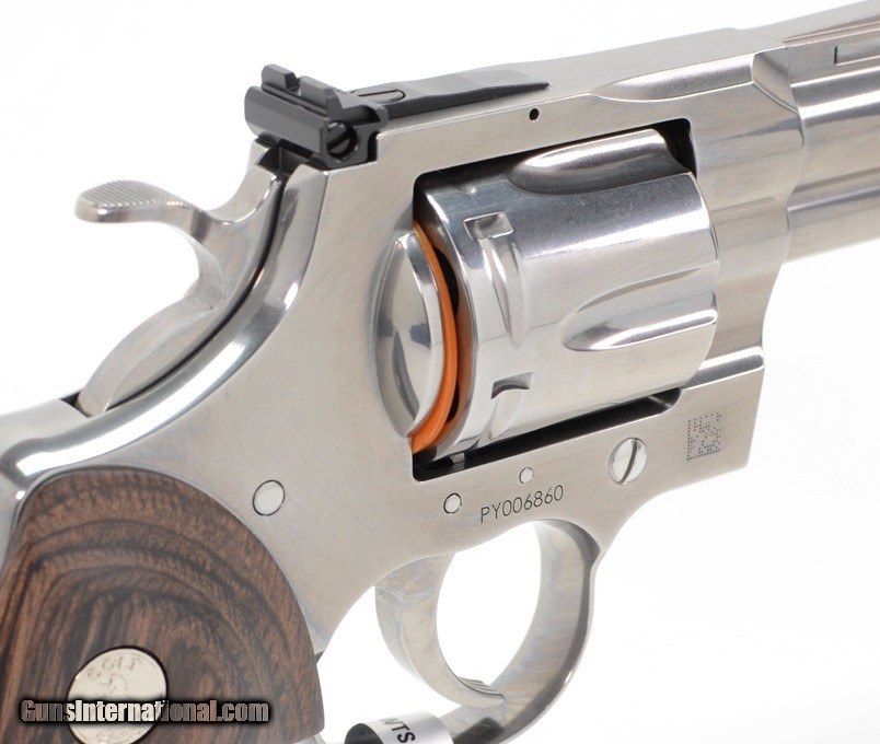 Description: Brand New, New Production Colt Python .357 Mag SP4WTS 4.25 Inch. In Blue Hard Case AVAILABLE FOR PURCHASE AT OUR ON-LINE STORE The New Production Colt Python features modern stainless steel alloys and a re-designed rear sight. Thirty percent more steel beneath the rear adjustable target sight gives you a stronger revolver and more robust shooting experience. A recessed target crown, user-interchangeable front sight, and Walnut grip with the iconic Colt medallion make this a gun you’ll want to shoot AND show off. The Python is chambered in .357 Magnum and also accommodates 38 Special cartridges.. The Serial Number of the revolver is PY246700. The photos in this ad are stock and thus the serial number on it does not reflect the one on the revolver you will be receiving. SPECIFICATIONS