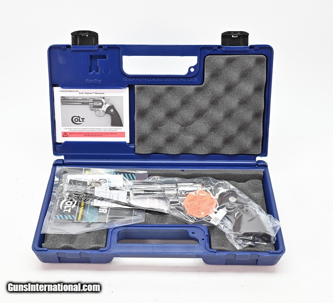 Description: Brand New Production Colt Python .357 Mag SP3WTS 3 Inch. In Blue Hard Case. NEW LOW PRICE! AVAILABLE FOR PURCHASE AT OUR ON-LINE STORE We are proud to offer a selection of the NEW Production Colt Python. In Stock! The Python is back! Building on Colt’s Snake Gun legacy, the legendary double-action revolver returns in stainless steel in 3", 4.25” and 6” barrel lengths. The New Production Python features modern stainless steel alloys and a re-designed rear sight. Thirty percent more steel beneath the rear adjustable target sight gives you a stronger revolver and more robust shooting experience. A recessed target crown, user-interchangeable front sight, and Walnut grip with the iconic Colt medallion make this a gun you’ll want to shoot AND show off! The photos in this ad may be stock and thus the serial number on the firearm may not reflect the one on the revolver you will be receiving. The Serial Number for this revolver is, PY248714