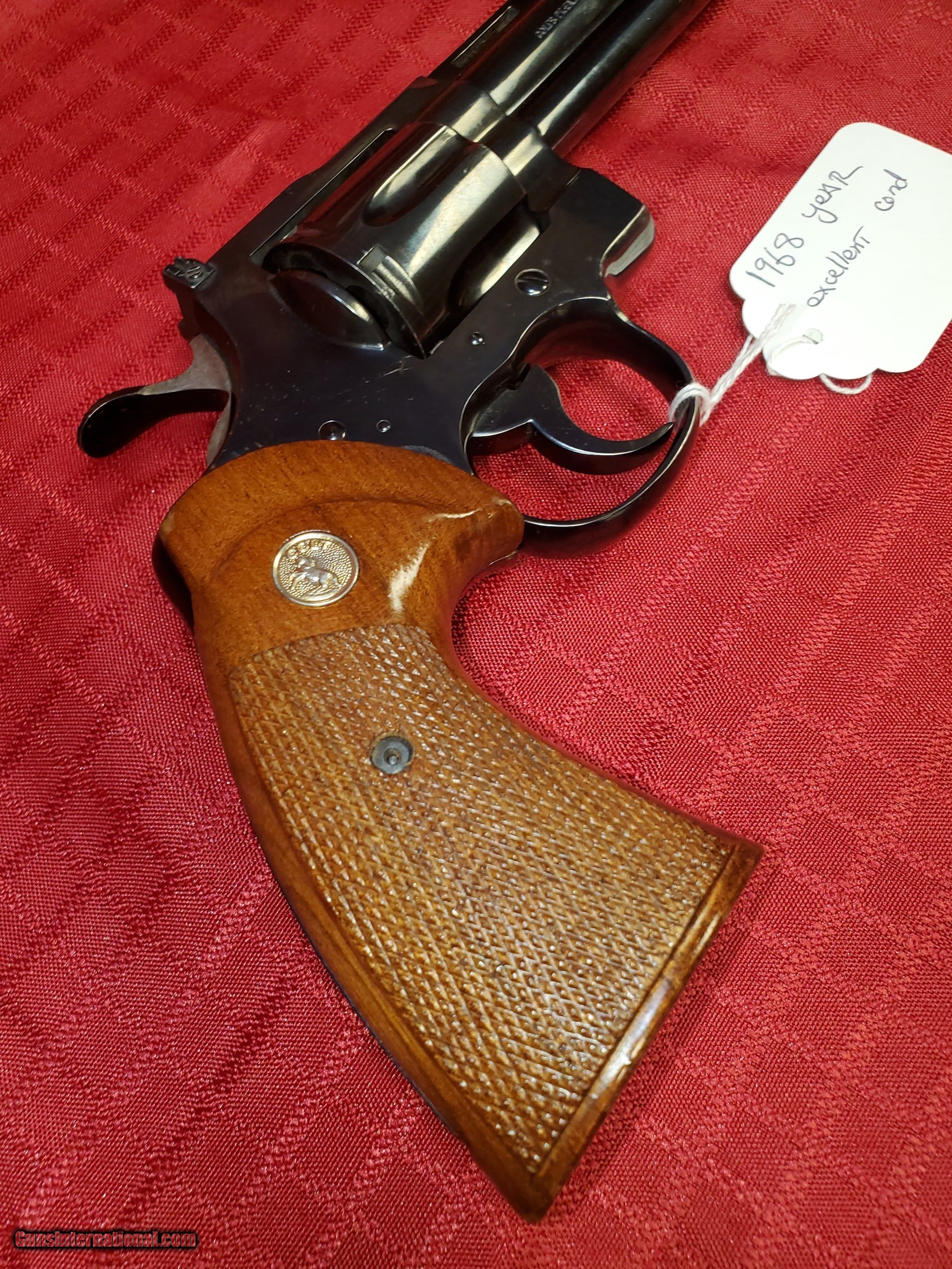 Description: Guns Listing ID: 1081051 Up for sale is a BEAUTIFUL 1968 COLT PYTHON chambered in .357 magnum. It features original COLT medallion wooden grips. The iconic vent rib extends the length of the 6\" barrel. Please note in pictures that there is a small scratch on the right side between the top of the grip & the cylinder. Other than that is in fabulous condition. Please see all pictures.. Sights: Front - Ramp style - red highlighted / Rear - adjustable Weight: 46oz Overall Length: 11.5\" Barrel Length: 6\" SERIAL NUMBER: K30492 SKU NUMBER: DJ1017423 SOLD Manufacturer: COLT Model: 1968 PYTHON Caliber Info: .357 MAG Condition: Used - Non-Certified Barrels: 6 BARREL Finish: BLUED |