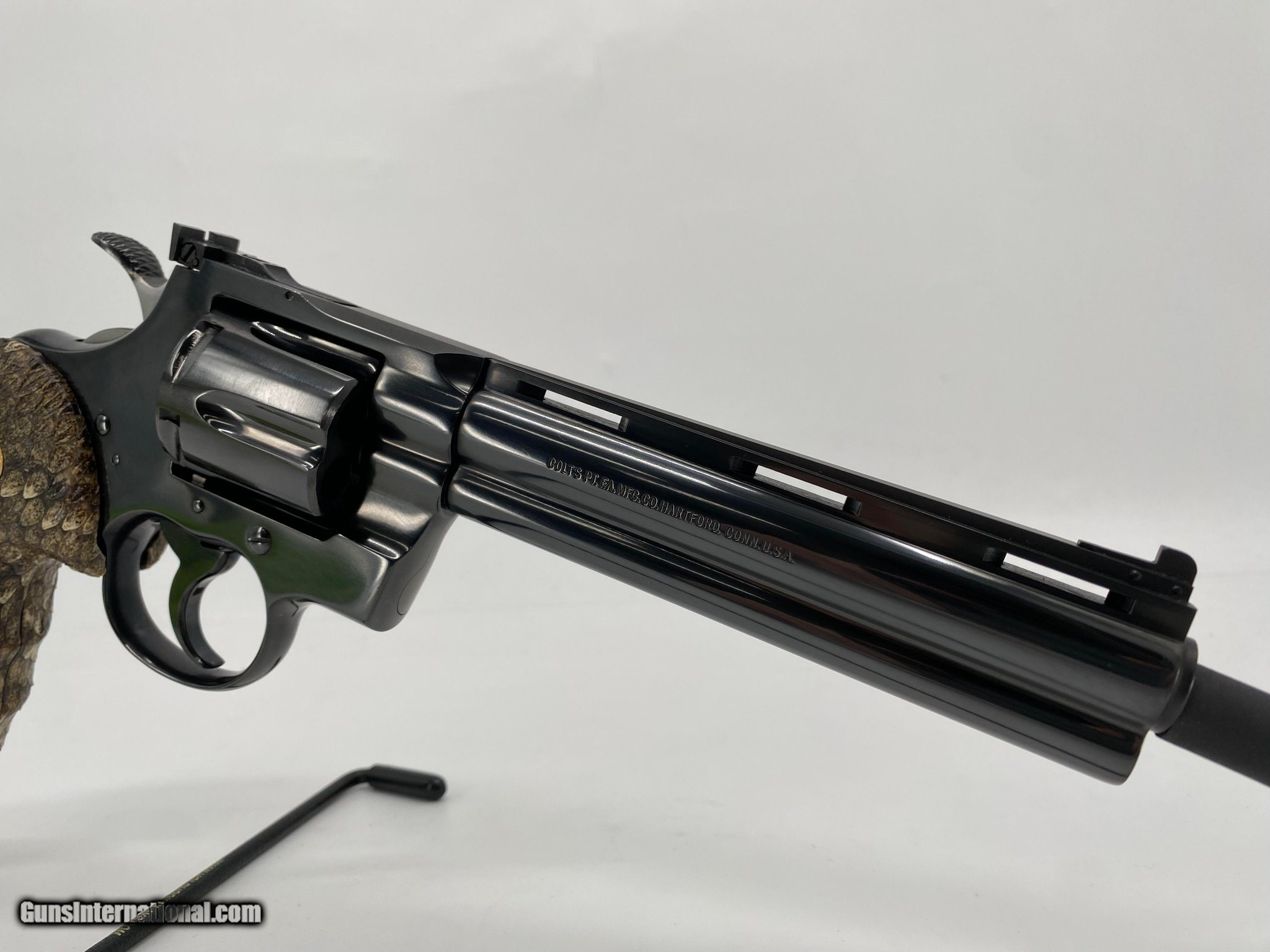Description: Guns Listing ID: 1180021 Colt Python .357 magnum 6 shot vent rib 6\" barrel revolver 1974; factory box Gun was re-blued and comes with a numbers matching Colt factory box and all Original paperwork. 100% Real authentic rattle snake skin grips sets this Python Over the TOP! Original 100% condition original wooden grips with Silver Medallion in box. SOLD Manufacturer: COLT Model: 1974 PYTHON Caliber Info: .357 MAG Condition: Used - Non-Certified Barrels: 6 BARREL Finish: BLUED |
