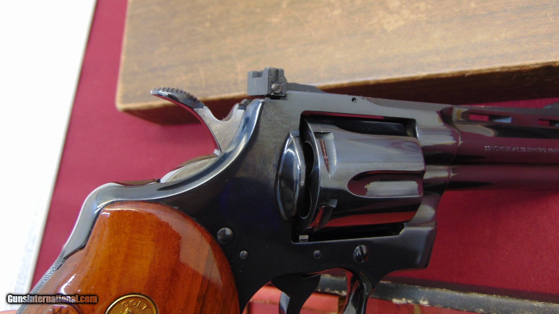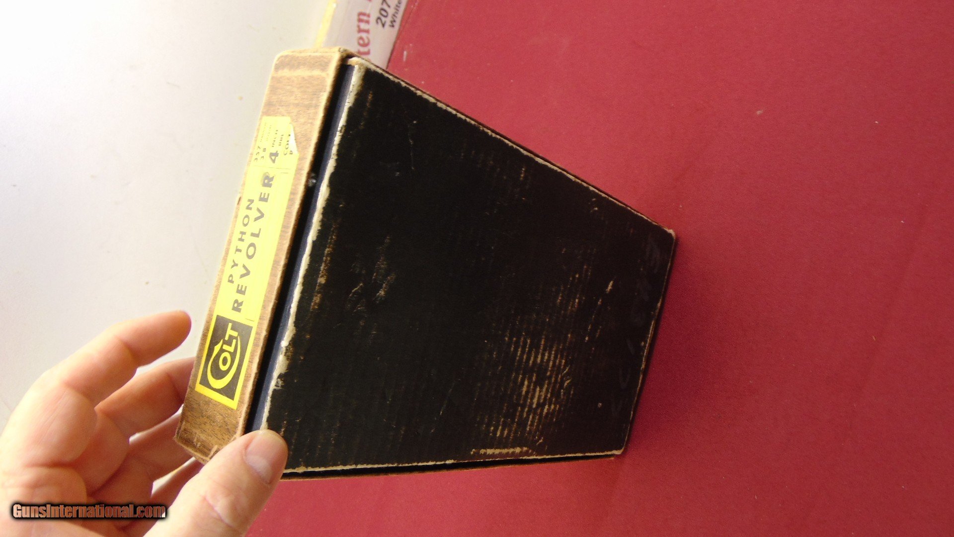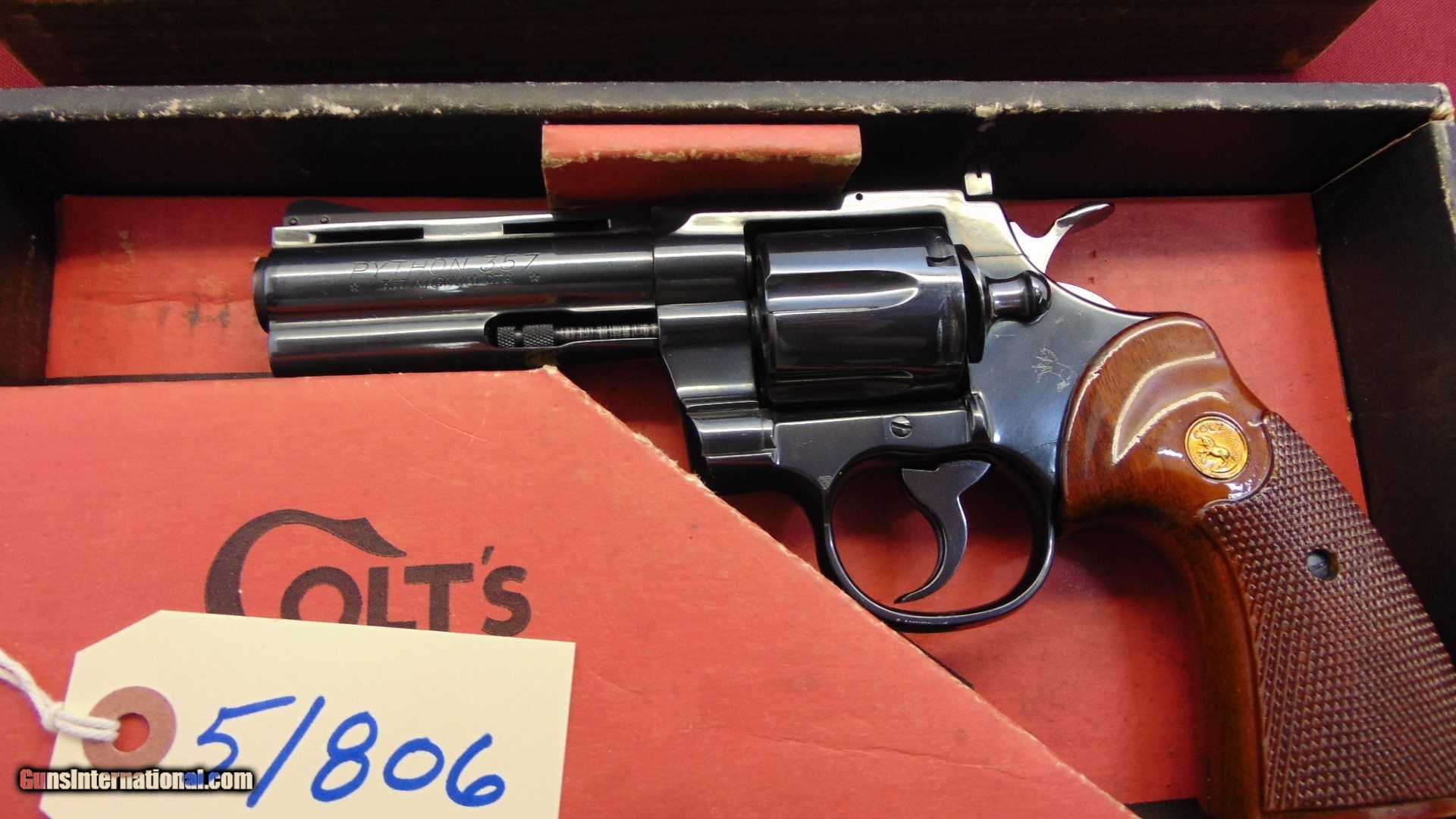 Description: COLT 4" PYTHON REVOLVER MADE 1972 WITH BOX 357 MAGNUM - NICE GUN COLT PYTHON REVOLVER SER# E43177 MADE IN 1972. 4 INCH BARREL , CALIBER 357 MAGNUM. GREAT GUN WITH EXCELLENT ORIGINAL BLUE FINISH . CORRECT ORIGINAL GRIPS WITH A LITTLE VARNISH FLAKING ON THE BUTT. TIGHT ACTION THAT FUNCTIONS FINE. THIS GUN LOOKS TO HAVE BEEN FIRED VERY VERY LITTLE. COMES WITH WHAT APPEARS TO BE THE ORIGINAL BOX. ADD 35.00 UPS 2ND DAY AIR SHIPPING EASTERN BRANCH FIREARMS Questions e-mail or call Glen at Eastern Branch Firearms 207-215-5021 Fax number 207-588-7605 TERMS – PLEASE READ BEFORE I DO NOT HAVE A LAYAWAY OPTION ( I DO ACCEPT CREDIT CARDS ) -- I GET ALOT OF REQUEST FOR TRADES, I WOULD PERFER NOT TO DO TRADES ON MY INTERNET LISTINGS. LEGAL REQUIREMENT- Modern firearms must be transferred through a licensed FFL dealer in your area. to supply a signed copy of local dealer’s license before shipment will be made. A C&R License is acceptable for C&R firearms only (guns determined to be C&R’s by ATF and guns known to be at least 50 years old). California law will NOT allow shipment of C&R handguns direct to a C&R holder in the State of California, a 01 FFL LIC. dealer must be used. Antique firearms require to supply proof of age. Some areas still require an FFL transfer for antique & black powder firearms (New Jersey, NYC, etc.) Large capacity magazine restrictions: New Jersey - 15 round maximum for semi-automatic firearms only. California - 10 round maximum for all magazines. Maryland - 20 round maximum for all magazines. Massachusetts - over 10 rounds. Hawaii - 10 round maximum for all handgun magazines. PAYMENT OPTIONS- We accept money orders, cashier’s checks , bank checks. sorry no personal checks. We accept all major credit cards please add 3% to the ’s cash discount price.(Maine Residents to pay 5% sales tax) .Handguns and long guns do need to be shipped separate. PLEASE do not send payment via FED EX . USPS & UPS are fine. Thank you. We include a signed copy of our FFL with each firearm shipped. AMMO •WARNING: Buyer must be over the age of 21 with proof of age to purchase. All state, local and federal laws apply. Please do notif you are prohibited from buying this item in your area. No ammunition will ship to prohibited areas such as the cities of Los Angeles, Oakland and San Francisco. No Shipments to Massachusetts, New York City or Washington D.C. No Shipments to Chicago, IL residents must provide a FOID card. We cannot ship to Alaska or Hawaii. If you are a resident of one of these areas please do not bid. Thank you. SAFTY NOTICE- Buyer is solely responsible for determining that a used gun is safe to shoot. The firearms offered have not been test fired but have been given a visual inspection only for purposes. It is a requirement that every used firearm is inspected by a qualified gunsmith before firing. By , the buyer agrees to hold seller harmless against damages, injury, or death caused by defective merchandise. RETURN POLICY- All firearms come with a 3-day non firing , non messing with ( turning srews ,taking apart,removing parts, scoping. firing, cleaning or messing with in anyway) inspection/return privilege.Inspection is based on a visual review of the gun to confirm the gun is in the condition stated. In the case of a return, buyer pays all shipping charges & if paid for with a credit card buyer absorbs the 3% credit card charges . So please ask questions BEFORE you bid. Thanks for Looking and Good Luck!! U.S. sales only, no exports…this includes antiques. I will ship to third party for exporting- SOLD |