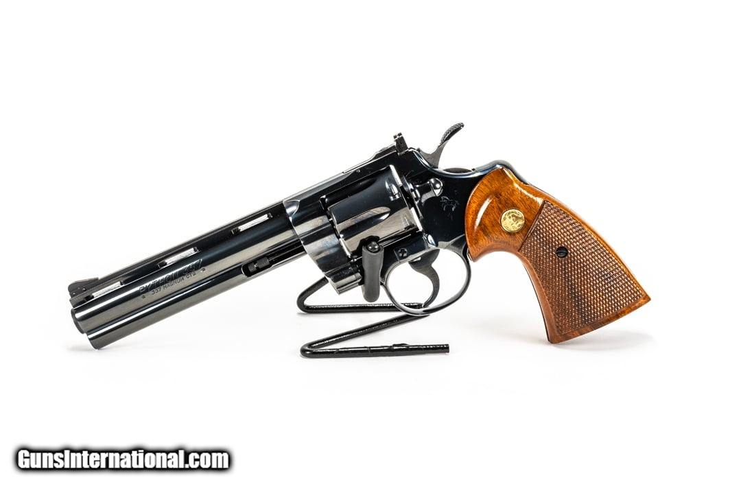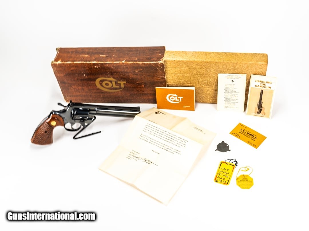 Description: Guns Listing ID: 1282747 This is your chance to own a collector grade Colt! Absolutely beautiful condition and only the faintest of turn lines on the cylinder; we believe this revolver has been unfired since the factory Manufacturer: Colt Model: Python 357 Condition: Excellent, like new in box! Caliber: .357 Magnum Action: DA/SA Barrel Length: 6 inch Capacity: 6 Shot Features: Vent rib barrel, wood Colt grips, royal blue finish, Mfd. 1975 Inventory: Firearm, box, original paperwork/documents • Please be aware that we have not test fired this gun. Unless otherwise stated, expect this firearm to fire and function safely. SOLD Manufacturer: COLT Model: Collectors Grade 1975 Python Revolver in Royal Blue, Box Included! Caliber Info: .357 MAG Condition: Used - Non-Certified Barrels: 6 BARREL Finish: BLUED |