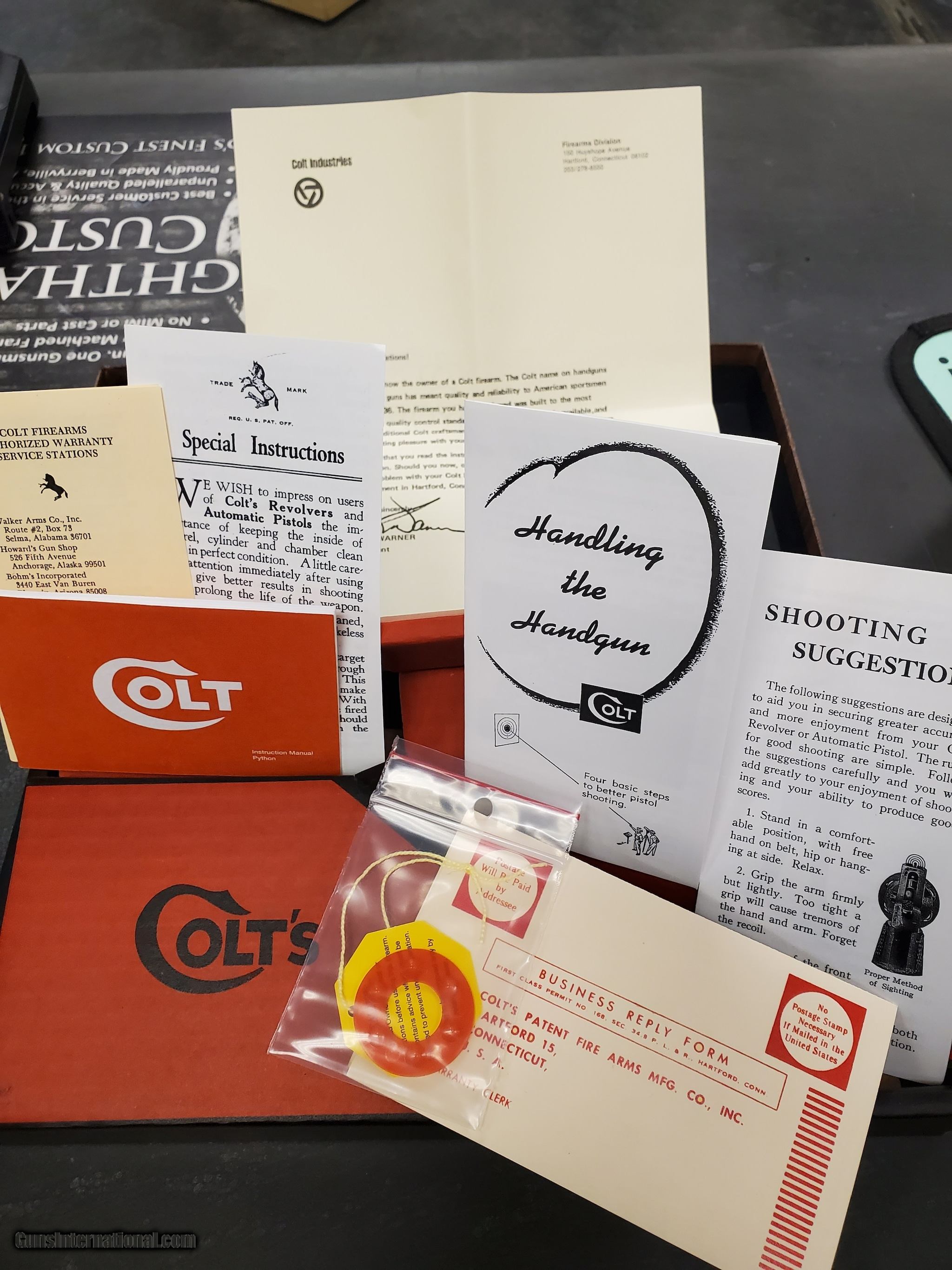 Description: Guns Listing ID: 489852 NEVER FIRED BRAND NEW IN BOX 1969 COLT PYTHON ALL ORIGINAL PAPERWORK AND BOX SOLD Manufacturer: COLT Model: COLT PYTHON 357 MAG/ 38 SP Caliber Info: .357 MAG Condition: Used - Non-Certified Barrels: 6 BARREL Finish: BLUED |
