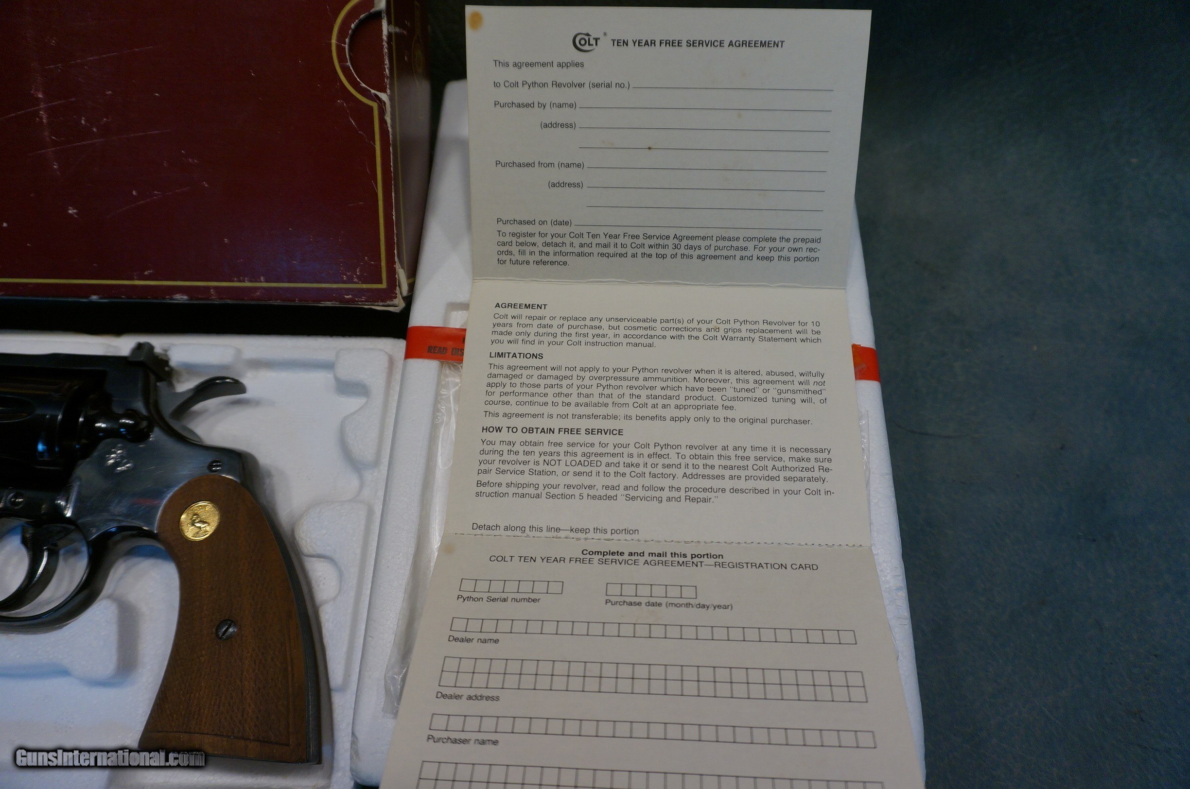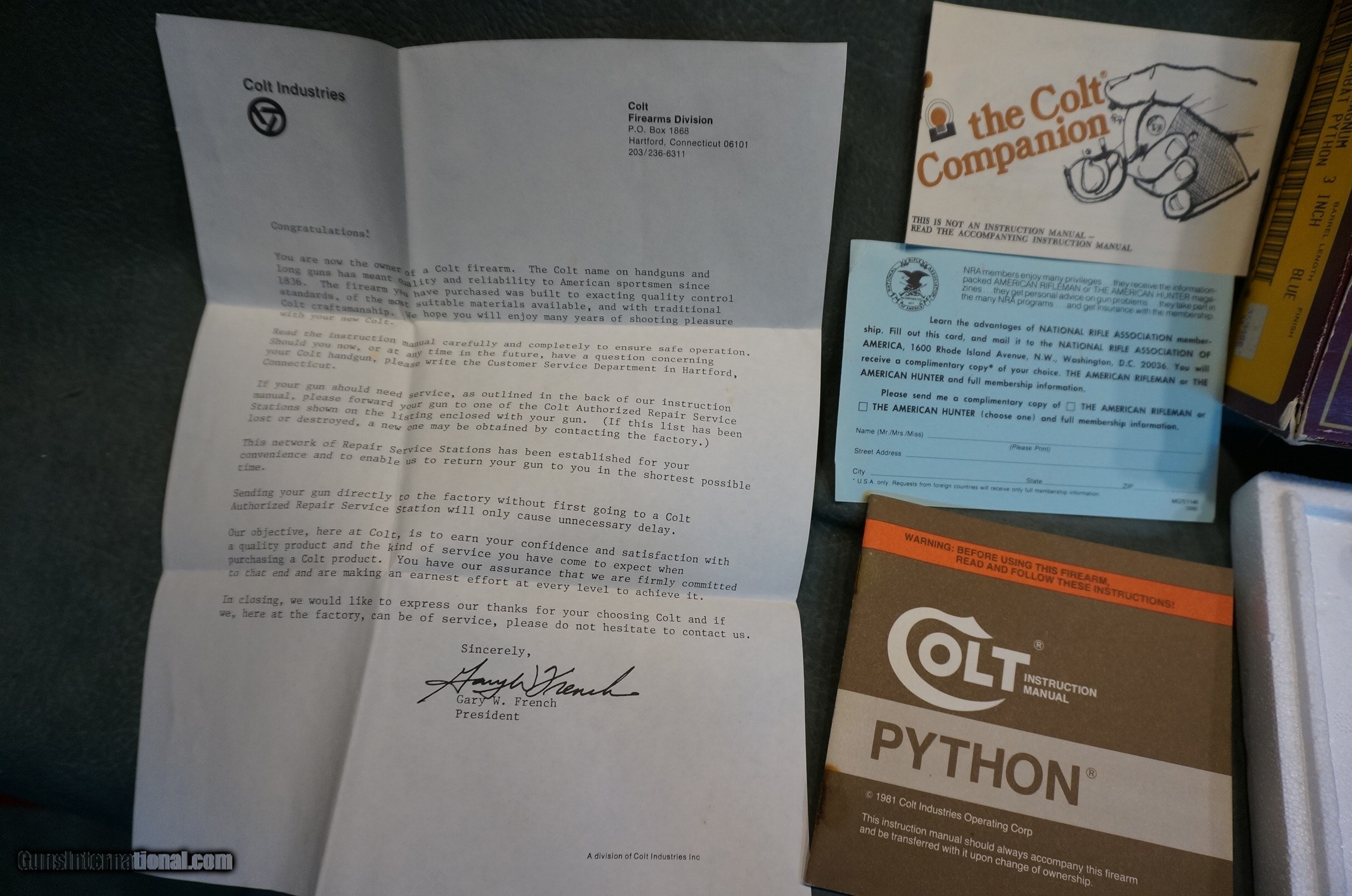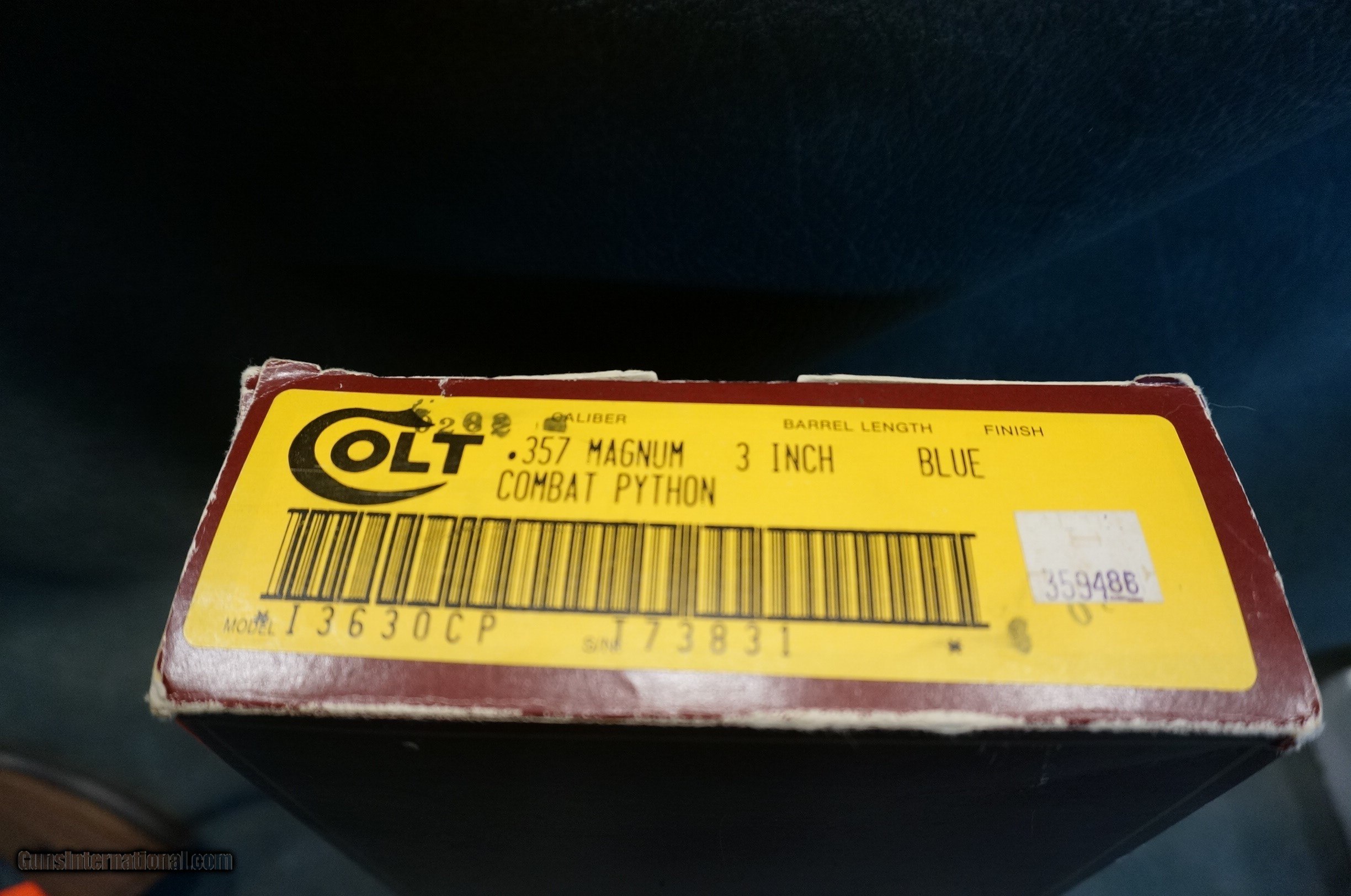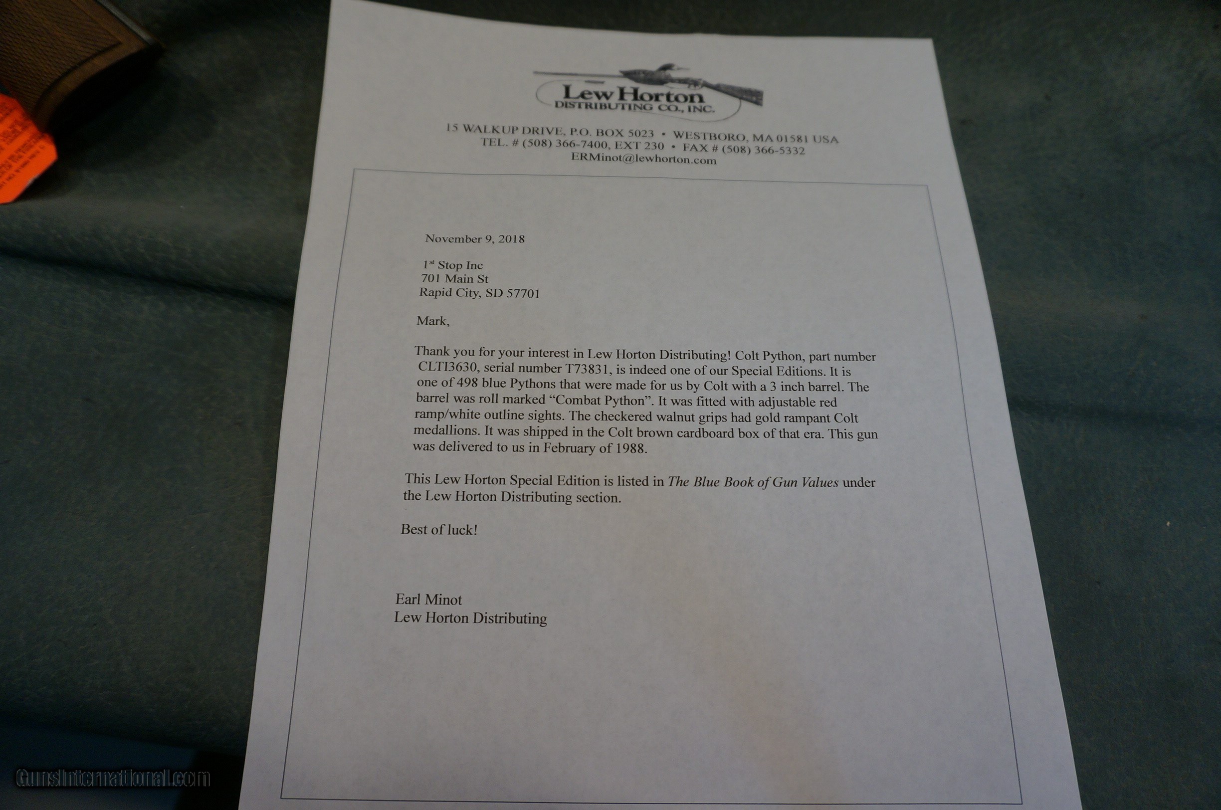Description: Colt Combat Python 357Mag 3" barrel,Lew Horton Special Edition,serial #T73831,SKU I3630CP,one of 498 made and delivered in February 1988,98-99% original bluing with a mark on the left side of the frame,we sold this new in our shop in 1988,it has the original box,papers and letter from Lew Horton,a one owner gun that has been shot very little. We buy, sell, consign and trade new and used firearms. This is our 43rd year in business. We offer 90 day layaways with 20% down. No return on layaways. Firearms will need to be transferred through a FFL dealer. Prices reflect a cash discount. There will be 3% added to credit card sales. We trade for gold and silver. Gun collections wanted for cash. THANK YOU! SOLD |