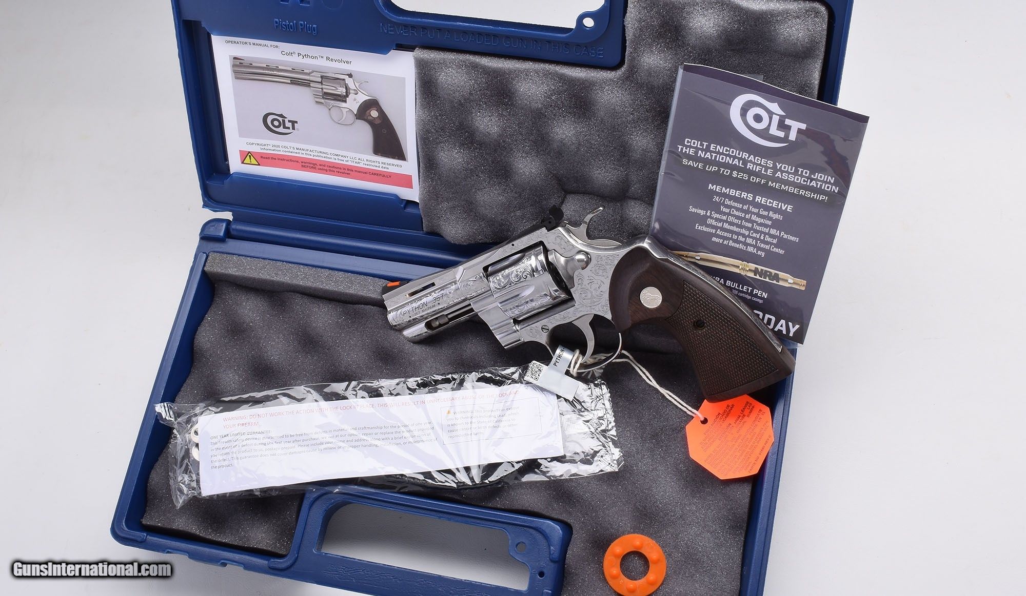Description: Colt Python chambered in 357 Magnum. The revolver features a rear 3-inch barrel, Armory-grade, foliate style cut engraving by Baron Engraving on the barrel, full underlug, frame and backstrap. The top of the rib remains matte stainless to cut the glare. Walnut target grips with colt medallions .NEW in FACTORY BOX, Special Pricing! SOLD Handgun Caliber: .357 Magnum Manufacturer: Colt Model: Python Metal Condition: Polished Stainless, Engraved Wood Condition: Walnut Bore Condition: NEW Triggers: DA/SA Weight: 38 ozs Sights: Adjustable Rear Sight, Ramped Front Engraving: Foliate Scroll Engraving |