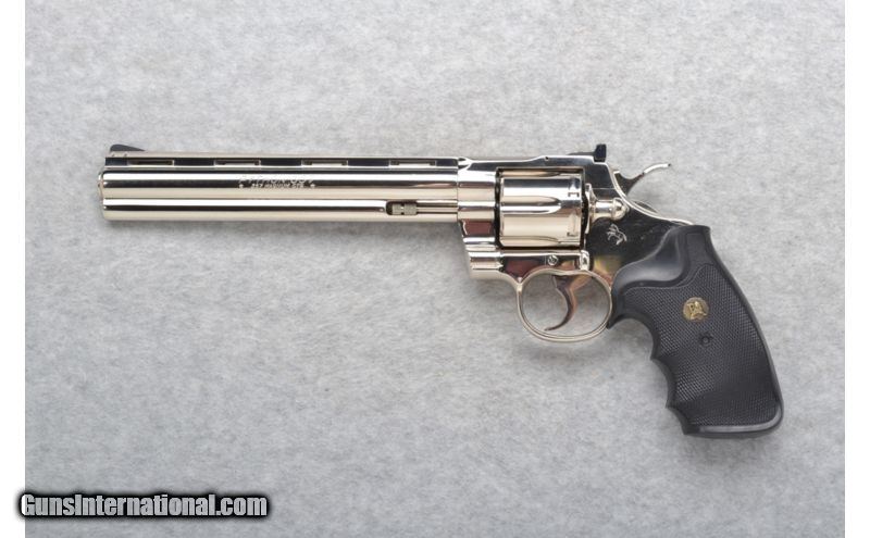 Description: SOLD Caliber Info: .357 Magnum Chambers: 6 shot magazine. Metal Condition: Excellent. Bore Condition: Excellent. Barrels: 8 inch nickel barrel. Triggers: SA/DA Stock: Pachmayr Gripper checkered black rubber with finger grooves and brass medallions. Weight: 52 oz. Sights: Blade front. Adjustable notch rear. Item Location: Richfield, WI |
