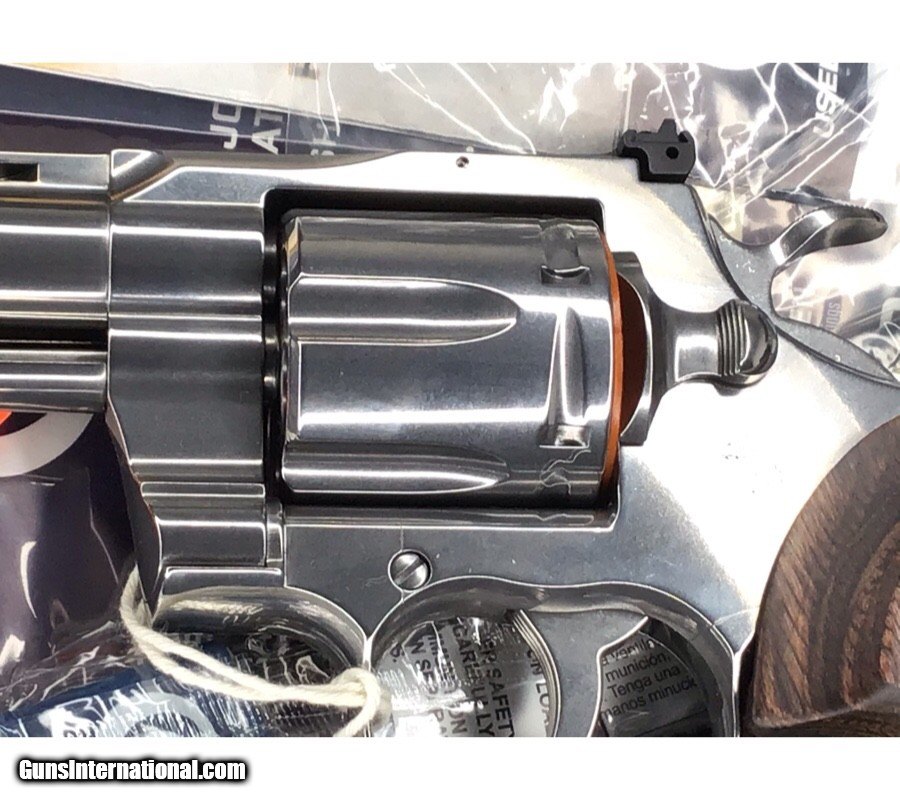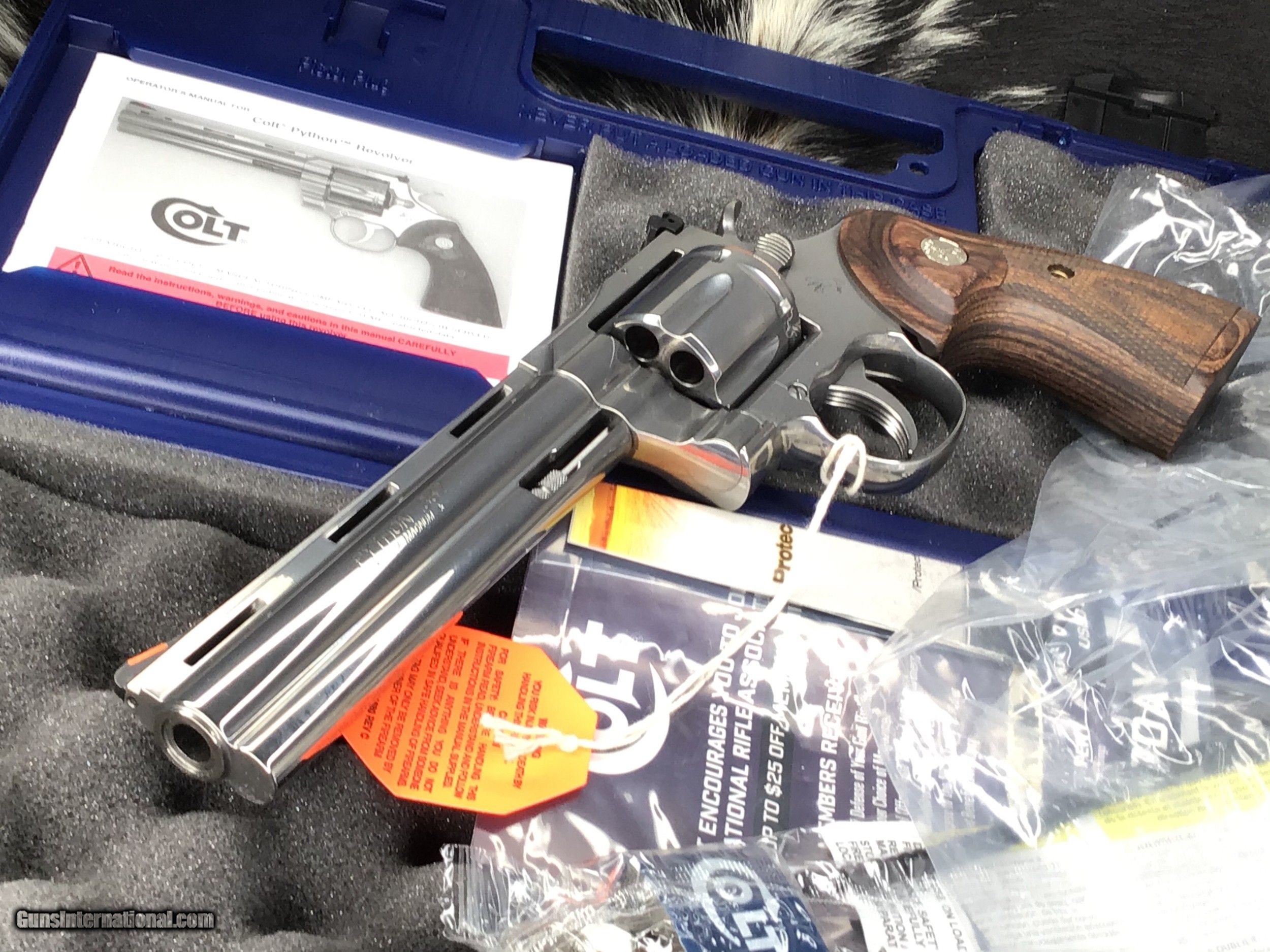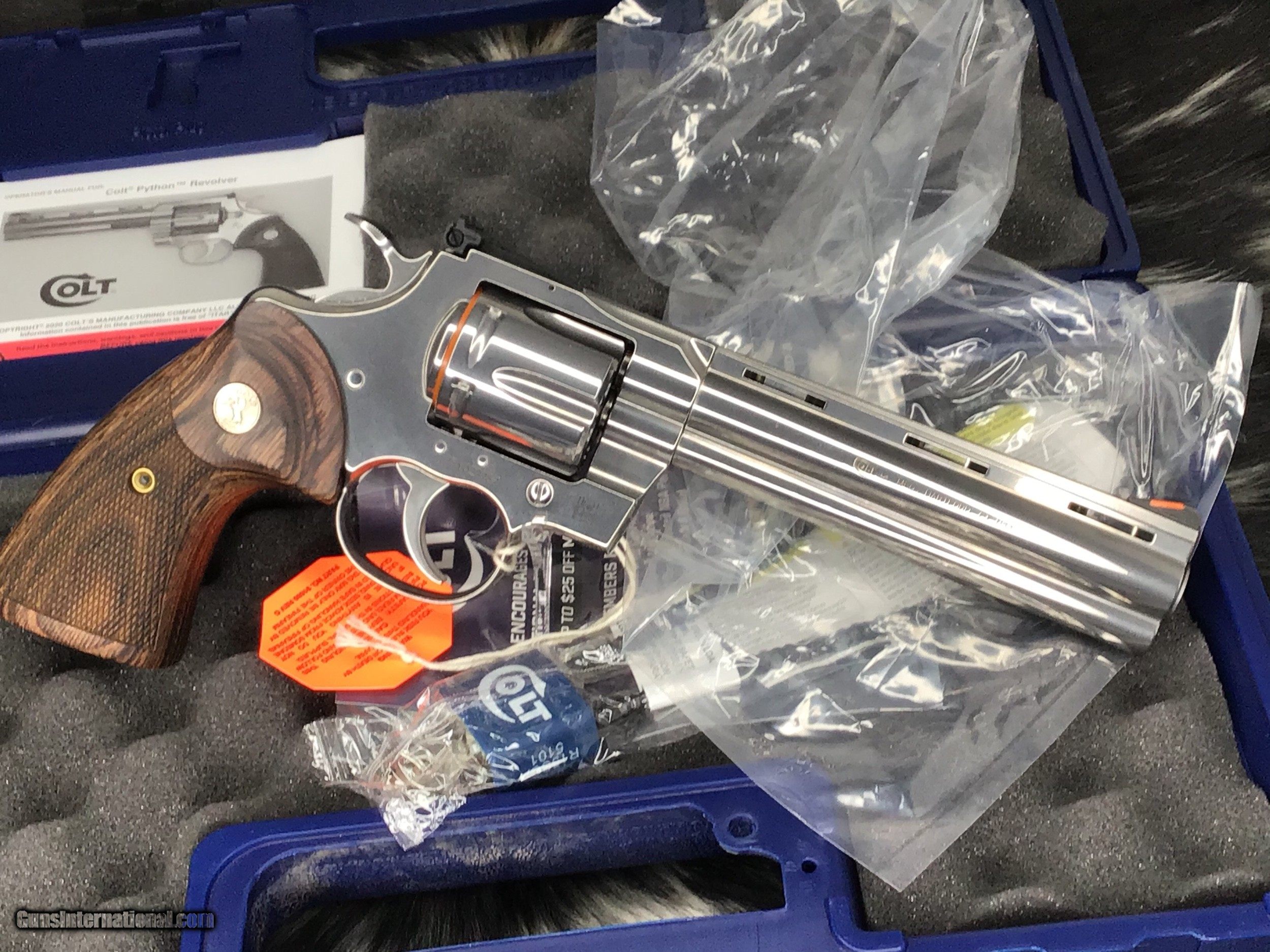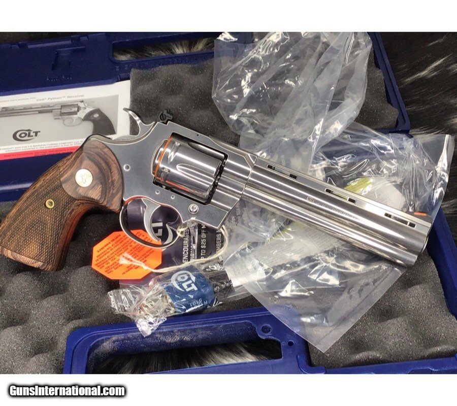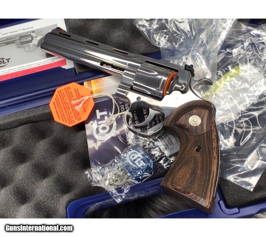 Description: Colts New Python wearing a 6 inch barrel and made of top grade stainless steel. Adjustable sights, wood target grips with Colts Silver ramparts medallions. Legendary quality revolver made in the USA. New in factory hard case with manual, warranty paperwork. Mn buyer needs Mn state ID and permit. Buyer residing outside of Mn pays $30 shipping to local FFL for transfer . SOLD Handgun Caliber: .357 Magnum Manufacturer: Colt Model: New Python Barrel Length: 6 inch Condition: New Metal Condition: New Wood Condition: New Bore Condition: New Finish: Stainless steel Manufacture Date: 2020 |