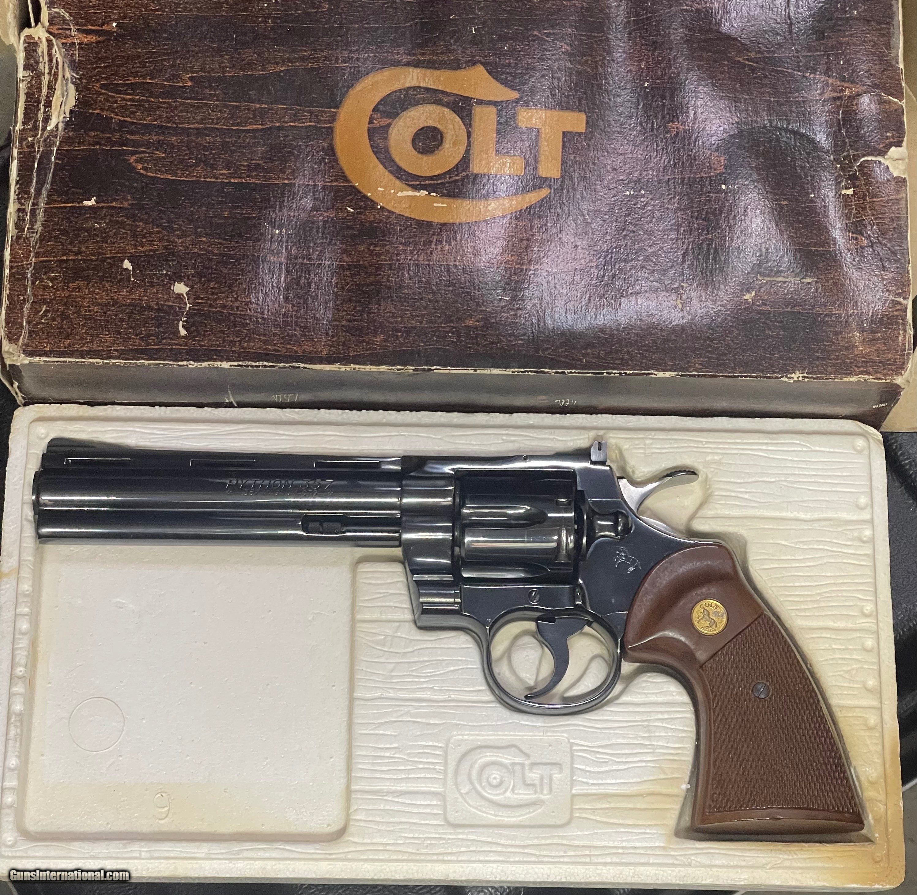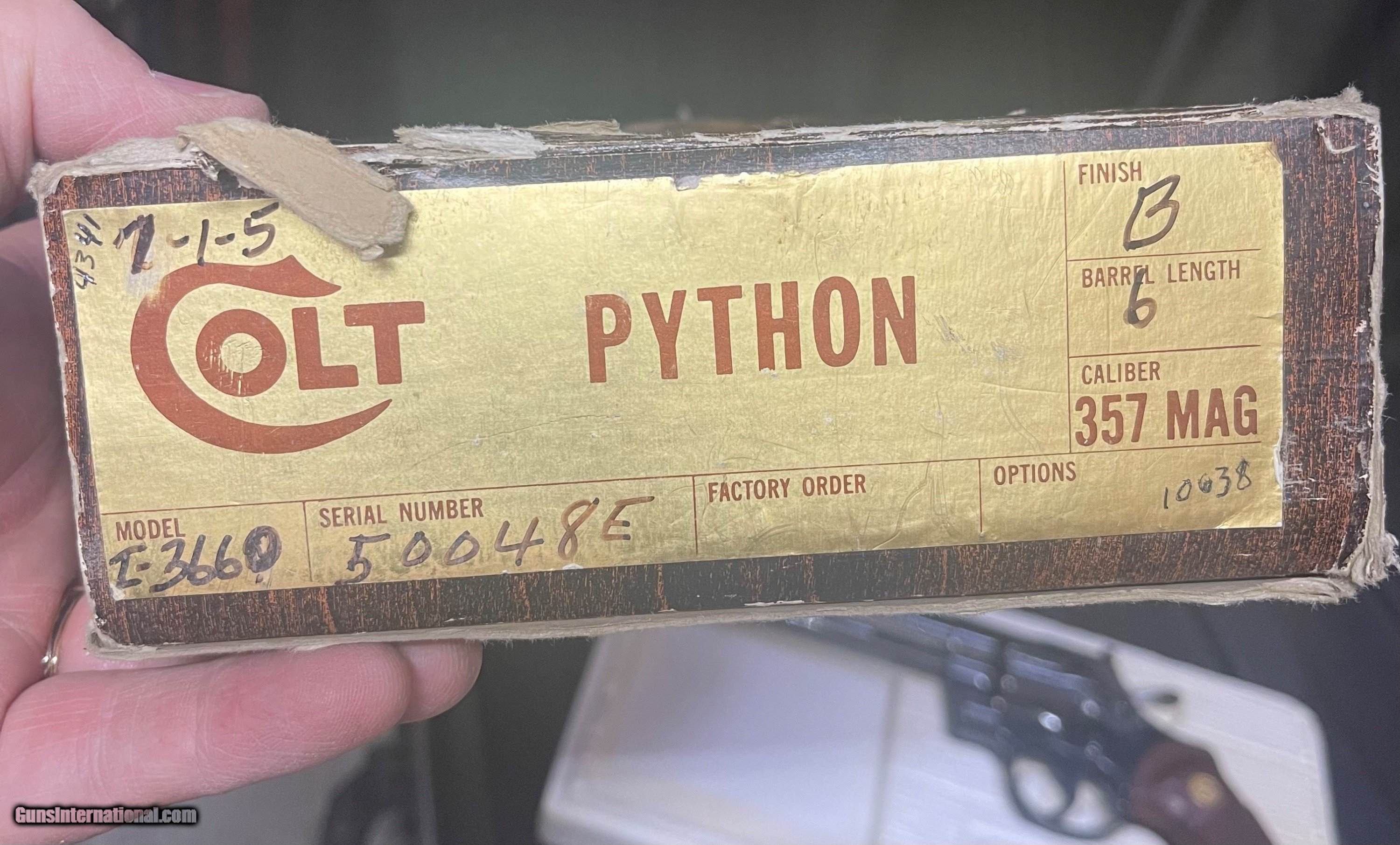 Description: Beautiful Python!! 6 inch full lug barrel, blue finish, target sights, and target grips. Made in 1977 this gun has one faint scratch on the underside of the barrel. Includes box and papers. Box and papers were water damaged at some point. Still VERY nice! Please email with questions. Shipping and insurance included. Cards add 3% SOLD Manufacturer: Colt Model: Python Barrel Length: 6 inch Condition: Used Metal Condition: Excellent Wood Condition: Excellent Bore Condition: Excellent Rib: Vent Finish: Blue Sights: Target Manufacture Date: 1977 Case: Yes Item Location: 37075 |