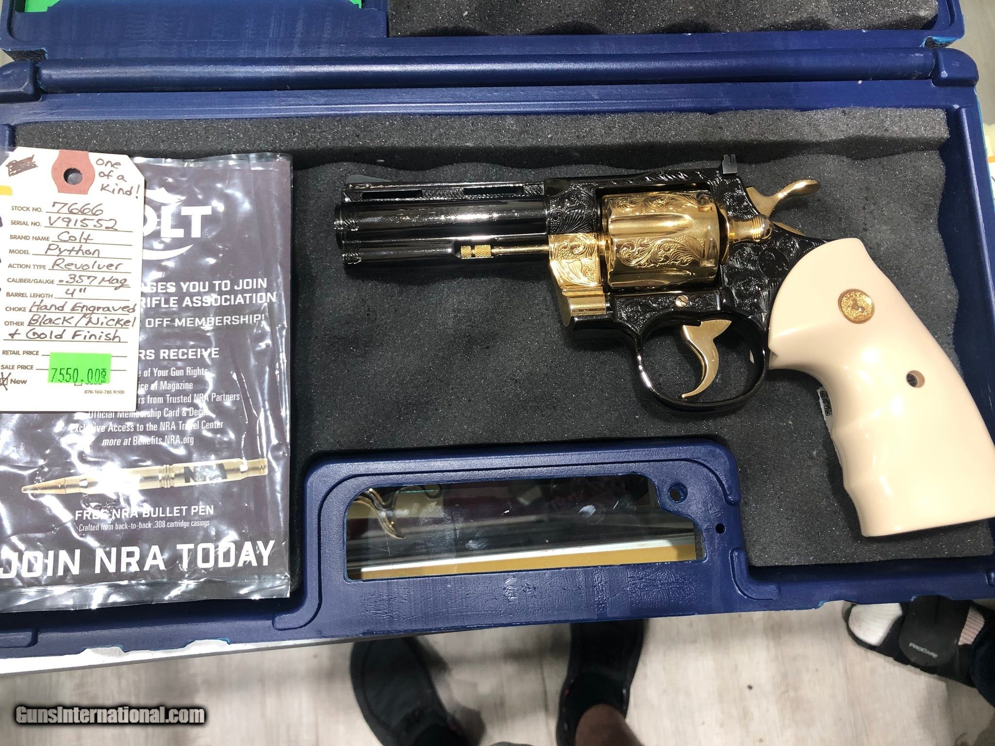 Description: Guns Listing ID: 253203 Colt python blued with engraving and gold plated cylinder, crane, hammer, thumb piece, and trigger. This work was done post manufacturing. Manufactured in 1979. This revolver has faux ivory grips inlaid with the colt emblem. Manufacturer: COLT Model: PYTHON 1979 Caliber Info: .357 MAG Condition: Used - Non-Certified Barrels: 4" BARREL Action: REVOLVER Finish: BLUED W/ ENGRAVING Weight: not specified Price: $4,599.99 Contact Seller |