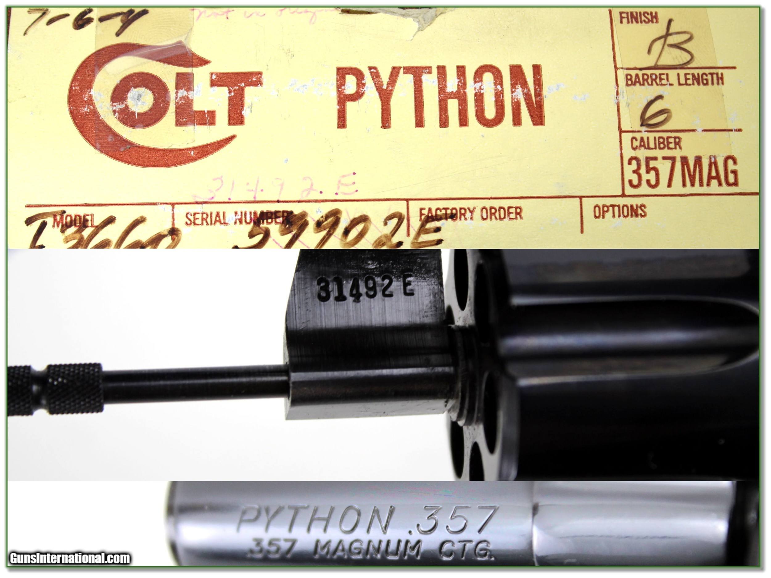 Description: Collectors, this is an unfired Colt Pythion the hard to find 2 1/2in barrel configuration. It has no turn line and no marks. It looks new. It comes with original store hang tag and sales receipt dated 1977. It comes in Python box but it is not serialized to this gun. I am selling this one on consignment and as such lay-a-way can’t be used. It does of course have the standard 3-day inspection. Shipping and insurance is $79. Please email me with any questions or larger pictures. (Consign your quality firearms with Shooting Investments for only 12%! Let me know if you have any you would like to sell!) 22-0025 Payment: Payment is by Money Order, Cashiers Check or Personal Check. I can now also accept Credit Cards (MasterCard, Visa, Discover & American Express) with a 3% convenience fee. Shipping: The shipping charge will be listed in each description. It is $39 for most firearms. Some heavy guns or those insured for over $2000 will be higher. Shipments to Alaska and Hawaii are higher because air shipment is required. Most firearms are shipped on Tuesday and Thursday and usually in 5 days of receipt of payment. We package all shipments carefully and insure them. Optics are shipped Priority Mail and most other non-firearm shipments are shipped First Class. Returns: Our return policy is simple. If for any reason you are not pleased with your purchase, you may return your item for a full refund of purchase price. Ammunition cannot be returned. It is important to us that you are happy. Guns cannot be fired or dissembled before returning them and they must be returned in the same condition as received. Notification of a return must occur with-in 3 days of receipt at your dealer. Shipping, convenience and dealer fees are not refundable and are the responsibility of the buyer. Lay-a-way: If needed, we offer a 60 day lay-a-way option on most firearms. It is 1/3 now, 1/3 in 30 days and 1/3 in 60 days. Lay-a-way firearm sales are final and if not completed the first payment cannot be returned. Consigning your firearms with Shooting Investments: We will help you get top dollar for your firearms. While most local guns shops charge 20% or more, our fee is only 12% with a minimum of $75. At your local gun shop it might take months to sell. Selling on-line provides instant access to thousands of interested buyers. You won’t find any other on-line dealer willing to sell your firearms for only 12% or listing every gun on 3 separate s. Selling through an House typically costs the seller 15% and the buyer an addition 15% (so 30%) and you have to wait several months to sell and longer to receive funds. If properly priced, we will sell your firearms in a few weeks. Send us an email or give us a call and we’ll explain how easy it is for you to get top dollar. Trading: Trading for use is really just buying your gun to re-sell. If you have a gun you want to trade, please email a picture and we will let you know what we can give or it. You will always get more if we sell it for you on consignment. Help for California Buyers: We are happy to ship to California. It is the buyer’s responsibility to make sure any item you buy is legal in your state. We are also happy to help with your purchase of a firearm from someone other than us. If you see a gun you would like to buy but the seller can’t or won’t ship to California they can ship to use and we’ll then ship it to your California dealer. The cost for this service is only $30 + shipping. Let us know if we can help! SOLD |