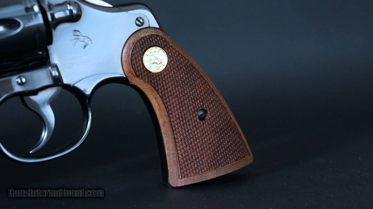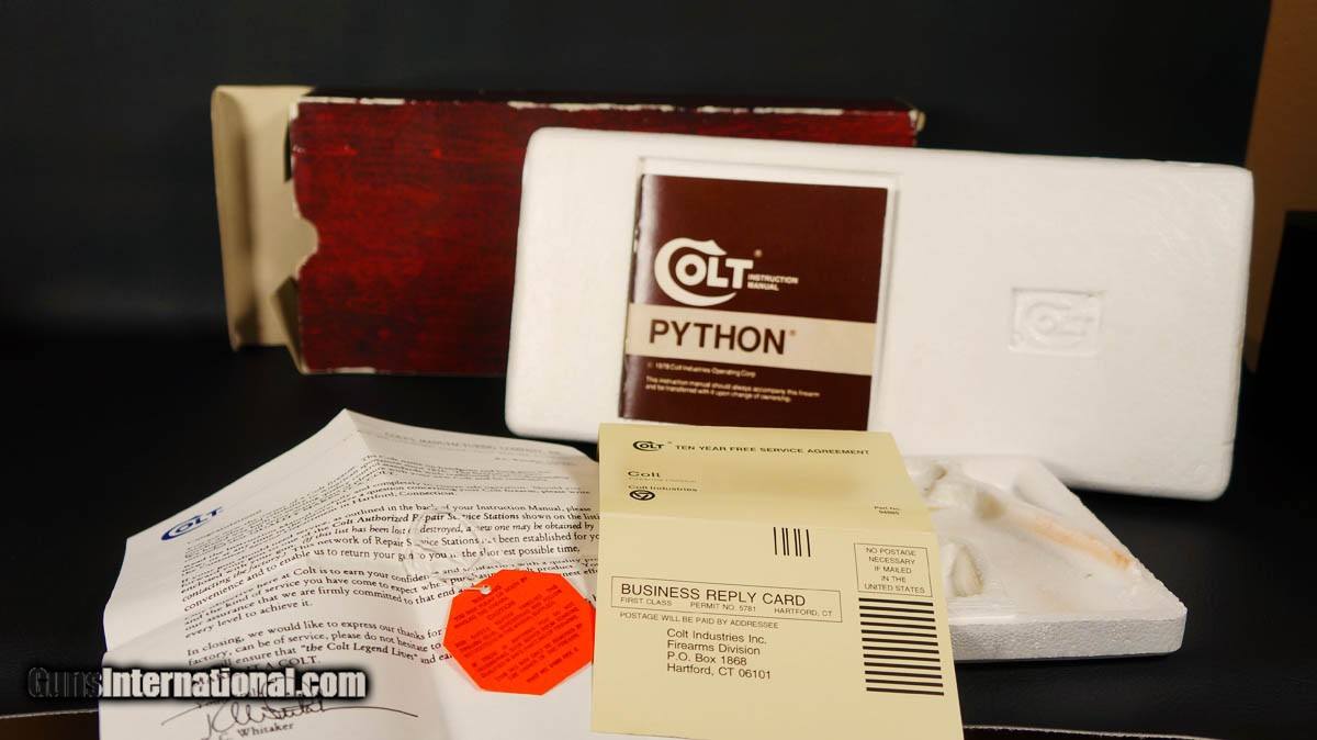 Description: 2.5" vent ribbed Python .357 in Royal Blue with perfect walnut service grips and excellent timing and lock-up. Manufactured in 1977, comes with original box. Excellent overall retaining 99% original blue finish with scattered light handling marks and a cylinder drag line. Grips are excellent with sharp checkering. Mechanically excellent. Box has light wear and includes original paperwork. May consider trades. Shipping FFL to FFL $35.00. Insurance optional. Thank you for looking. Price: $4390.00 Manufacturer: Colt Model: Python Caliber: .38 Special / .357 Magnum Bore: Excellent Condition: Excellent Metal Condition: Excellent SOLD |