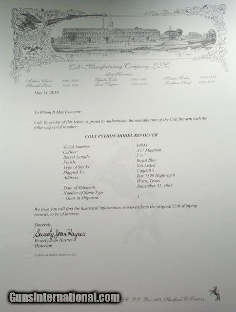 Description: SALE PENDING !! Colt Python serial no. 30843; 2 ½” bbl.; royal blue; 357 mag.; letter to Cogdells, Waco, Texas 1963; gun in NEW CONDITION; UNFIRED since left factory; PERFECT original condition; FFL/C&R required for shipping; from my own personal collection; Long guns shipped by FedEx in a hard case $65; all other items shipped fully insured Priority Mail; - -Hand guns $30 -- Spurs $30-- Knives, Swords & Sabers $30—Grips $20 – Scopes $10; return policy: three days inspection from the date the item is received; full refund of shipping both ways ONLY IF THE ITEM IS MISREPRESENTED. SOLD Curio/Relic: Yes Manufacturer: Colt Model: Python Serial Number: 30843 |
