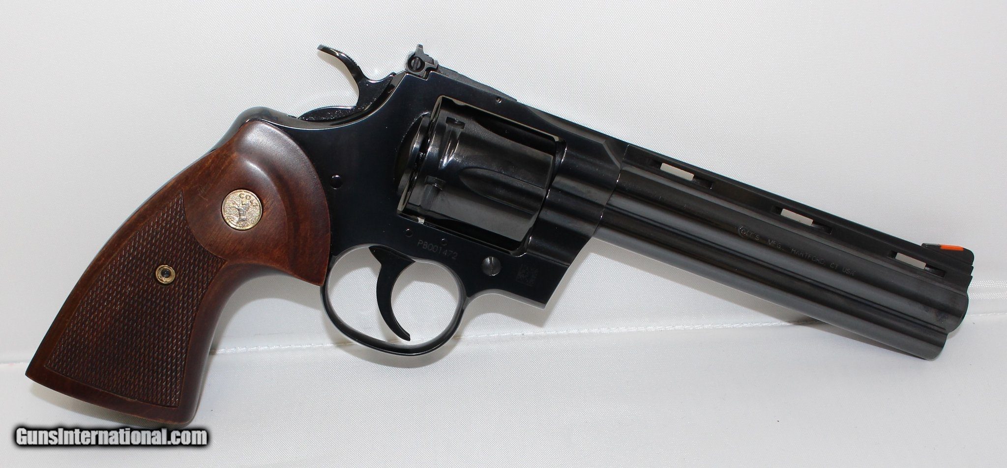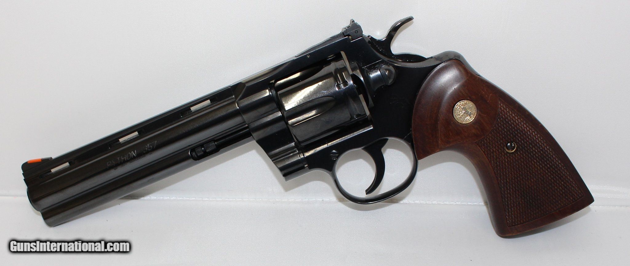 Description: Guns Listing ID: 492924 Colt Python 357 revolver with 6\" barrel. This Python has a black blued finish with with wooden handles. This revolver hold 6 rounds of .357 magnum. The condition of the firearm is very good with just some light scratching on the handle from normal use. The factory box is included with this revolver. SOLD Manufacturer: COLT Model: PYTHON 357 Caliber Info: .357 MAG Condition: Used - Non-Certified Barrels: 6 BARREL Finish: black blued |
