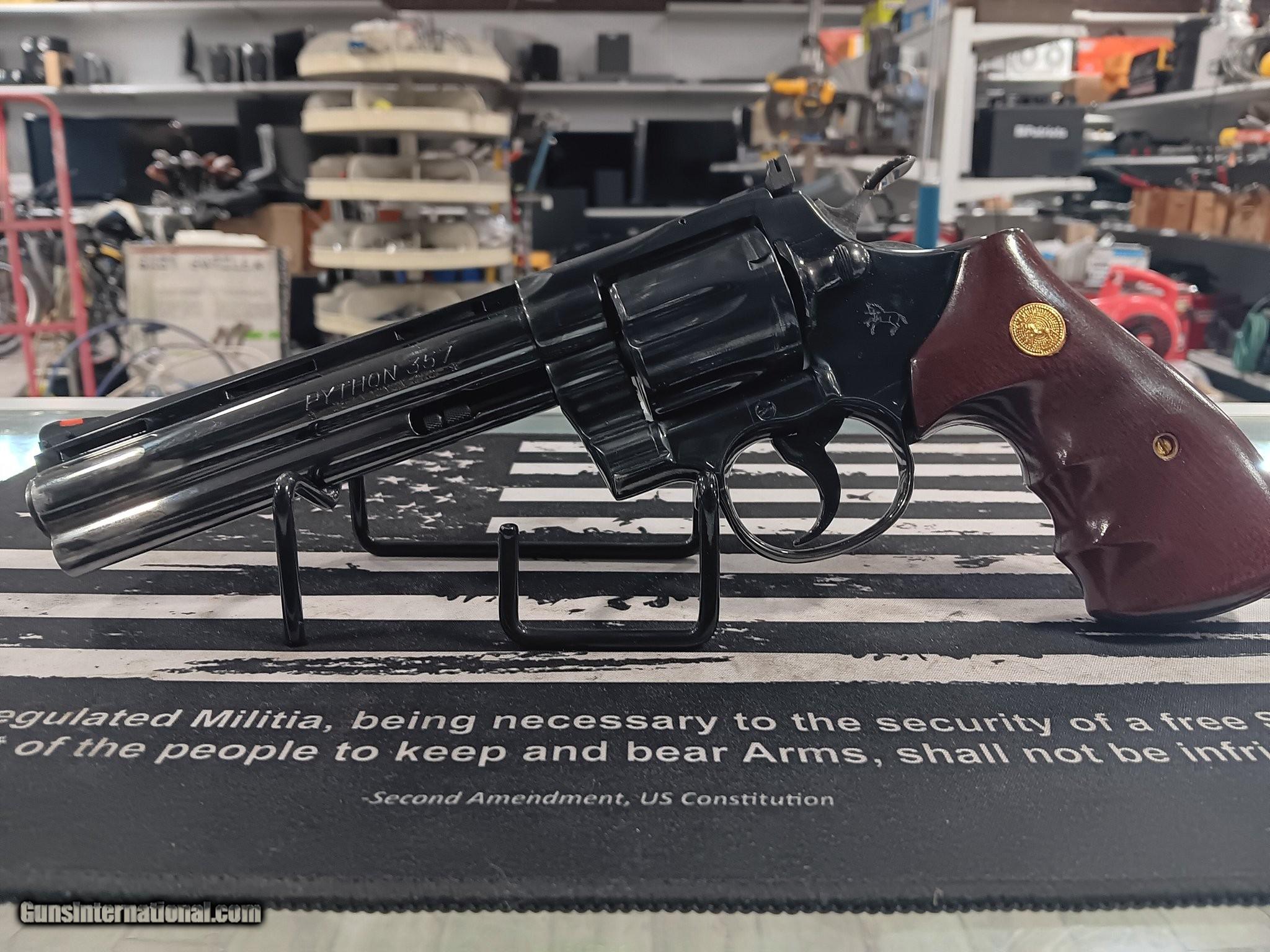 Description: Guns Listing ID: 552549 Colt Python 357, Cal. 357 Magnum, has 6 shot cylinder, double/single action, blued, wood grips, 6in barrel, adjustable rear sight. Unfortunately on the left side of gun, toward the muzzle, the bluing seems to be either wiped, or faded i don‚t know how to explain it, just not normal, but the bluing is missing some how. Other than that it‚s in good condition, light to moderate use. PR SOLD Manufacturer: COLT Model: PYTHON 357 Caliber Info: .357 MAG Condition: Used - Non-Certified Barrels: 6 BARREL Action: REVOLVER Finish: blued |
