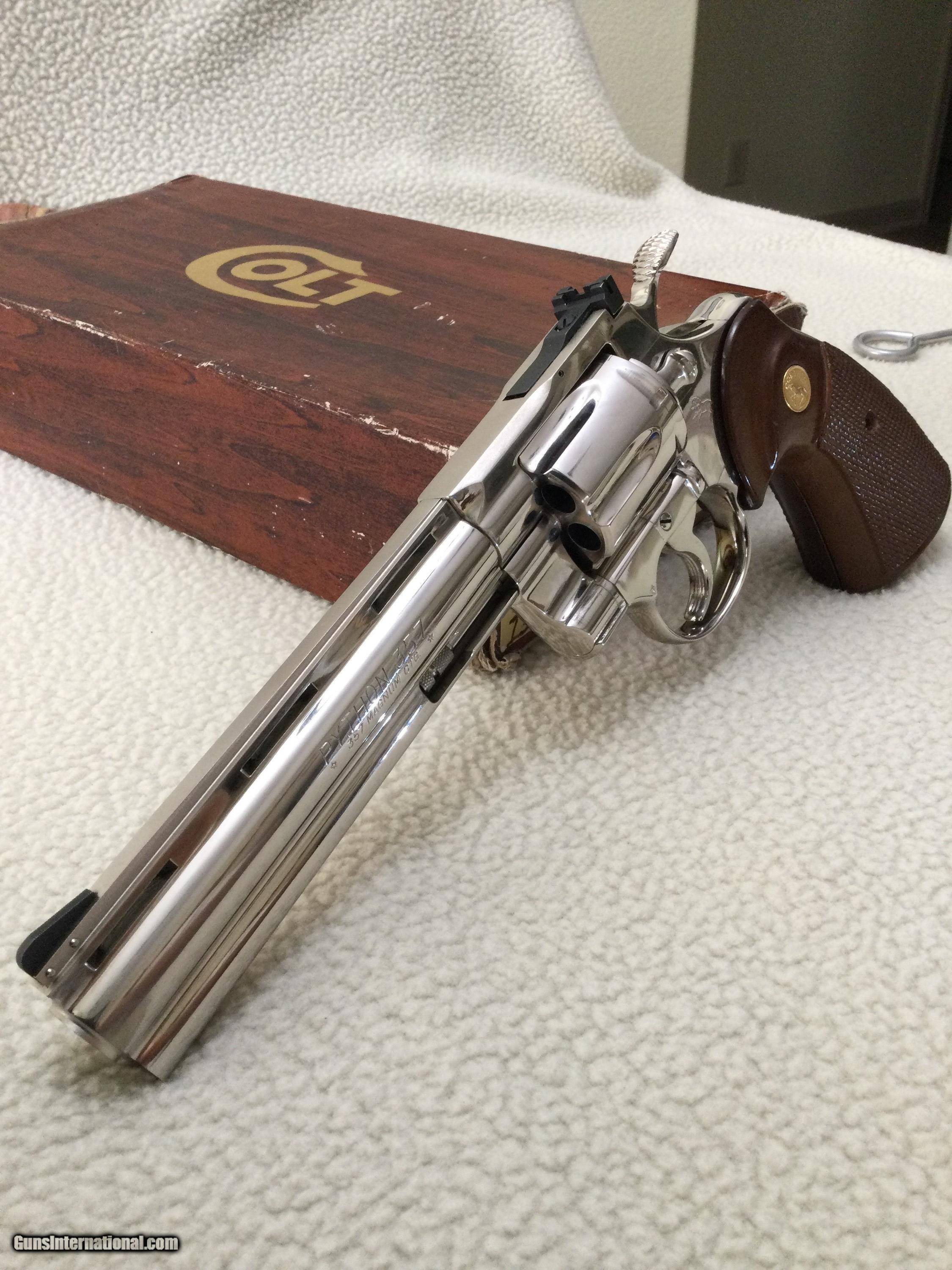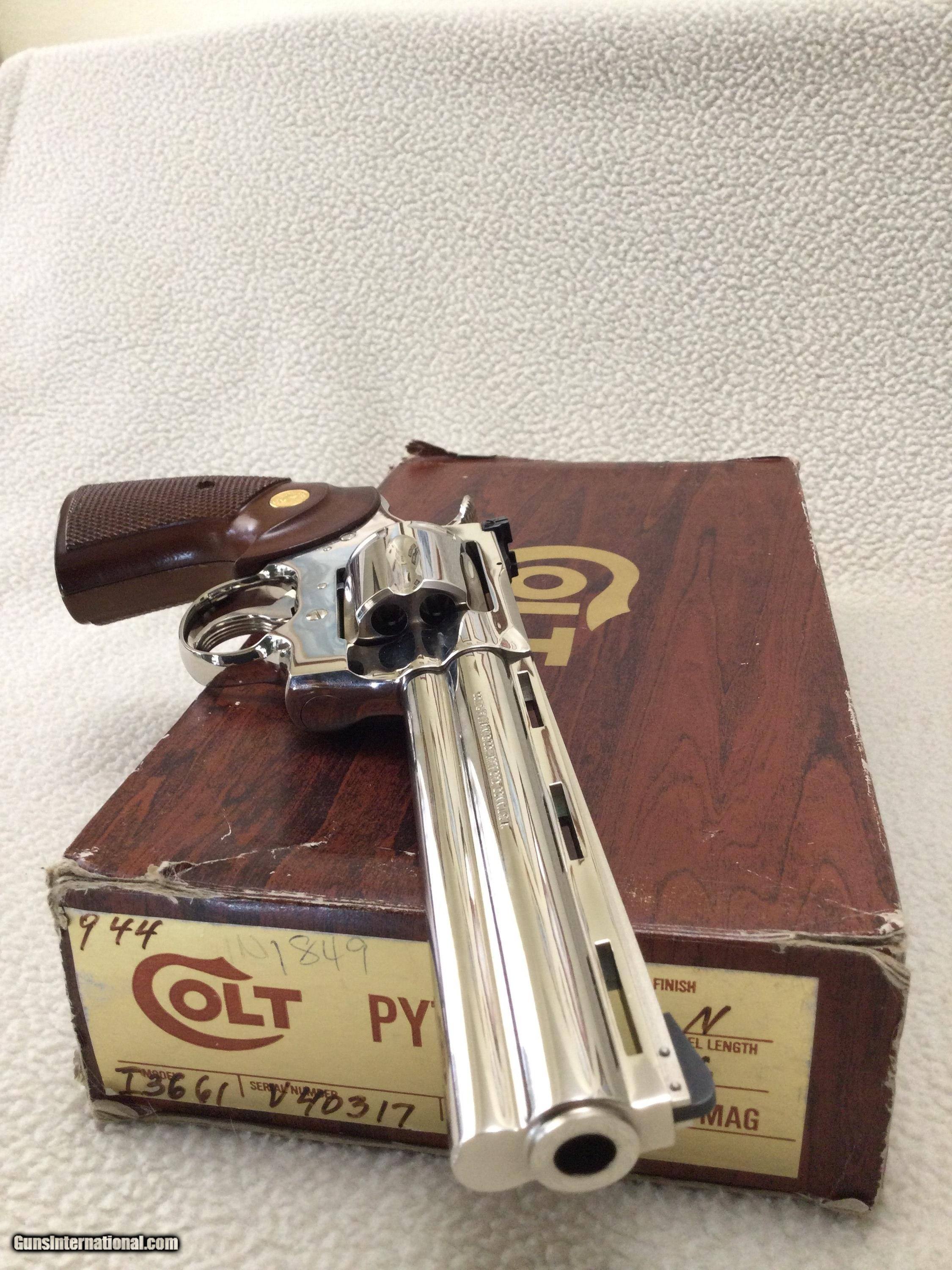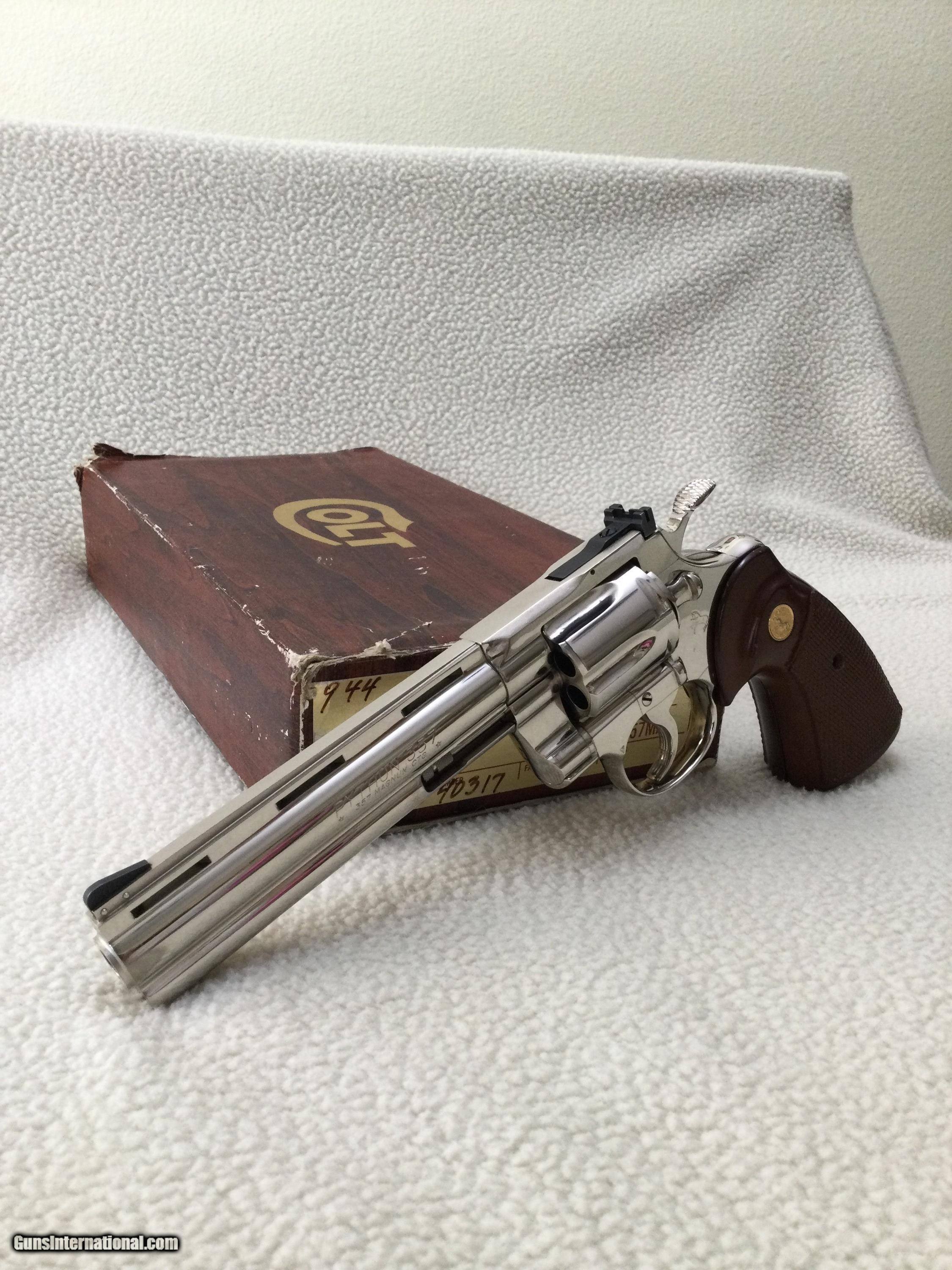 Description: Just in is this beautiful Nickel plated Colt Python with a 6" barrel. Built in 1979 this exceptional revolver appears new with an almost indiscernible cylinder drag line and few faint handling marks. The original box shows some wear but clearly presents this Python's pedegry. Money orders and cashier's checks preferred. Personal checks are accepted but must clear before shipping. E-mails and phone calls are welcome. Thank you for your interest and we encourage you to compare this Colt to others. SOLD Manufacturer: Colt Model: Python Serial Number: V403xx Barrel Length: 6” Bore: Mirror Chambers: Mirror Condition: Excellent Metal Condition: Beautiful Nickel Wood Condition: Super Nice Bore Condition: Sharp rifling Action: Slick Python Action Triggers: Ribbed Stock: Wood Finish: Nickel Weight: 45 oz. Sights: Adjustable Manufacture Date: 1979 |