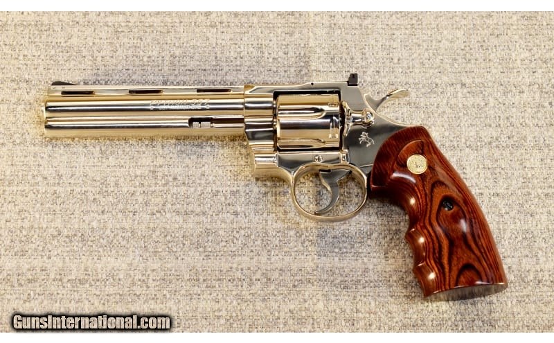 Description: This is a pre-owned nickel Colt Python in .357 Magnum with a six-inch barrel manufactured in 1983 .357 Magnum SOLD Metal Condition: Very good with light cylinder drag marks and a few small scratches and rub marks Wood Condition: Very good with a few small scratches Bore Condition: Clean with bright lands Barrels: 6 Triggers: DA/SA Butt Pad: Laminated rosewood with finger grooves Weight: 2 LBS. 14 Oz. Sights: "Ramp front, adjustable rear Item Location: Glendale, AZ |