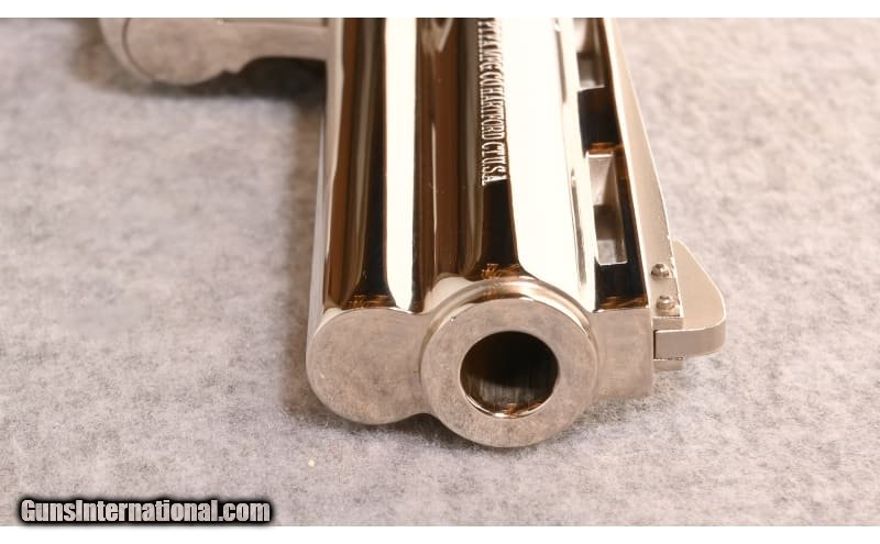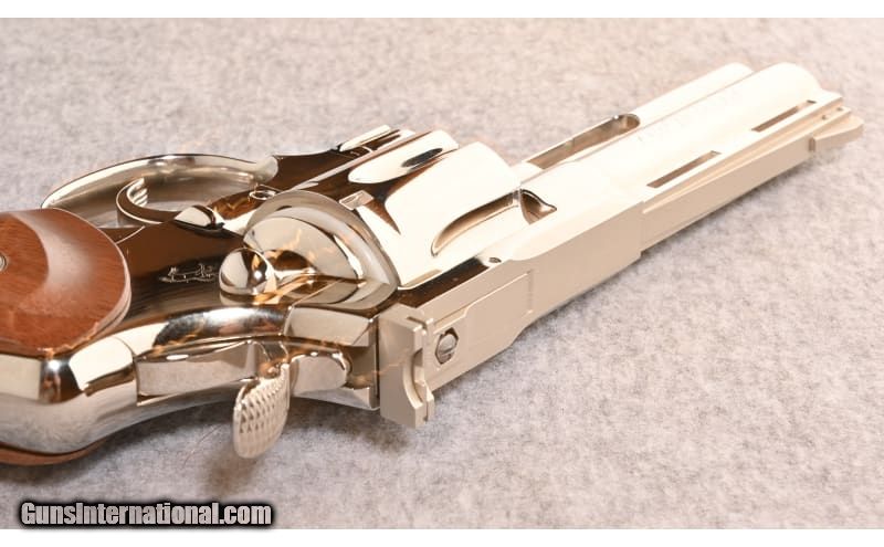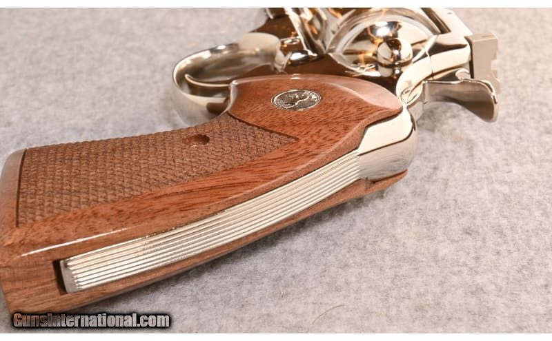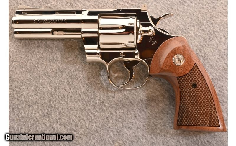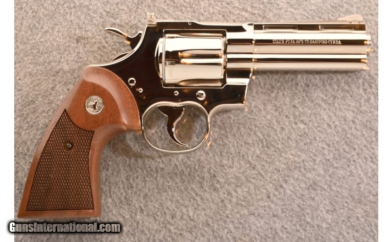 Description: A Colt Python .357 magnum in nickel with a 4 inch barrel, no turn ring, Excellent condition. Dated to 1969 on Colt's . .357 Magnum SOLD Metal Condition: Excellent with light wear Wood Condition: Excellent with light wear Bore Condition: Bright and Shiny Barrels: 4 inches Triggers: Single/Double action Weight: 2 lbs 8 oz Sights: "Front ramp, rear adjustable Item Location: Gonzales, LA |