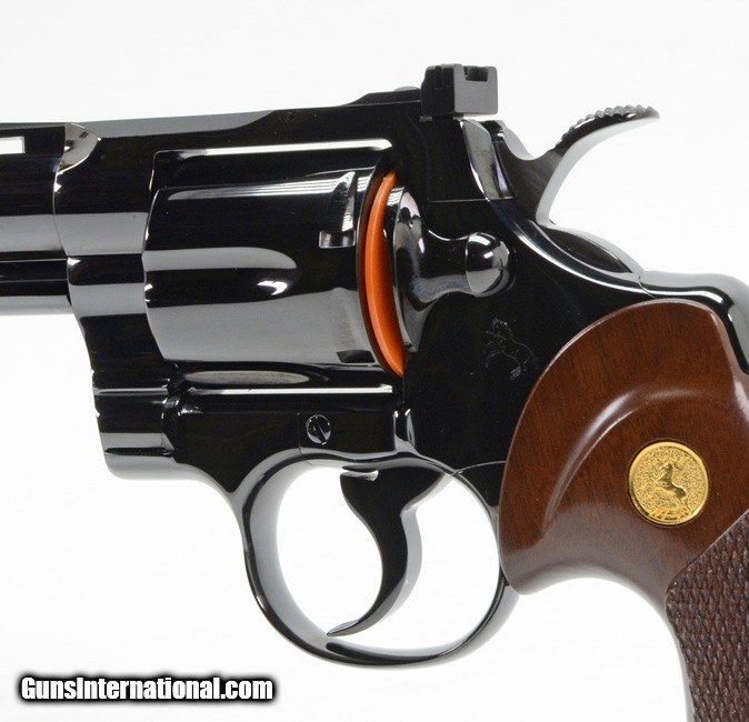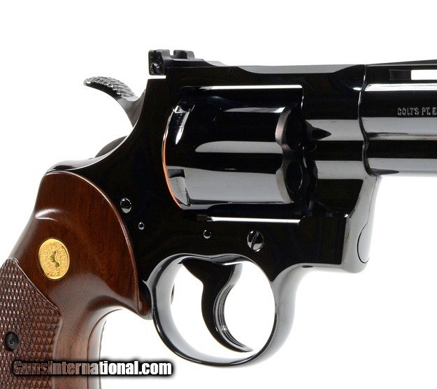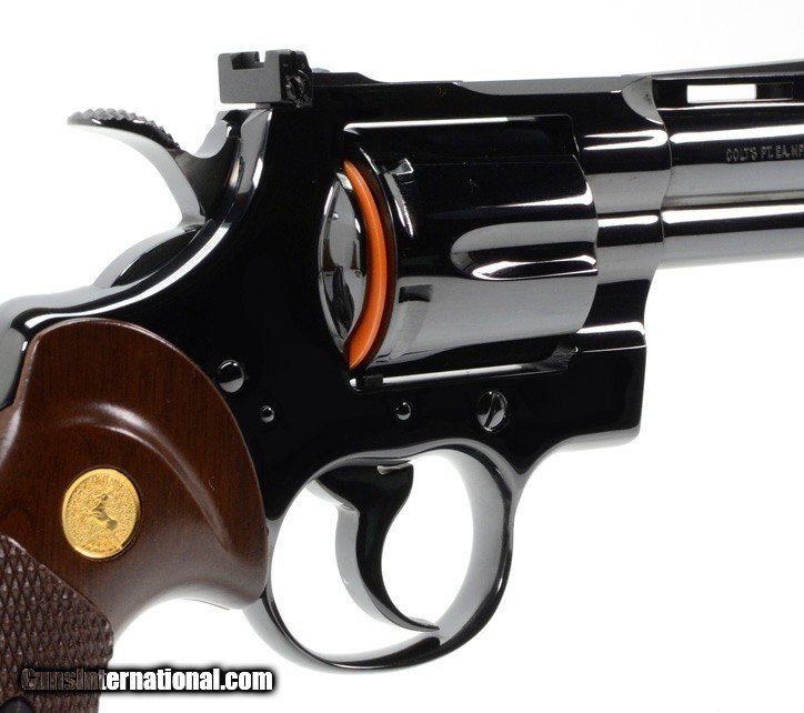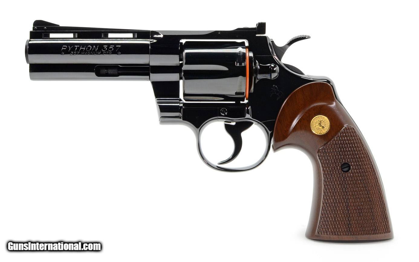 Description: Colt Python 357 Mag. 4 Inch Blue. Like New Condition. DOM 1974 AVAILABLE FOR SALE AT OUR ON-LINE STORE Features Ventilated Rib, Fast-Cocking Wide Spur Hammer & Full Shrouded Ejector Rod. The Colt Python is a .357 Magnum caliber revolver formerly manufactured by Colt's Manufacturing Company of Hartford, Connecticut. It is sometimes referred to as a "Combat Magnum". It was first introduced in 1955, the same year as Smith & Wesson's M29 .44 Magnum. The vintage Colt Python targeted the premium revolver market segment. Some firearm collectors and writers such as Jeff Cooper, Ian V. Hogg, Chuck Hawks, Leroy Thompson, Scott Wolber, Renee Smeets and Martin Dougherty have described the Python as the finest production revolver ever made