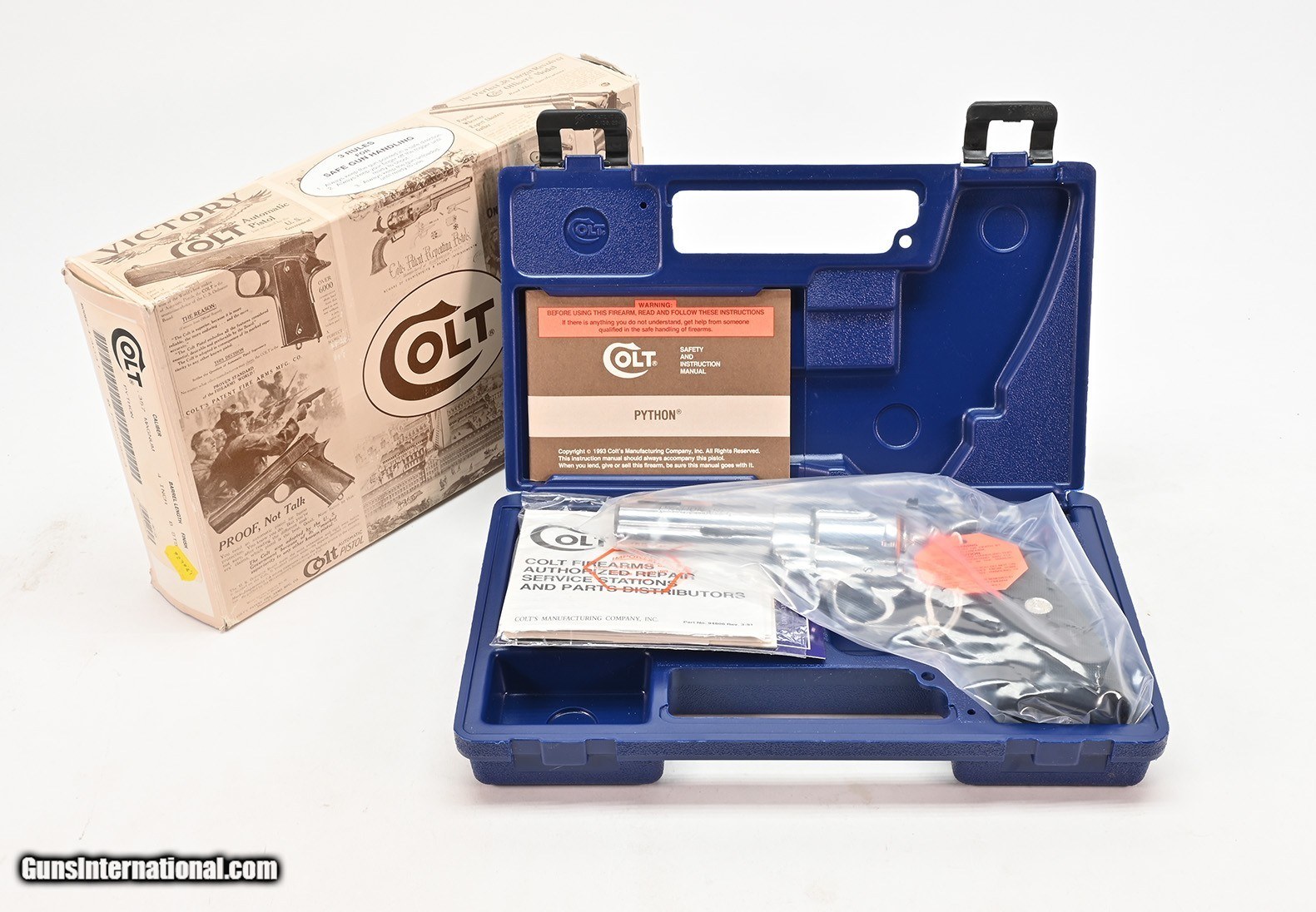 Description: Colt Python .357 Mag. 4 Inch Bright Stainless. Original, Like New Condition. DOM 1994 AVAILABLE FOR PURCHASE AT OUR ON-LINE STORE This Colt Python was thoroughly cleaned and lubricated by The Custom Shop, internally and externally, to Like New condition. The Colt Python is a .357 Magnum caliber revolver formerly manufactured by Colt's Manufacturing Company of Hartford, Connecticut. It is sometimes referred to as a "Combat Magnum".[1] It was first introduced in 1955. Now discontinued, the Colt Python was intended for the premium revolver market segment. Some firearm collectors and writers such as Jeff Cooper, Ian V. Hogg, Chuck Hawks, Leroy Thompson, Scott Wolber, Renee Smeets and Martin Dougherty have described the Python as the finest production revolver ever made.