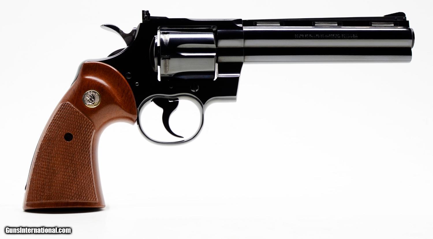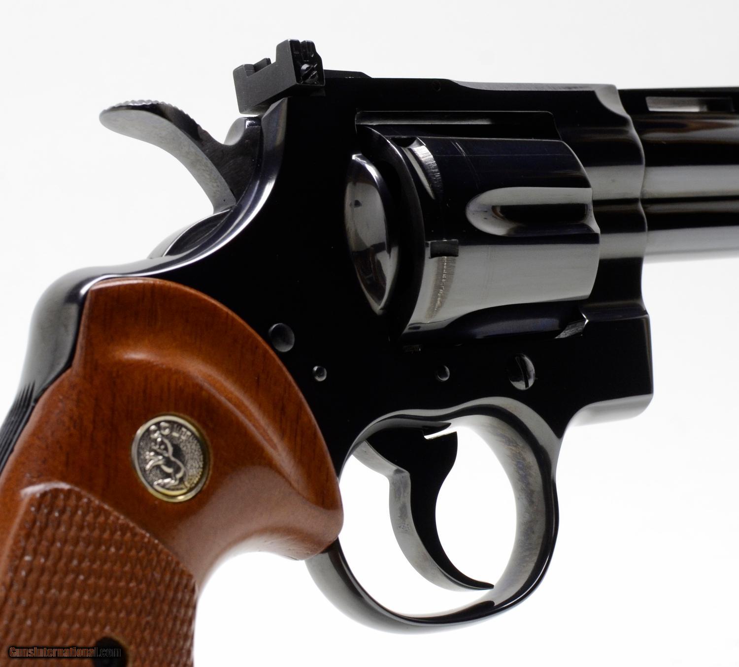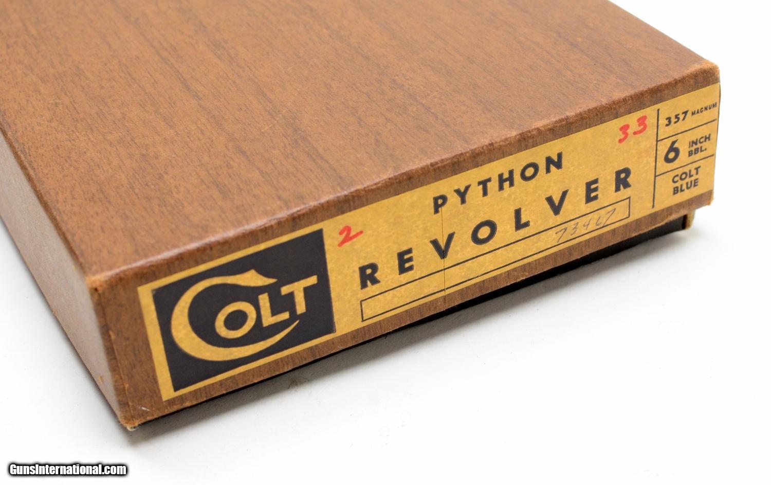 Description: Colt Python 357 Mag. 6 Inch Blue Revolver. Like New In Factory Original Box. DOM 1973 AVAILABLE FOR PURCHASE AT OUR ONLINE STORE In Original Factory Colt Python Box. Features Ventilated Rib, Fast-Cocking Wide Spur Hammer & Full Shrouded Ejector Rod. DOM 1973 'The Colt Python is a .357 Magnum caliber revolver formerly manufactured by Colt's Manufacturing Company of Hartford, Connecticut. It is sometimes referred to as a "Combat Magnum".[1] It was first introduced in 1955, the same year as Smith & Wesson's M29 .44 Magnum. The now discontinued Colt Python targeted the premium revolver market segment. Some firearm collectors and writers such as Jeff Cooper, Ian V. Hogg, Chuck Hawks, Leroy Thompson, Scott Wolber, Renee Smeets and Martin Dougherty have described the Colt Python as the finest production revolver ever made.' The Colt Python is a double action handgun chambered for the .357 Magnum cartridge, built on Colt's large I-frame. Pythons have a reputation for accuracy, smooth trigger pull, and a tight cylinder lock-up. They are similar in size and function to the Colt Trooper and Colt Lawman revolvers.Wikipedia CS_000528 SPECIFICATIONS