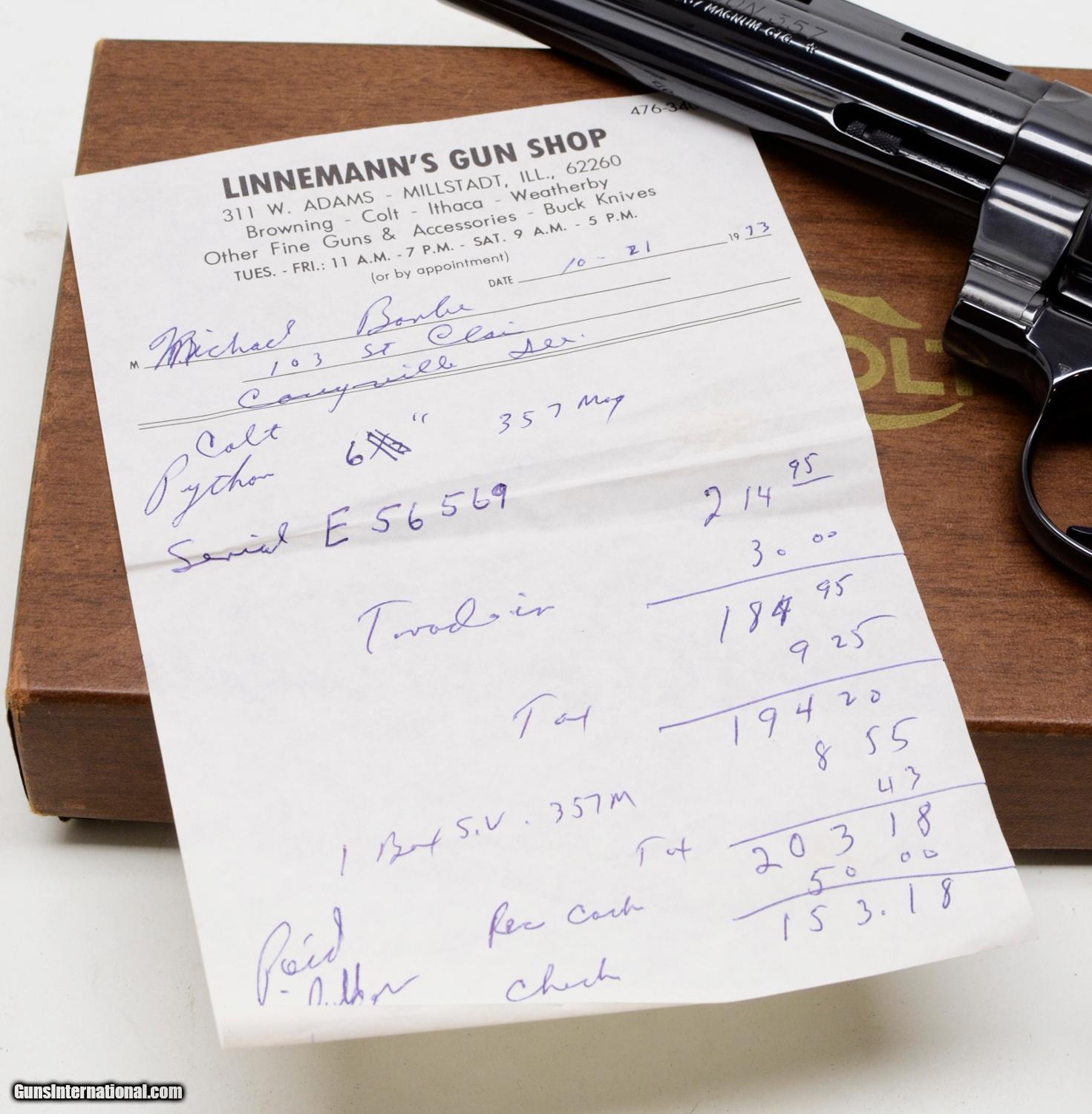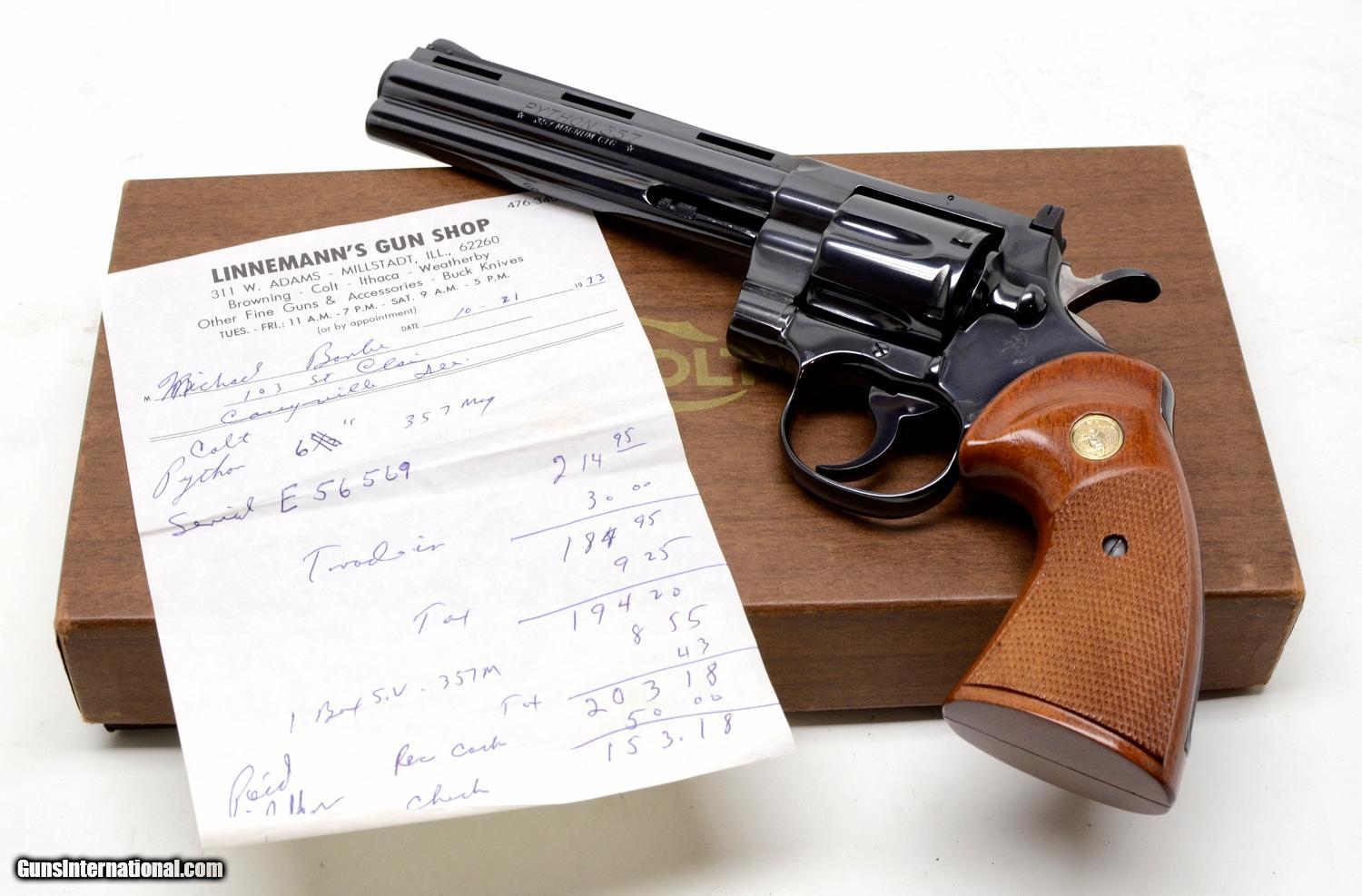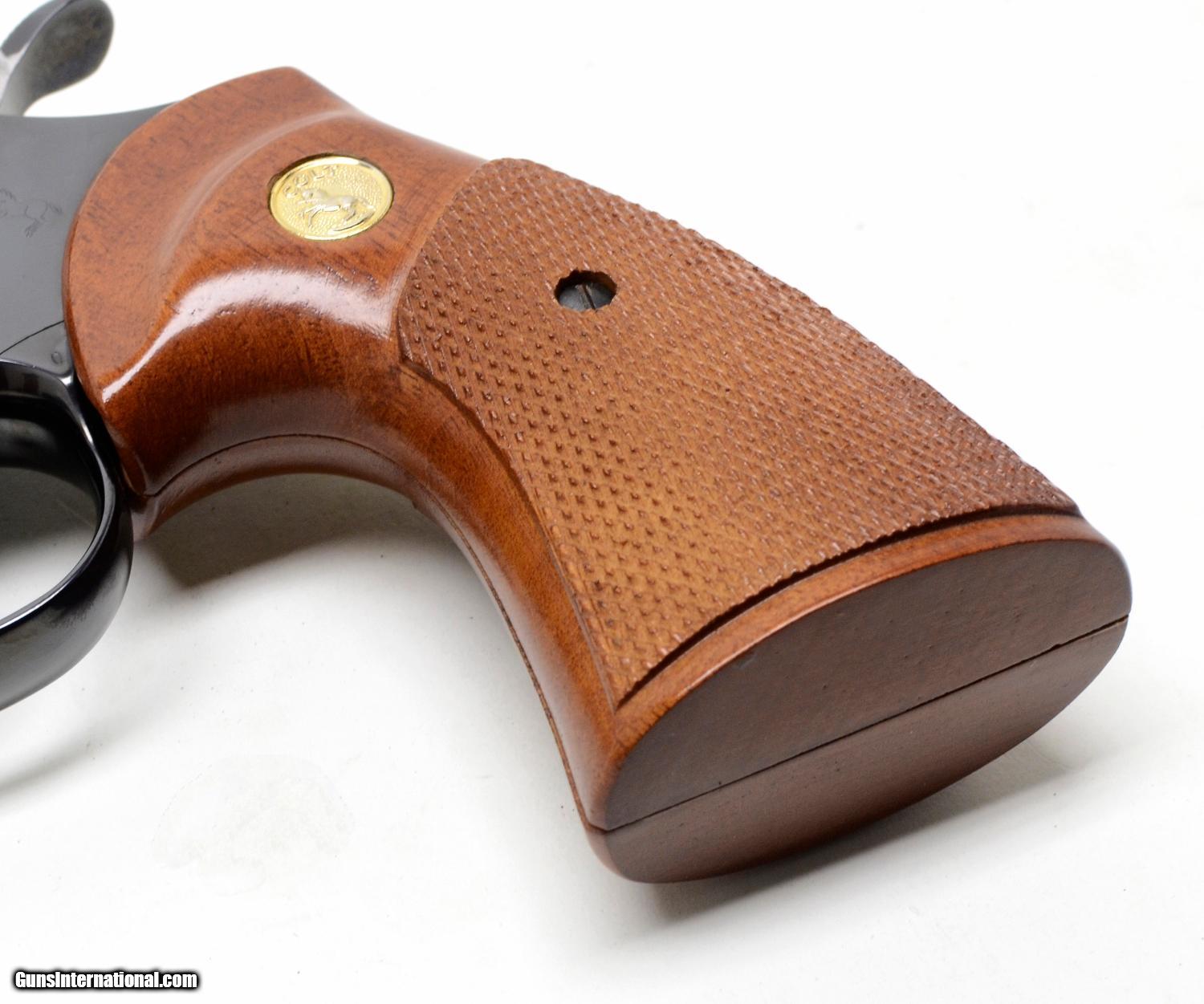 Description: Colt Python 357 Mag. 6 Inch Blue Revolver. Like New In Factory Original Box. DOM 1973 AVAILABLE FOR PURCHASE AT OUR ONLINE STORE In Original Factory Colt Python Box. Features Ventilated Rib, Fast-Cocking Wide Spur Hammer & Full Shrouded Ejector Rod. DOM 1973 'The Colt Python is a .357 Magnum caliber revolver formerly manufactured by Colt's Manufacturing Company of Hartford, Connecticut. It is sometimes referred to as a "Combat Magnum".[1] It was first introduced in 1955, the same year as Smith & Wesson's M29 .44 Magnum. The now discontinued Colt Python targeted the premium revolver market segment. Some firearm collectors and writers such as Jeff Cooper, Ian V. Hogg, Chuck Hawks, Leroy Thompson, Scott Wolber, Renee Smeets and Martin Dougherty have described the Colt Python as the finest production revolver ever made.' The Colt Python is a double action handgun chambered for the .357 Magnum cartridge, built on Colt's large I-frame. Pythons have a reputation for accuracy, smooth trigger pull, and a tight cylinder lock-up. They are similar in size and function to the Colt Trooper and Colt Lawman revolvers.Wikipedia CS_000528 SPECIFICATIONS