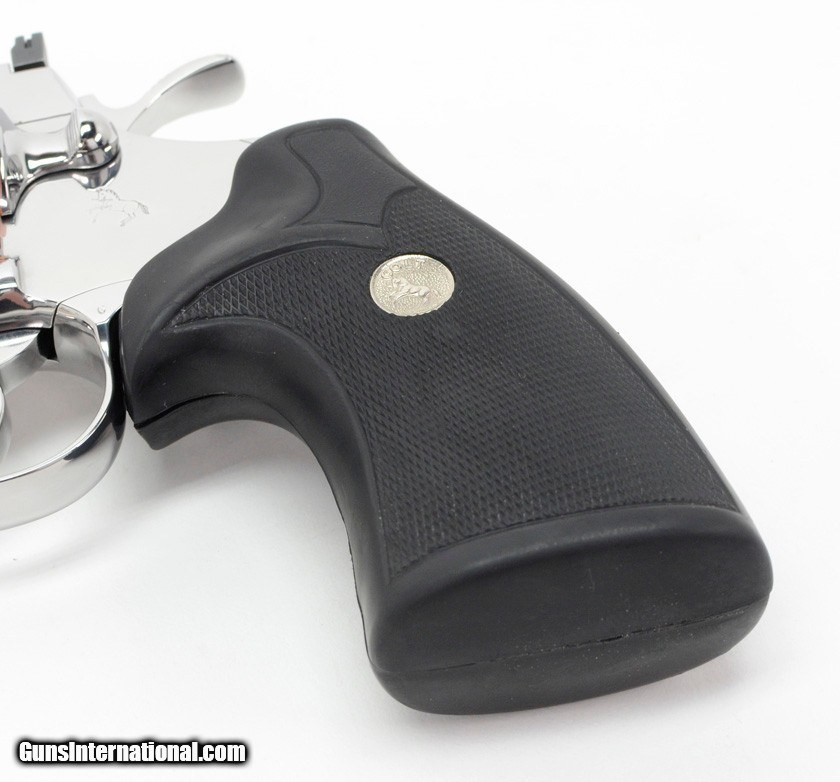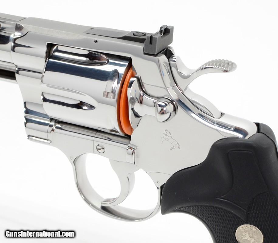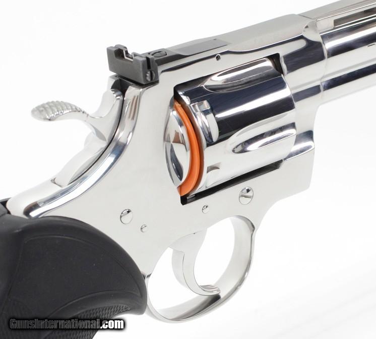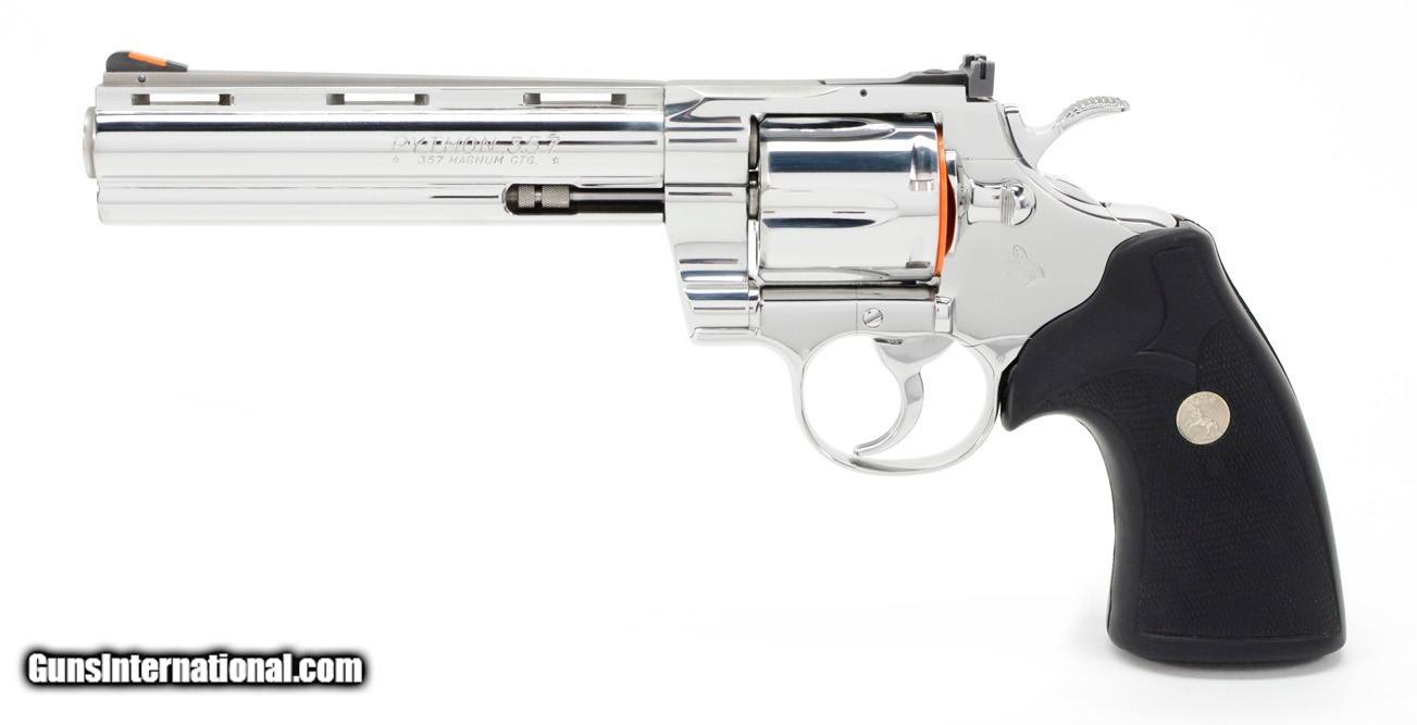 Description: Colt Python 357 Mag. 6 Inch Bright Stainless Finish. Like New In Original Blue Hard Case And Picture Box. DOM 1994 AVAILABLE FOR PURCHASE AT OUR ON-LINE STORE With Custom Shop, Inc’s knowledge and professional experience as Colt’s Authorized Restoration & Repair Center, our gunsmiths have carefully reconditioned this firearm to the appearance it had the day it left the factory. The firearms we acquire for reconditioning are in Excellent condition all on their own; we just take them back to their original shine, maximizing their potential value. Features Ventilated Rib, Fast-Cocking Wide Spur Hammer & Full Shrouded Ejector Rod. The Colt Python is a .357 Magnum caliber revolver formerly manufactured by Colt's Manufacturing Company of Hartford, Connecticut. It is sometimes referred to as a "Combat Magnum". It was first introduced in 1955, the same year as Smith & Wesson's M29 .44 Magnum. The now discontinued Colt Python targeted the premium revolver market segment. Some firearm collectors and writers such as Jeff Cooper, Ian V. Hogg, Chuck Hawks, Leroy Thompson, Scott Wolber, Renee Smeets and Martin Dougherty have described the Python as the finest production revolver ever made
