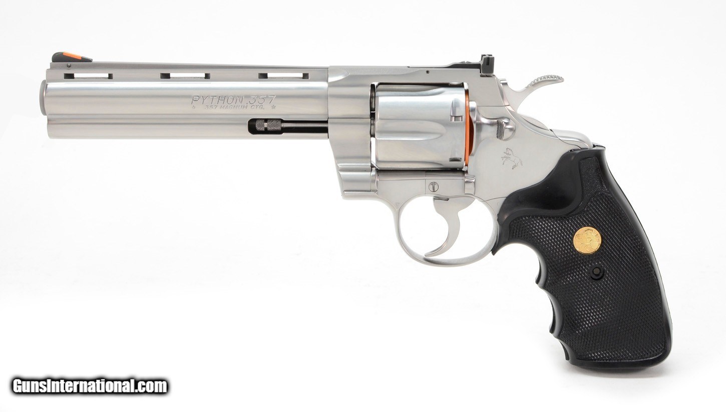Description: Colt Python .357 Mag. 6 Inch Satin Stainless. Like New Condition. DOM 1992 AVAILABLE FOR PURCHASE AT OUR ON-LINE STORE This Colt Python was thoroughly cleaned and lubricated by The Custom Shop, internally and externally, to Like New condition. The Colt Python is a .357 Magnum caliber revolver formerly manufactured by Colt's Manufacturing Company of Hartford, Connecticut. It is sometimes referred to as a "Combat Magnum".[1] It was first introduced in 1955. Now discontinued, the Colt Python was intended for the premium revolver market segment. Some firearm collectors and writers such as Jeff Cooper, Ian V. Hogg, Chuck Hawks, Leroy Thompson, Scott Wolber, Renee Smeets and Martin Dougherty have described the Python as the finest production revolver ever made.
