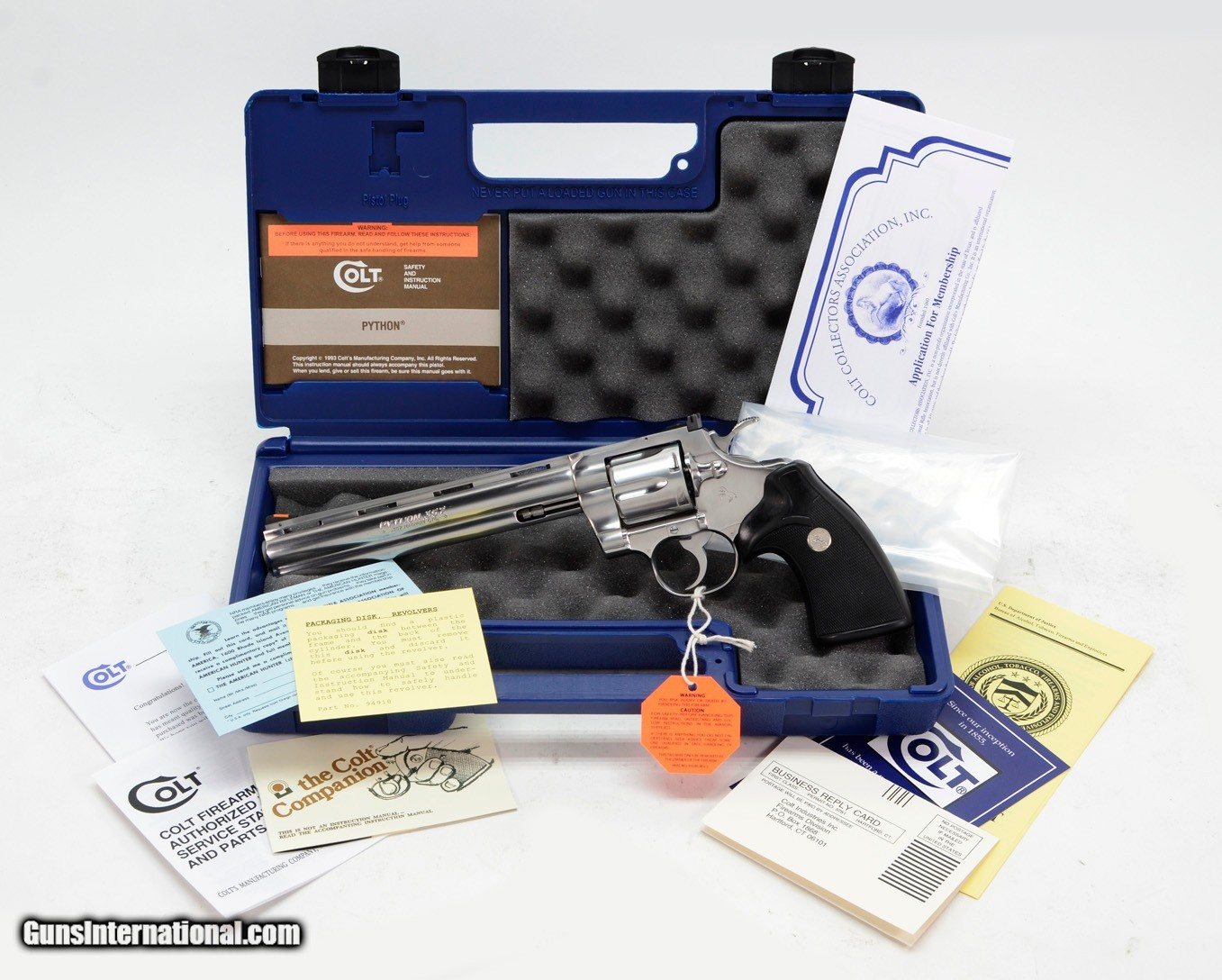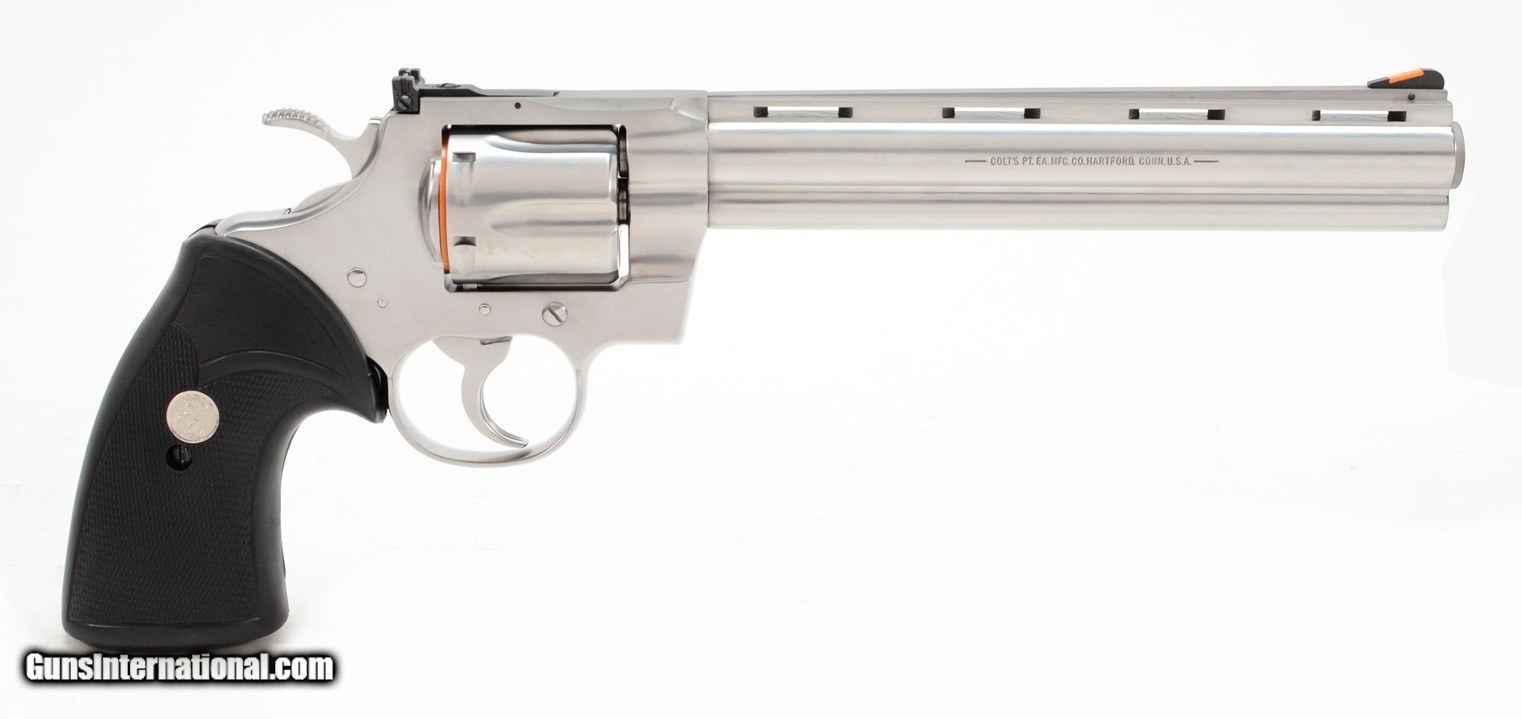 Description: Colt Python .357 Mag. 8 Inch Satin Stainless. Like New Condition. DOM 1995 AVAILABLE FOR PURCHASE AT OUR ON-LINE STORE This Colt Python was thoroughly cleaned and lubricated by The Custom Shop, internally and externally, to Like New condition. The Colt Python is a .357 Magnum caliber revolver formerly manufactured by Colt's Manufacturing Company of Hartford, Connecticut. It is sometimes referred to as a "Combat Magnum".[1] It was first introduced in 1955. Now discontinued, the Colt Python was intended for the premium revolver market segment. Some firearm collectors and writers such as Jeff Cooper, Ian V. Hogg, Chuck Hawks, Leroy Thompson, Scott Wolber, Renee Smeets and Martin Dougherty have described the Python as the finest production revolver ever made.