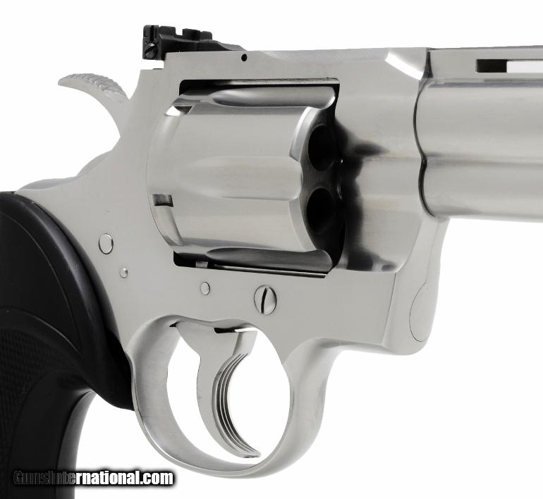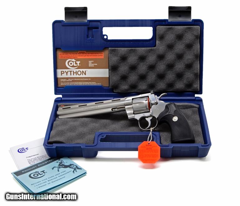 Description: Colt Python .357 Mag 8" Satin Stainless Steel Finish Like New In Blue Hard Case ' Features Ventilated Rib, Fast-Cocking Wide Spur Hammer & Full Shrouded Ejector Rod. Manufactured 1991. SPECIFICATIONS
