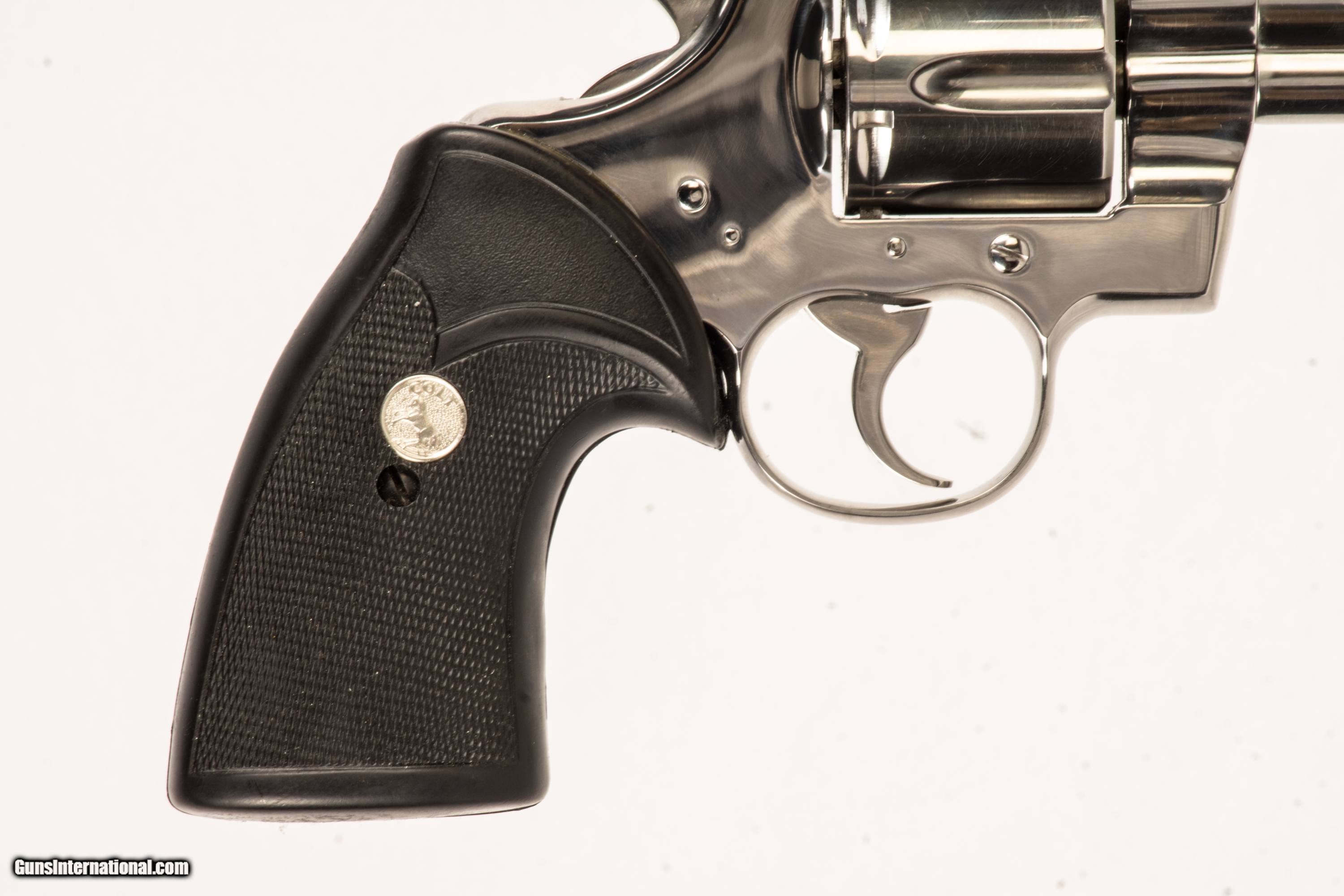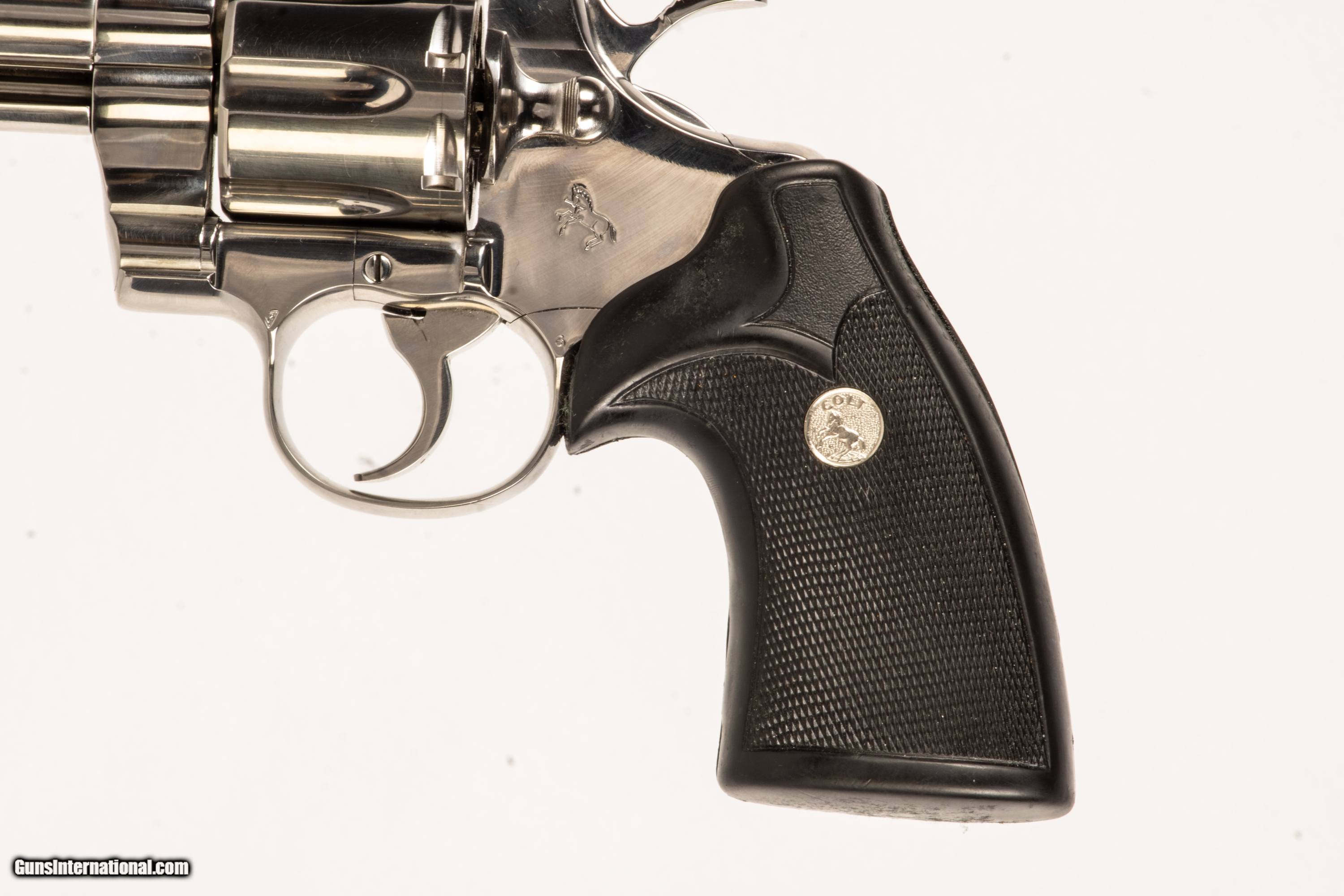 Description: Colt Python 357 chambered in 357 Mag with a 4 inch barrel bright & shiny bore original high polish stainless steel and original grips. This is a used firearm that is in excellent condition and is covered by Dury's Lifetime Warranty.