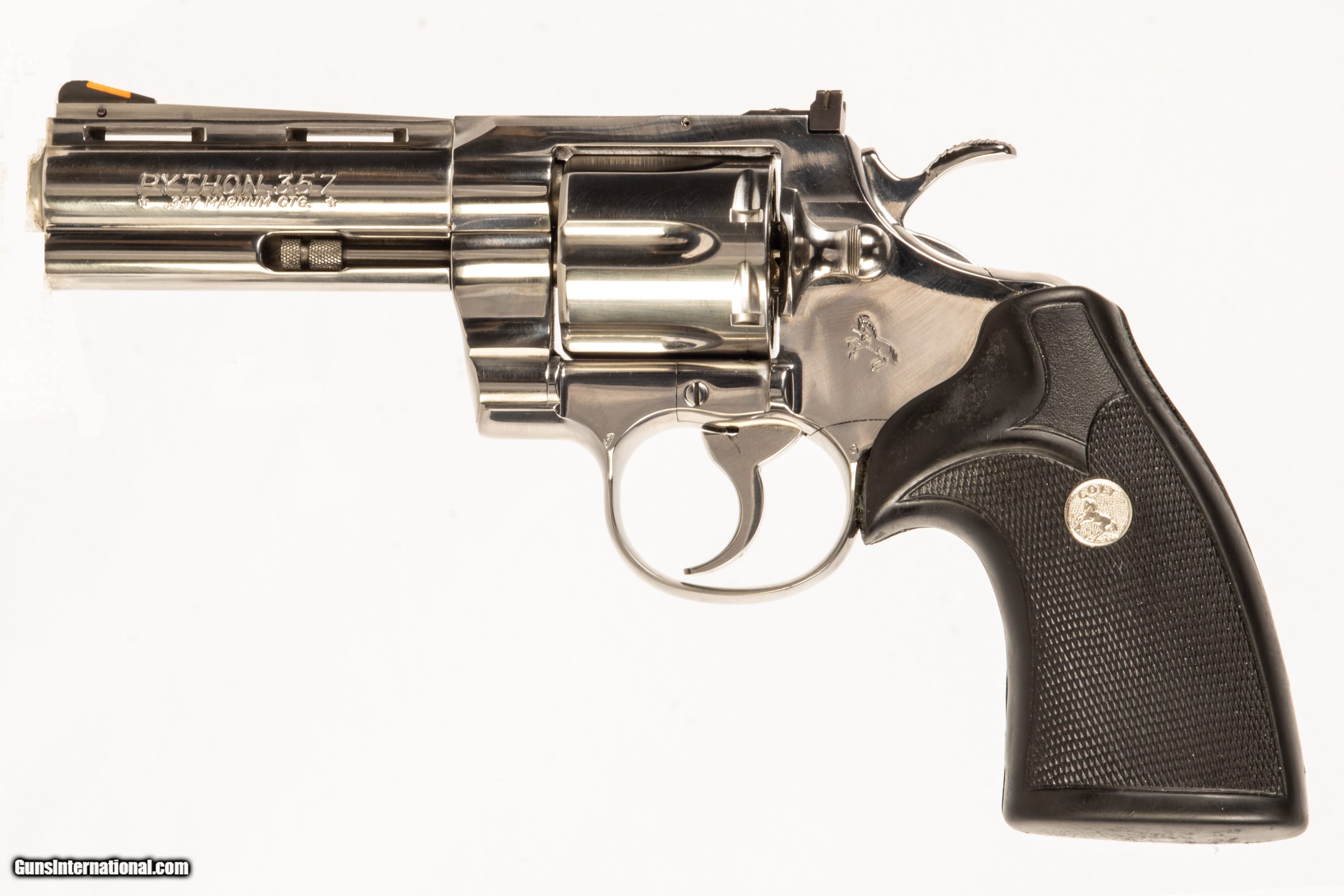 Colt Python 357 chambered in 357 Mag with a 4 inch barrel bright & shiny bore original high polish stainless steel and original grips. This is a used firearm that is in excellent condition and is covered by Dury's Lifetime Warranty.