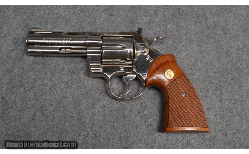 Description: This six-shot revolver is a Colt Python, chambered in .357 Magnum. It has a 4" nickel plated ribbedsteel barrel, factory iron sights, and naturally finished checkered grips with golden Colt medallion inlays. This Colt Python is in excellent condition .357 Magnum SOLD Chambers: Six-shot revolving cylinder. Metal Condition: Excellent. Wood Condition: Excellent. No signs of use or wear. Barrels: 4" nickel plated ribbed steel barrel. Triggers: Single metal trigger. Sights: Factory iron sights. Item Location: Wichita, KS |