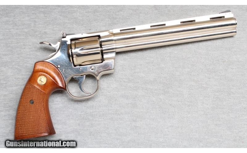 Description: Excellent condition, light wear and handling marks. Comes with factory letter, see photo. Classic Colt magnum revolver, nickel finish, 8" ribbed barrel with full underlug, adjustable sights, smooth double and single action trigger pulls and factory wood grips with Colt medallions. .357 Magnum SOLD Chambers: Revolver Metal Condition: Excellent Wood Condition: Grips are excellent Bore Condition: Bright Barrels: 8 Triggers: Double and single action Butt Pad: Wood grips Sights: Adjustable Item Location: La Vista, NE |