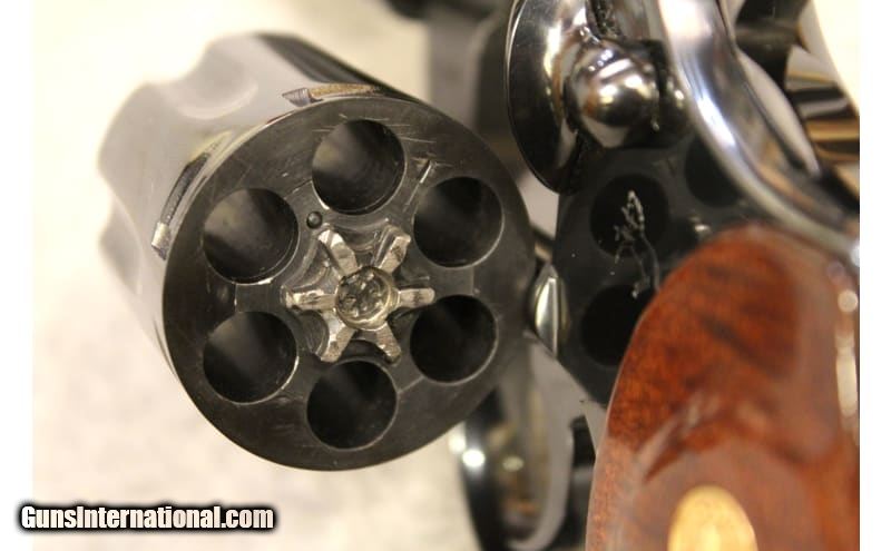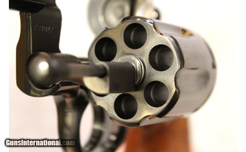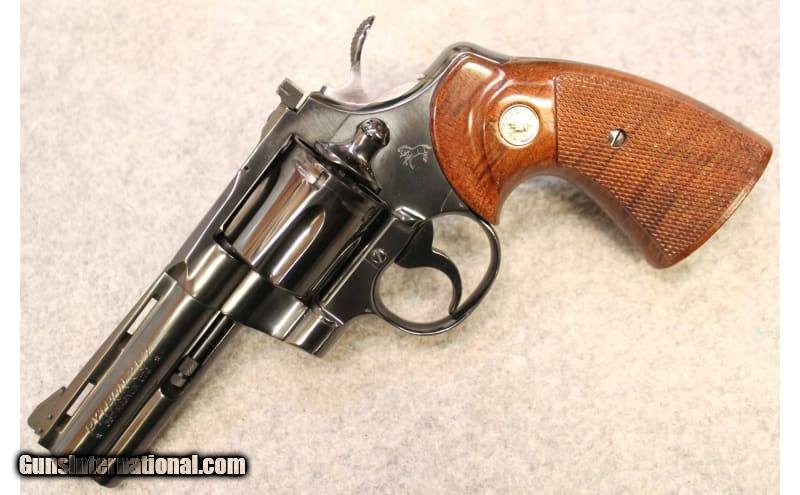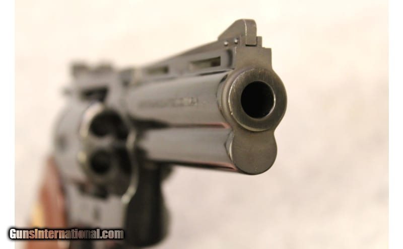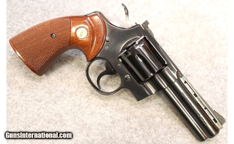 Description: This Colt Python chambered in .357 Mag features, blue finish, DA/SA trigger, vented ribbed barrel, adjustable rear sight, pinned front sight, and Colt wood checkered grips. The Python is great shape overall with tight cylinder lock up with cylinder ring. The biggest thing to notice with this python is the little nick on the muzzle. .357 Mag SOLD Metal Condition: Great Wood Condition: Great Bore Condition: Bright Barrels: 4 Weight: 2.3 lbs. Item Location: Hoffman Estates, IL |