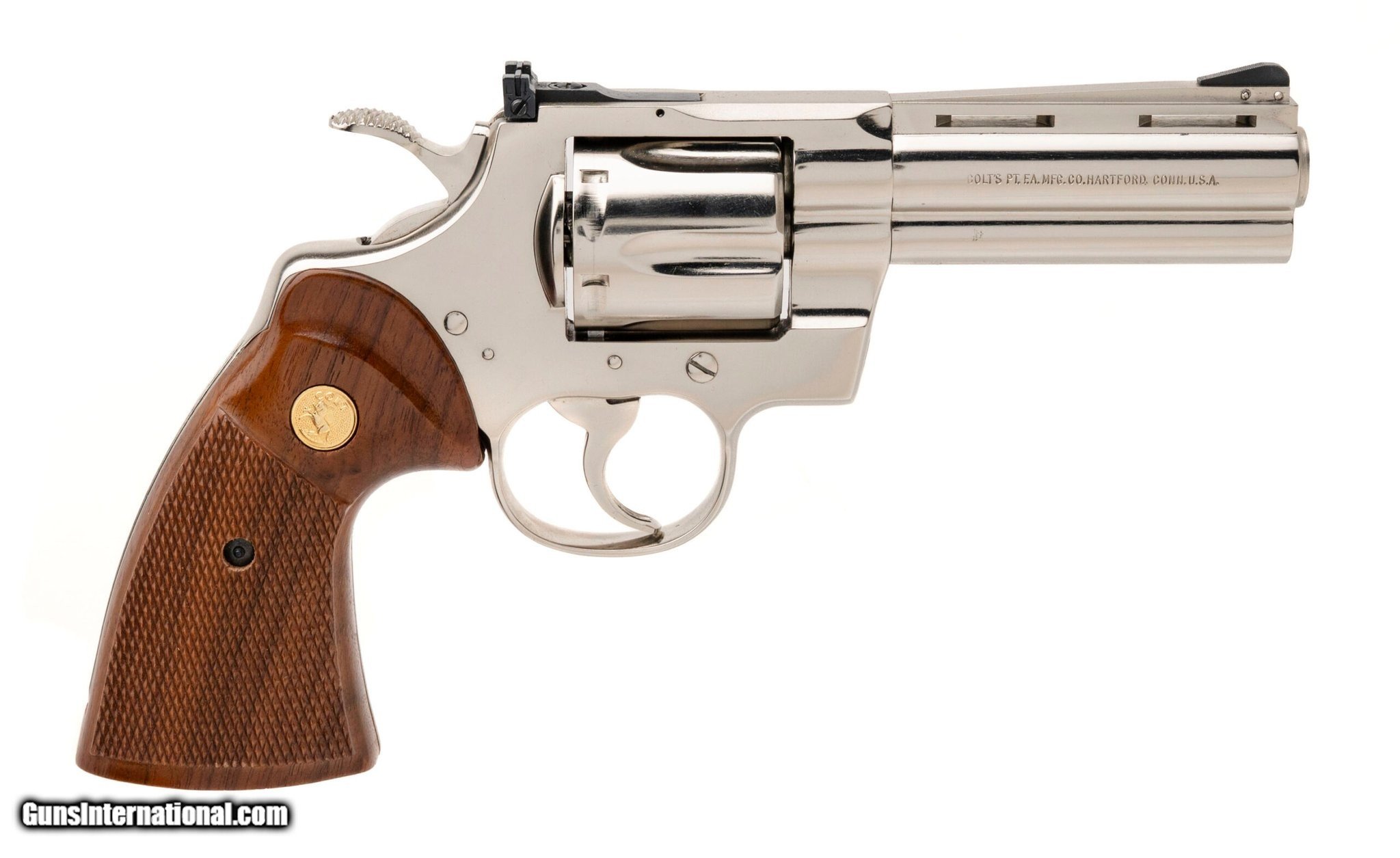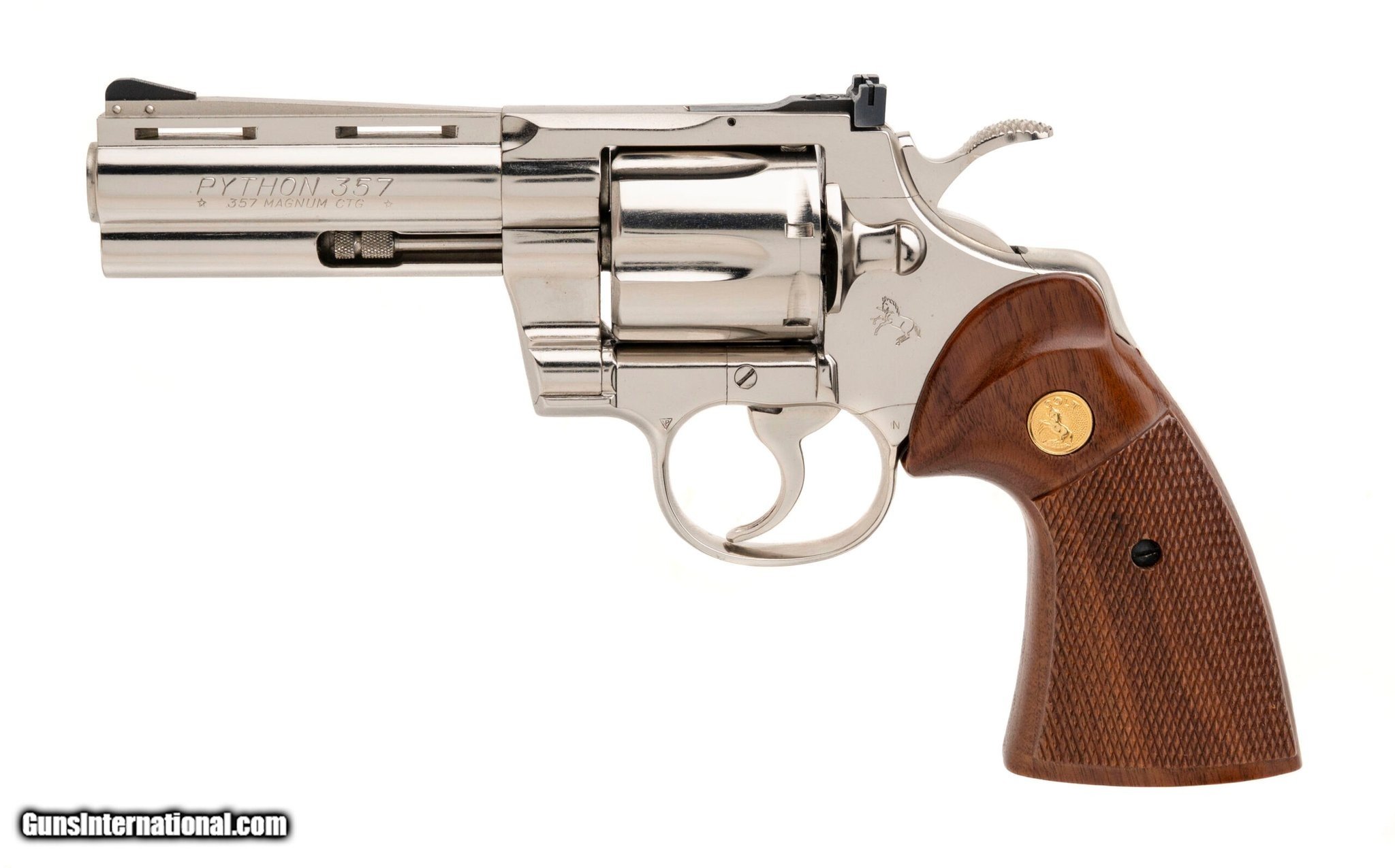 Description: Guns Listing ID: 555877 SN: V35110. Made in 1978, .357 Mag with a 4\" barrel. Nickel plated Snake Gun in excellent condition with original box. Looks unfired. (C20921) SOLD Manufacturer: COLT Model: PYTHON Caliber Info: .357 MAG Condition: Used - Non-Certified Barrels: 4" BARREL Action: REVOLVER Finish: nickel |