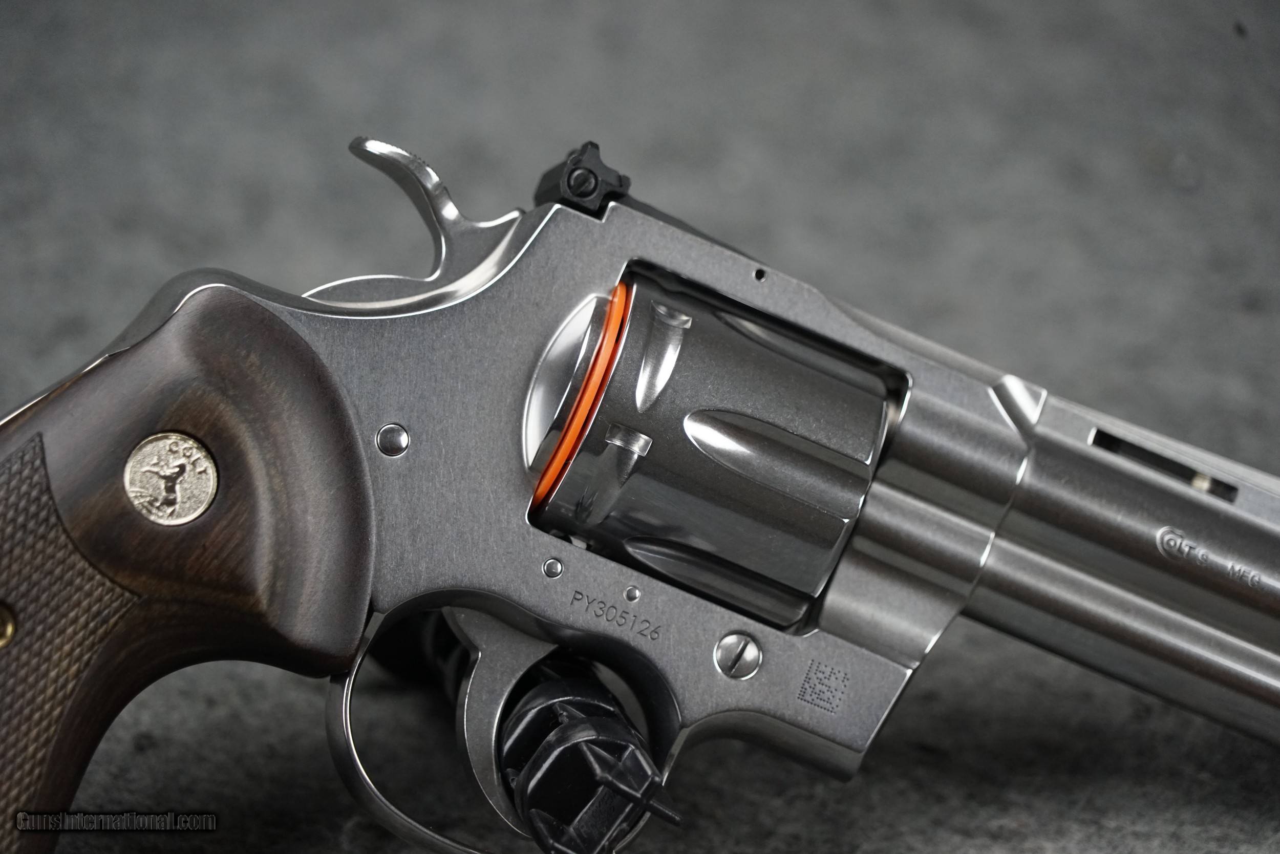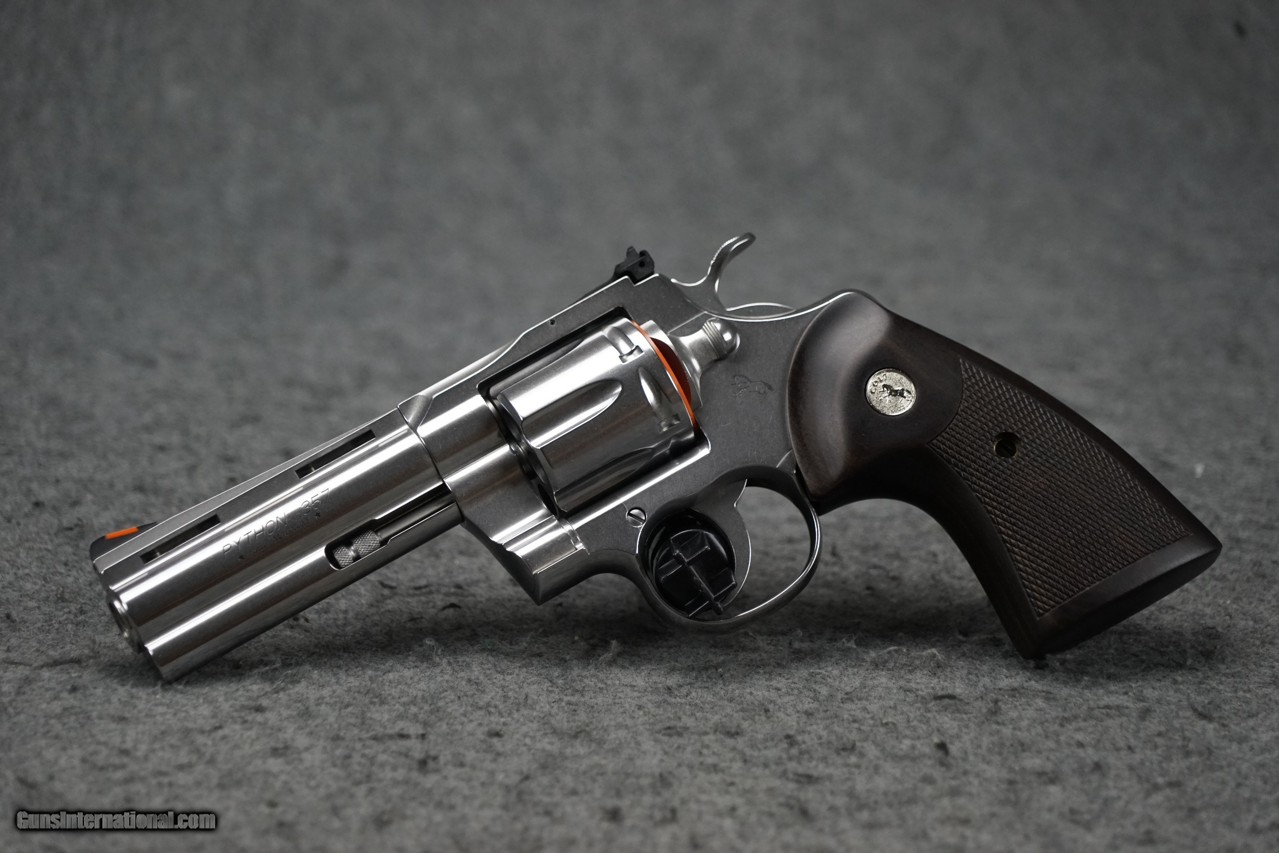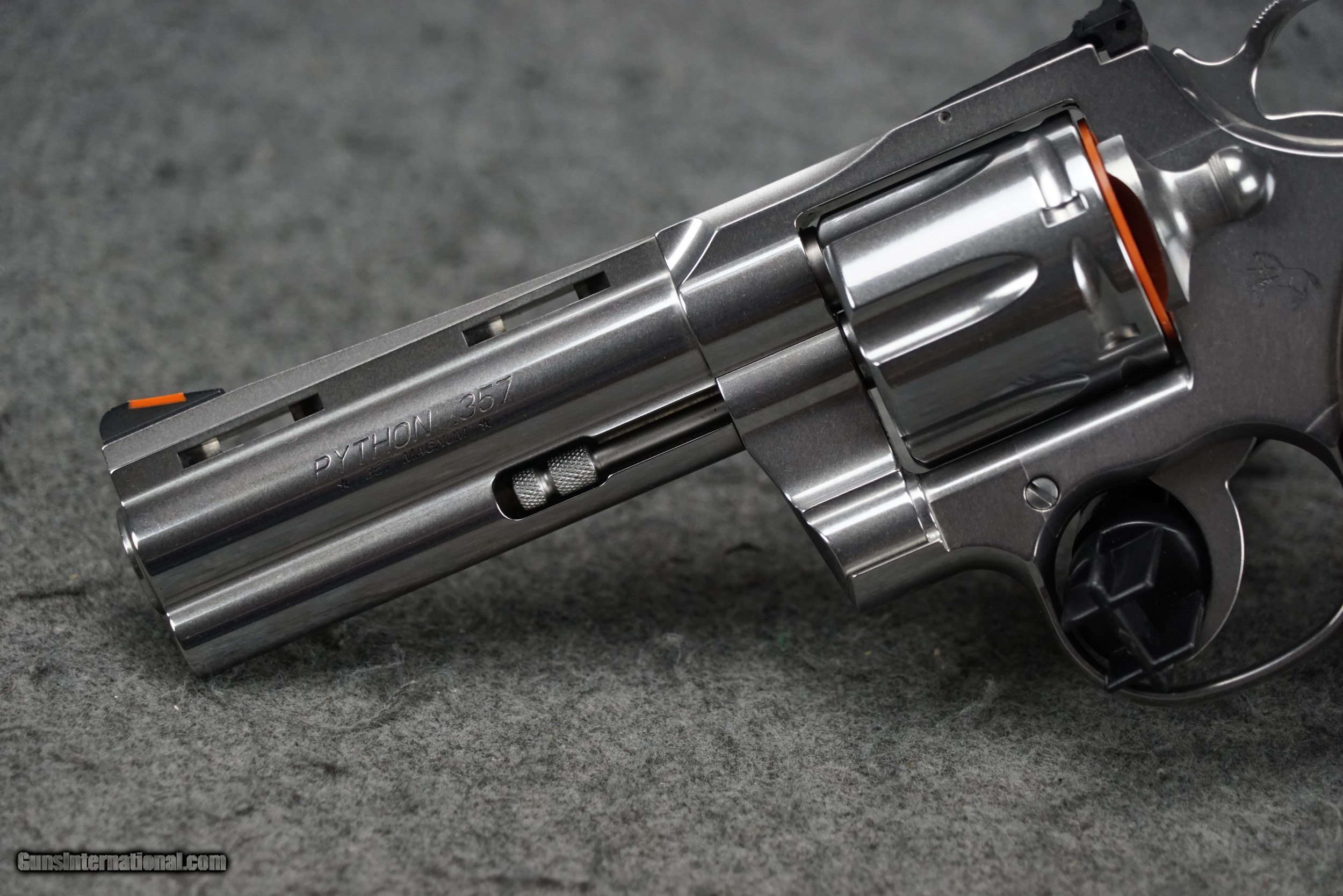 Description: MANUFACTURER: Colt FAMILY: Python Series MODEL: Python TYPE: Revolver ACTION: Double / Single Action CALIBER/GAUGE: 357 Magnum | 38 Special FINISH: Stainless Steel FINISH TYPE: Stainless Steel FRAME: Steel Frame STOCK/GRIPS: Walnut BARREL: 4.25" OVERALL LENGTH: 9.75" RATE-OF-TWIST: 1-in-14" CAPACITY: 6 SIGHTS: Red Ramp Front/Adjustable Rear SIGHT TYPE: Adjustable Sights WEIGHT: 42 oz. SHIPPING WEIGHT: 4.7 lbs. MFG MODEL NO: PYTHON-SP4WTS SOLD Handgun Caliber: .357 Magnum Manufacturer: Colt Model: Python Barrel Length: 4.25" Barrel Condition: BRAND NEW |