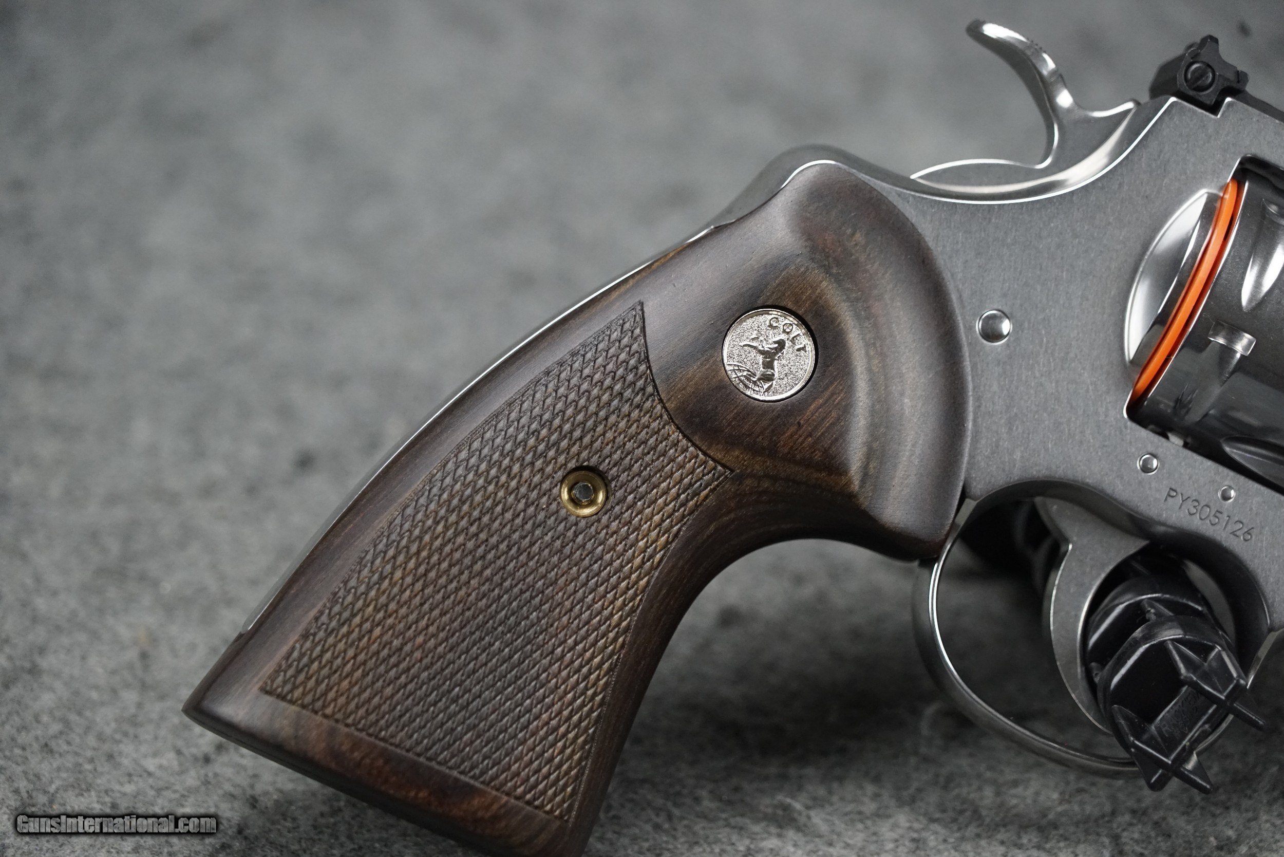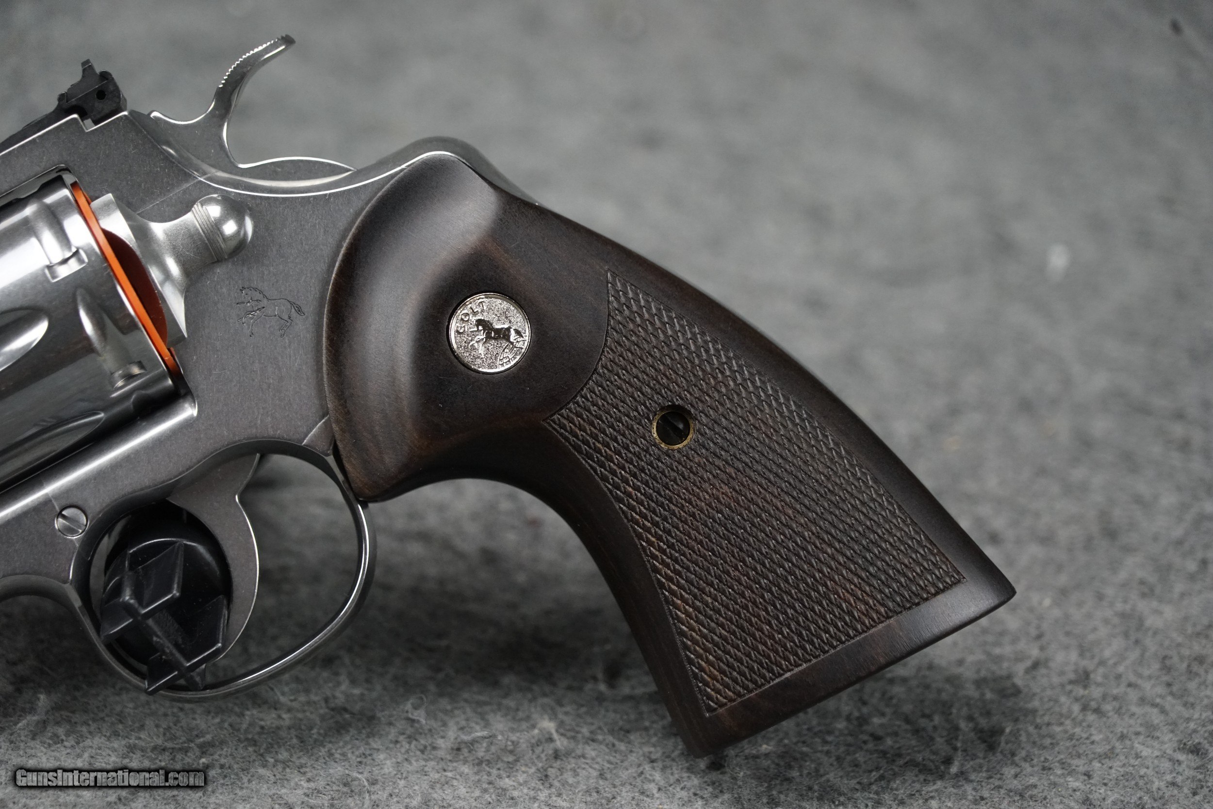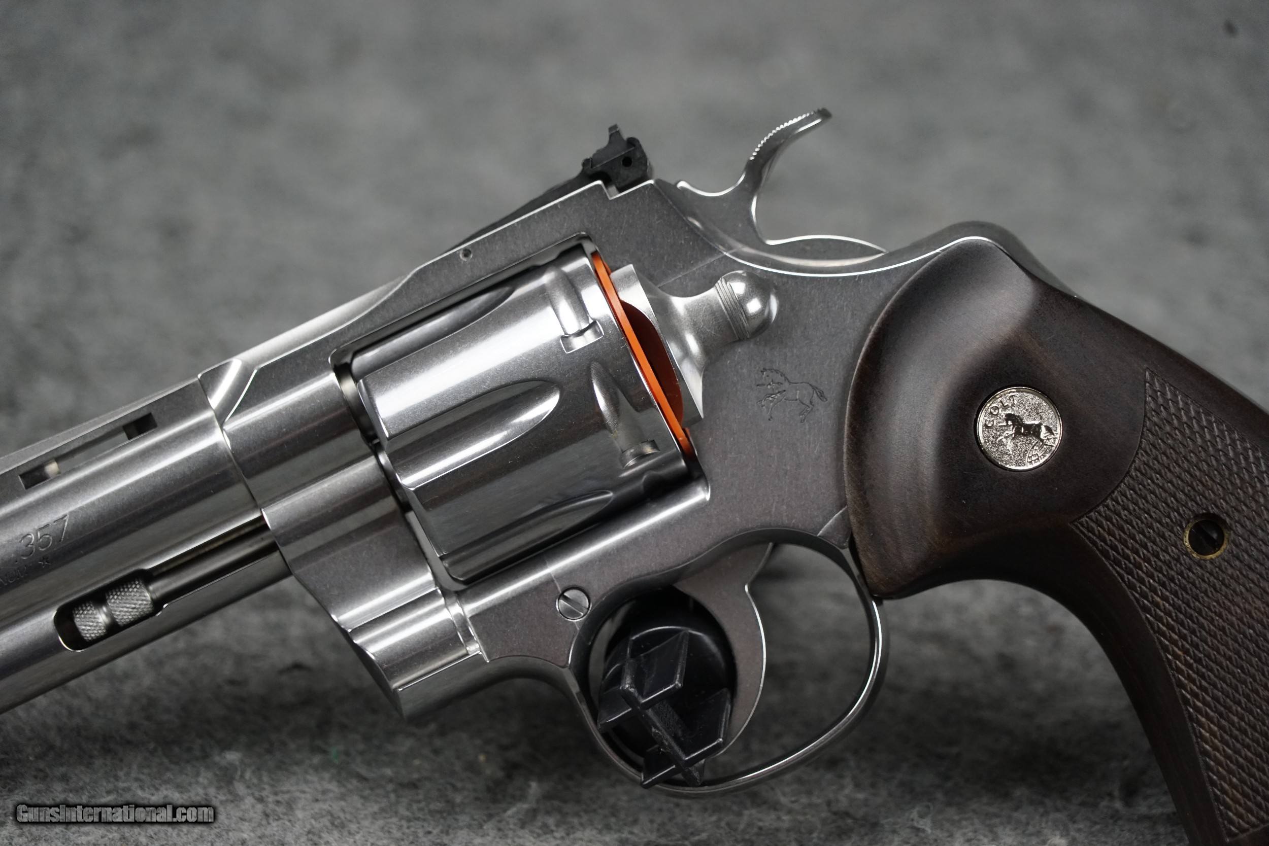Description: MANUFACTURER: Colt FAMILY: Python Series MODEL: Python TYPE: Revolver ACTION: Double / Single Action CALIBER/GAUGE: 357 Magnum | 38 Special FINISH: Stainless Steel FINISH TYPE: Stainless Steel FRAME: Steel Frame STOCK/GRIPS: Walnut BARREL: 4.25" OVERALL LENGTH: 9.75" RATE-OF-TWIST: 1-in-14" CAPACITY: 6 SIGHTS: Red Ramp Front/Adjustable Rear SIGHT TYPE: Adjustable Sights WEIGHT: 42 oz. SHIPPING WEIGHT: 4.7 lbs. MFG MODEL NO: PYTHON-SP4WTS SOLD Handgun Caliber: .357 Magnum Manufacturer: Colt Model: Python Barrel Length: 4.25" Barrel Condition: BRAND NEW |