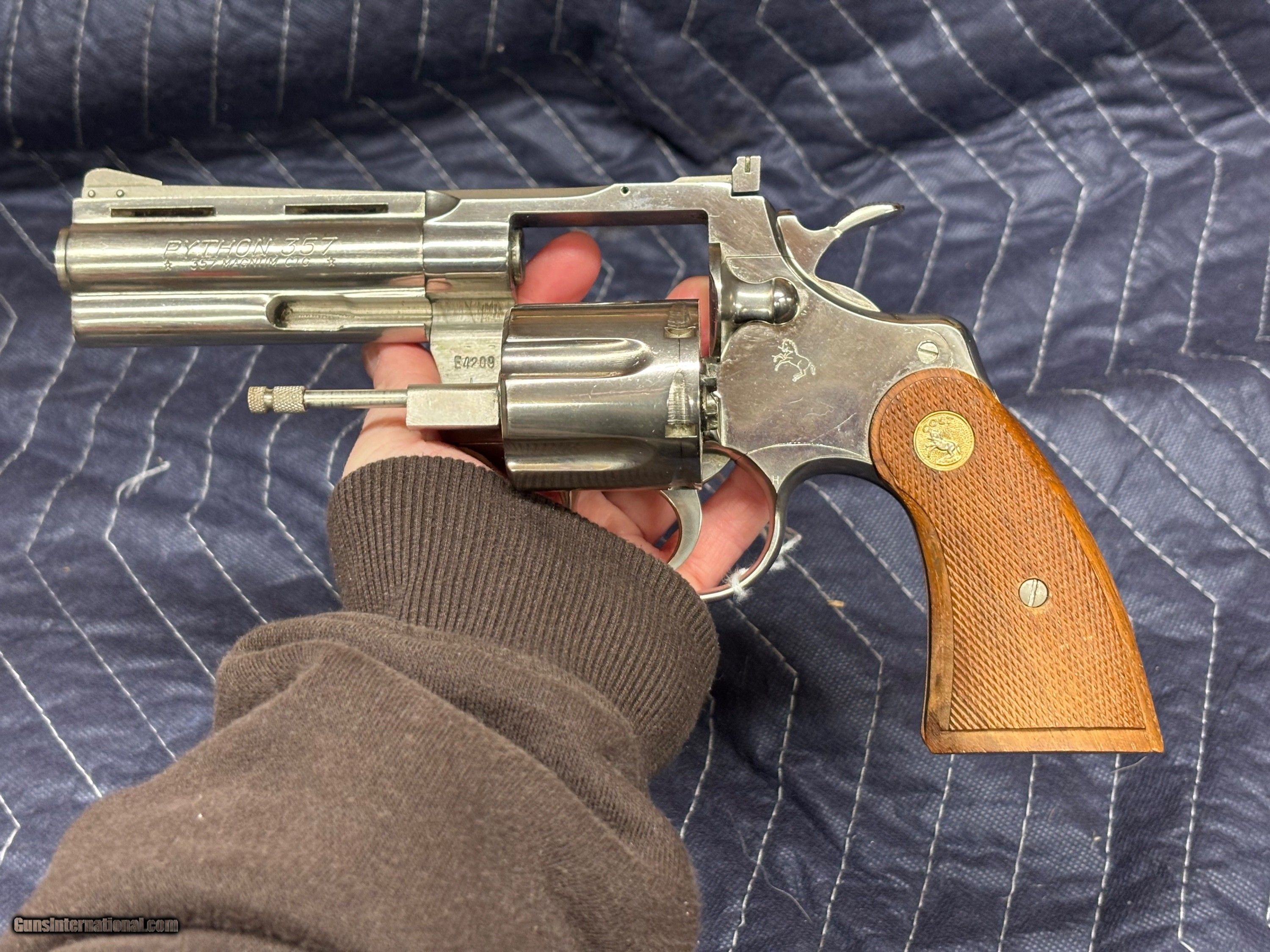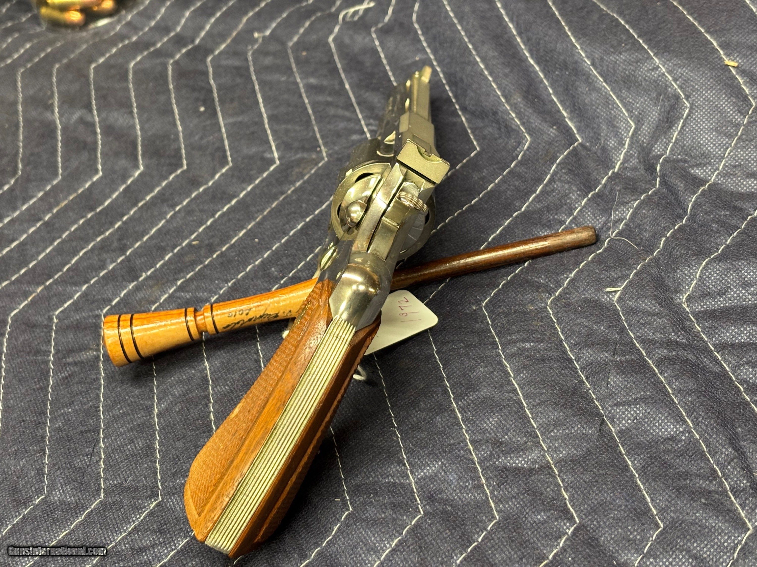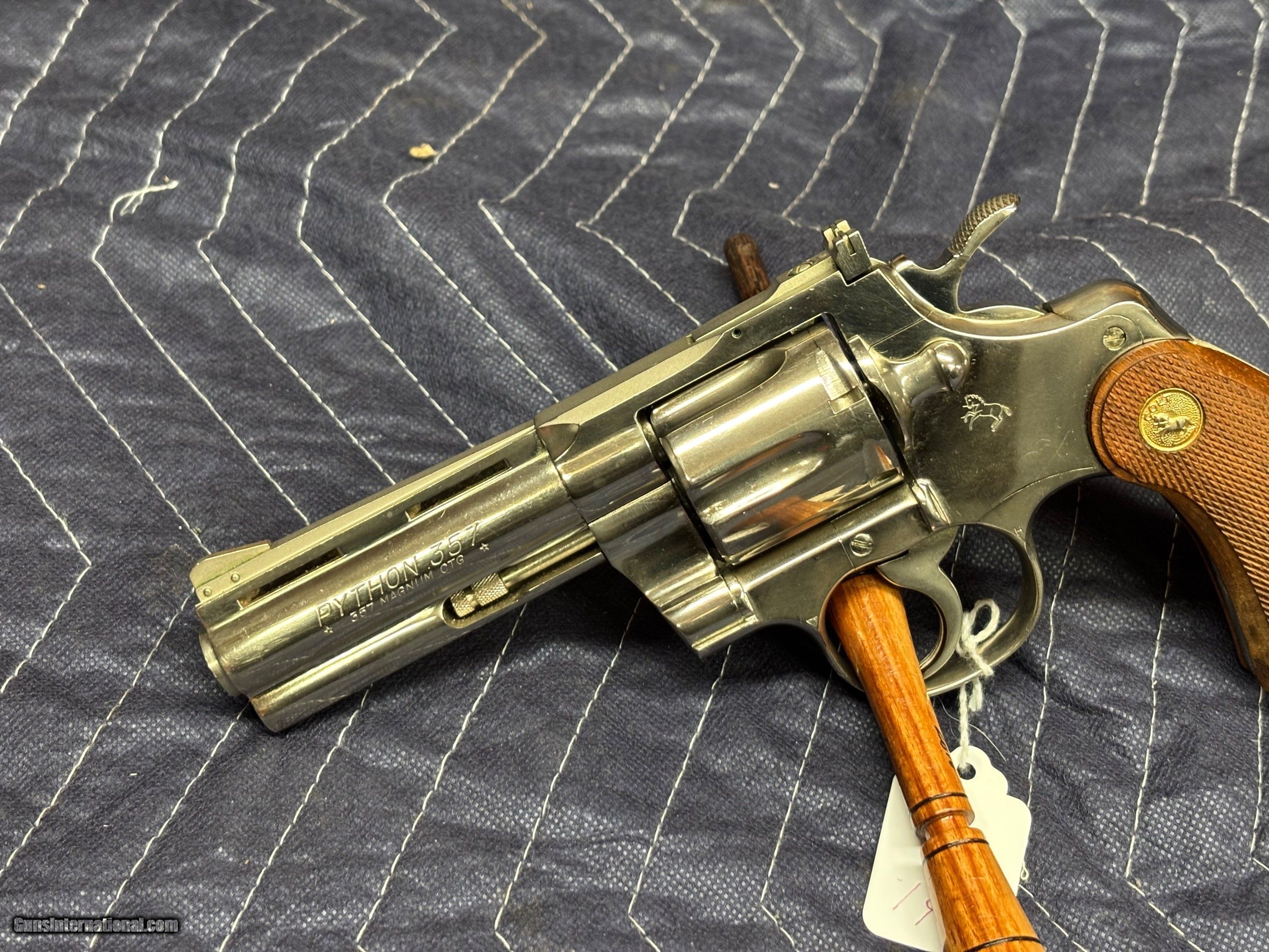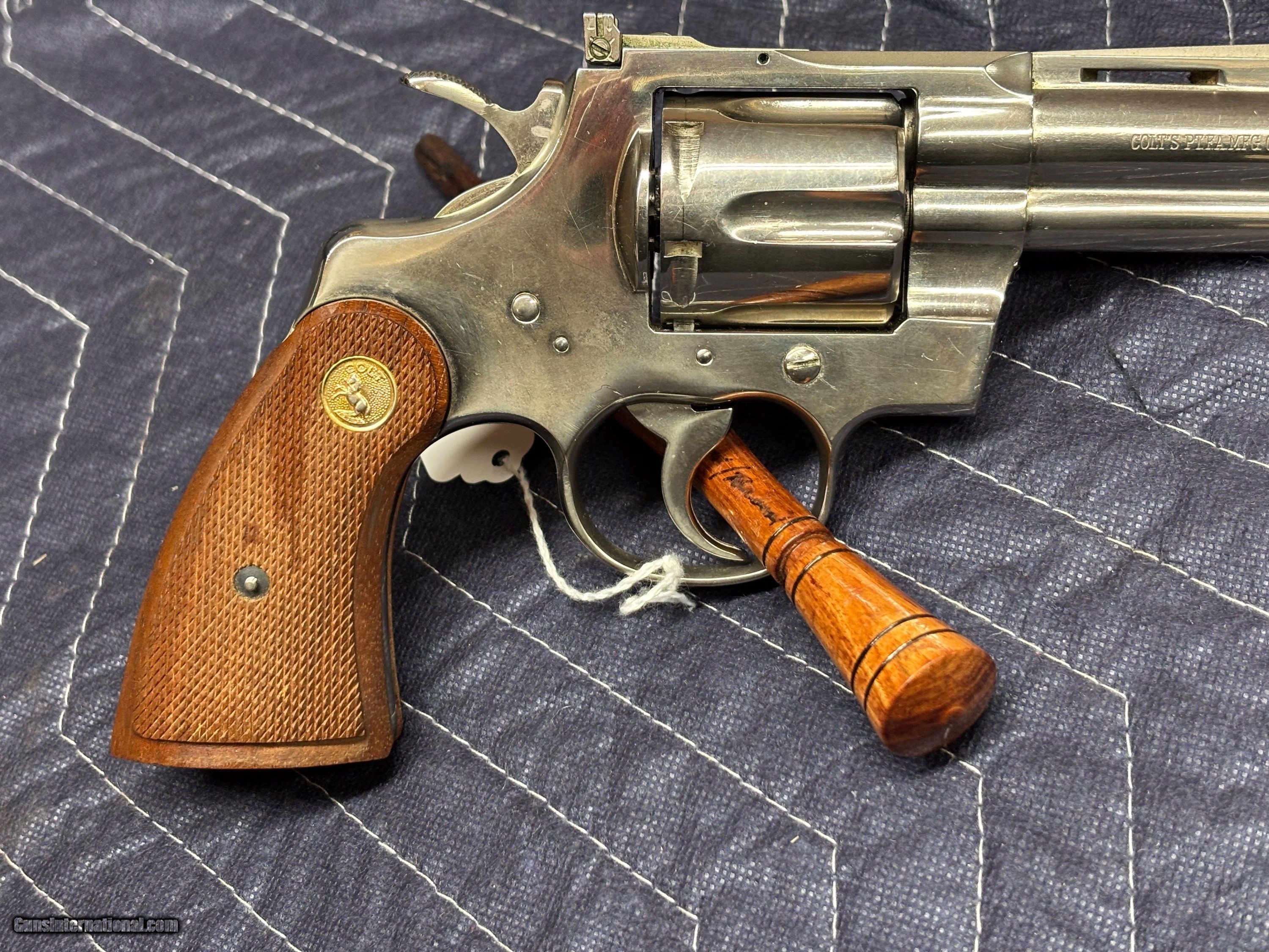 Description: Colt Python .357 Magnum Nickel….4 inch barrel Born in 1972. Very faint drag line. She is smooth and tight. We wiped the nickel some,..will clean very nicely. $2945.00 $45.00 to ship and insure If you are WEST of the Mississippi shipping will be $10.00 extra Thank you for looking at our items. If it is listed on the site and not marked "Sale Pending" or "Sold ", we still have it in the shop. If you wish to buy, hit buy it now and call the shop to pay. We are open Monday thru Friday 10:00am-3:00pm EST ...........Ask for Bree....... (803) 874-1060. NO SALES TO CALIFORNIA THERE IS A 3.5% CARD FEE. NO INTERNATIONAL SALES Handgun Caliber: .357 Magnum Price: $2,495.00 Buy Now Contact Seller |