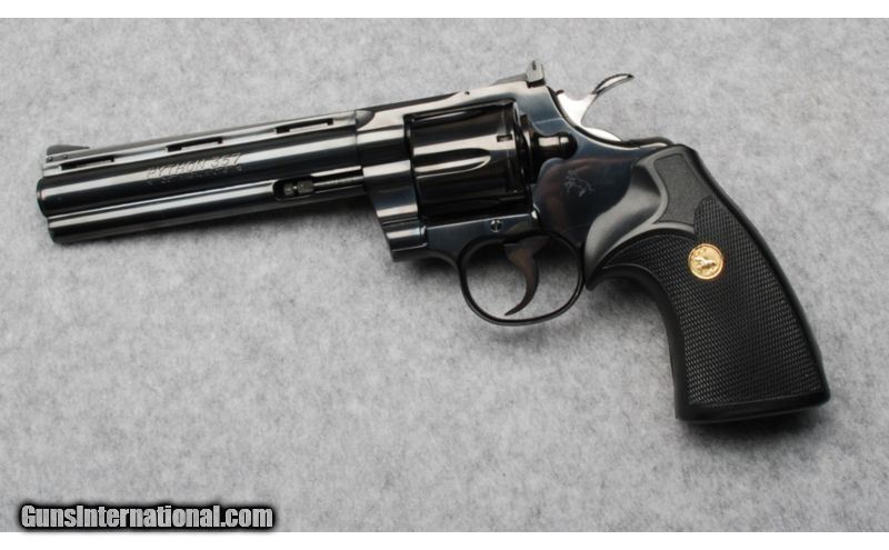 Description: SOLD Caliber Info: .357 Magnum Metal Condition: Very good with a couple of light handling marks, some holster wear through the bluing on the muzzle Bore Condition: Bright with good rifling Barrels: 6 Stock: Black checkered rubber grips with Colt medallions Weight: 3 1/8lb Sights: Front ramp with an adjustable rear sight Item Location: East Hartford, CT |