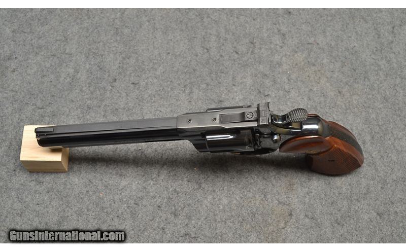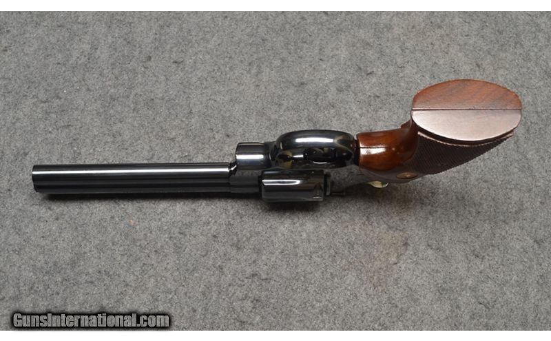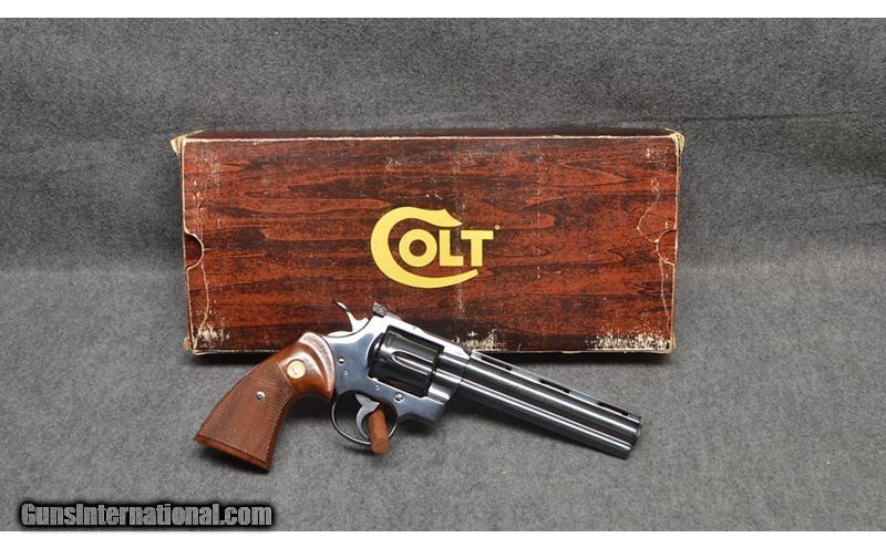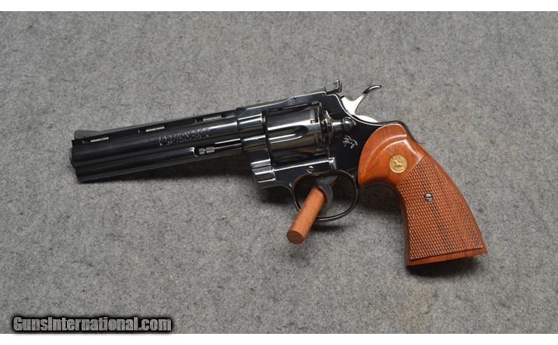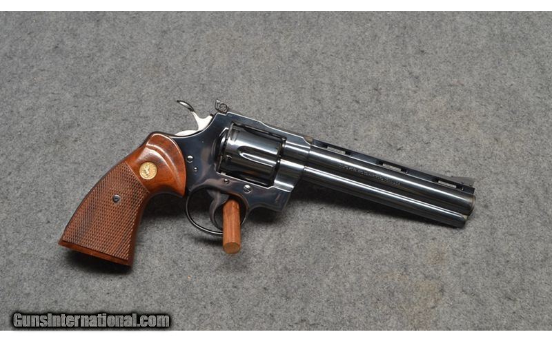 Description: This revolver is a Colt Python chambered in .357 Magnum. It has a black ramp front sight, checkered wooden grips, and white lined rear sight. This firearm is in excellent condition, with some minor cosmetic scratches on the steel. It comes with the original box. Colt's serial number search states that this firearm was made in 1982. .357 Mag SOLD Metal Condition: "Good, some cosmetic scratches Wood Condition: "Excellent, some minor scuffs near the butt Bore Condition: "Bright and shiny, with very crisp rifling Barrels: 6" High polish blue Fore End: Checkered wooden grips Weight: 3lbs Sights: "Ramp front sight, white lined rear sight Item Location: Wichita, KS |