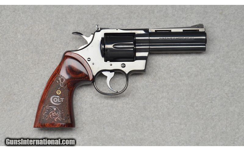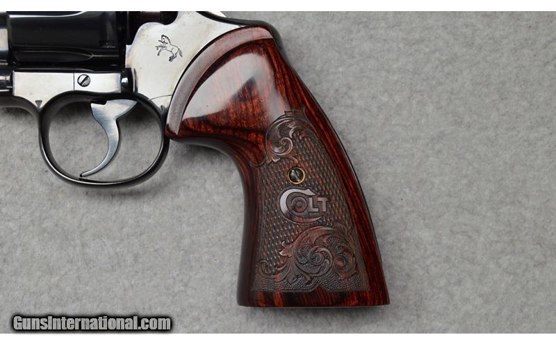 Description: Colt Python Chambered in .357 magnum is in excellent condition with small handling marks. It has a small mark on the front right of the barrel and a line on the top lip of the left side of the wooden grip. The Grip is a Colt factory grip but not original to the gun. It has a beautiful floral engraving with a checkered pattern in the middle and the Colt name in the checkered pattern on both sides of the grip. It includes a reproduction cardboard wood grain box. It was manufactured in 1979 and the Serial number is V58432 .357 Magnum SOLD Metal Condition: Excellent condition with small handling marks Wood Condition: Excellent condition with small handling marks Bore Condition: Clean and shiny with strong rifling Barrels: 4 Butt Pad: Wooden grip with elegant engravings Weight: 2LBS 9OZ Item Location: Fort Worth, TX |
