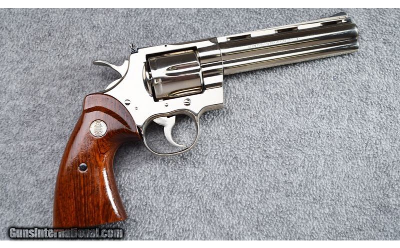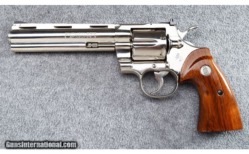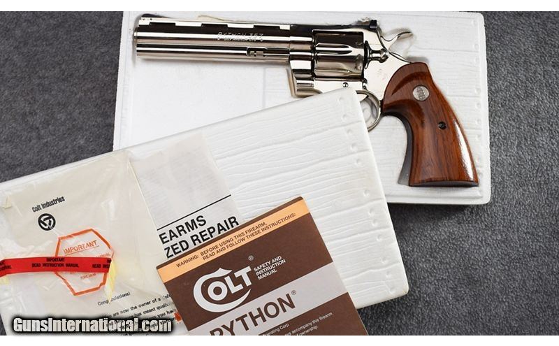 Description: This Nickel Python is excellent throughout and appears unfired. Complete with original box and paperwork. Box has been taped, styrofoam is intact and excellent! Beautiful gun! .357 Magnum SOLD Metal Condition: Excellent Wood Condition: Excellent Bore Condition: Excellent Barrels: 6" Vent Rib Triggers: Factory Butt Pad: Uncheckered Walnut Grips with "Custom Colt" Medallion Weight: 46 oz. Sights: Blade Front - Adjustable Square Notch Rear Item Location: Wheeling |