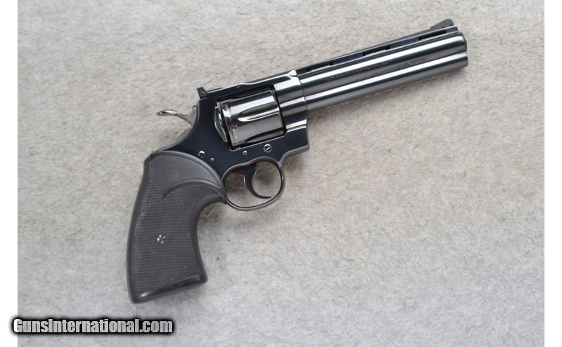 Description: This Colt Model Python is a 6 shot double action revolver in .357 Magnum Cal. It has a 6 inch ventilated rib barrel. A blade front sight and an adjustable notch rear sight. The grip is a diamond checkered black rubber. The trigger is grooved. .357 Magnum SOLD Chambers: 6 shot. Metal Condition: Very Good. Hammer has some light rust spots. Surface blemish right side behind the trigger. Bore Condition: Excellent. Barrels: 6 inch barrel with a ventilated rib. Triggers: Double Action. Weight: 48 oz. Sights: Blade front. Adjustable notch rear. Item Location: Richfield, WI |